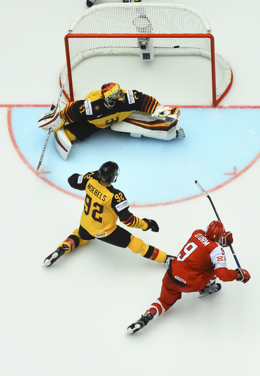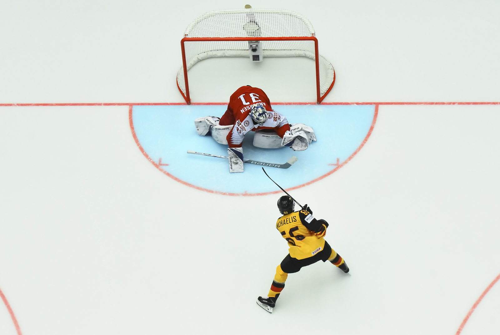 Nicklas Jensen had a glorious opportunity to re-establish a lead. Credit to Peter Regin who did the hard work in taking on three German defenders behind the net to win the puck and get a pass to Jensen who was alone in front but was stonewalled by Pielmeier.