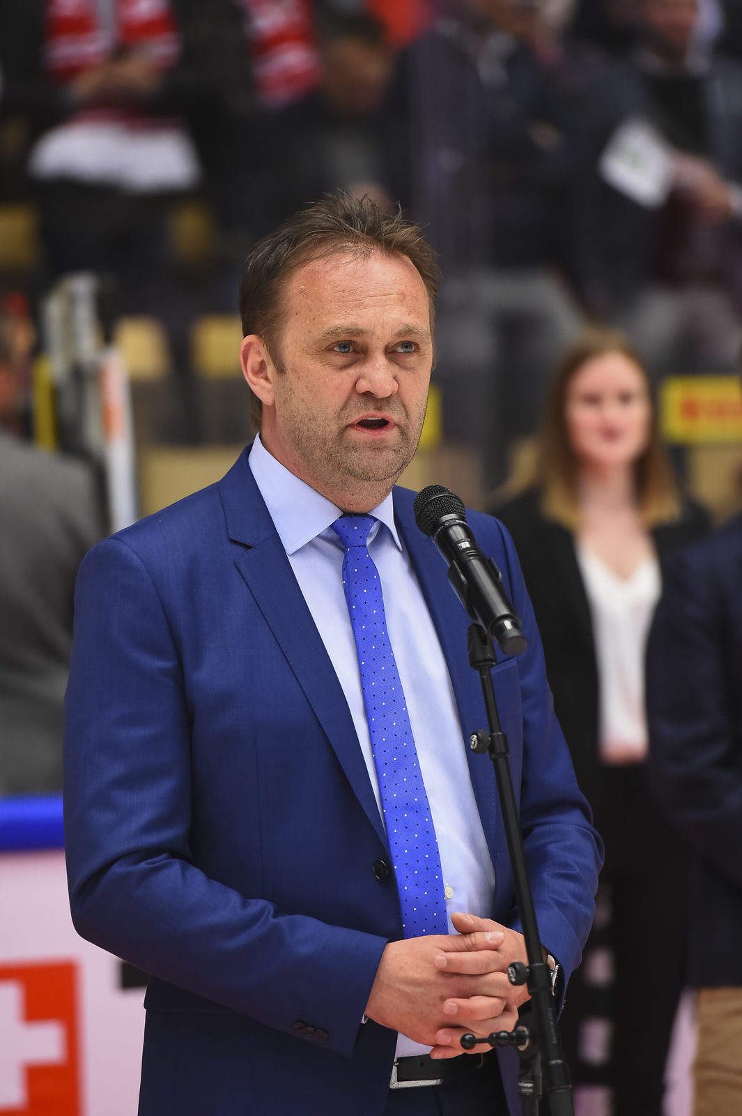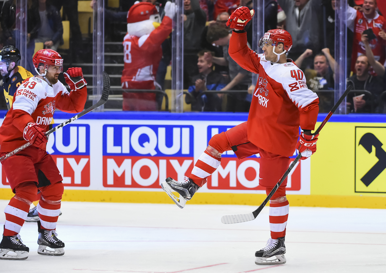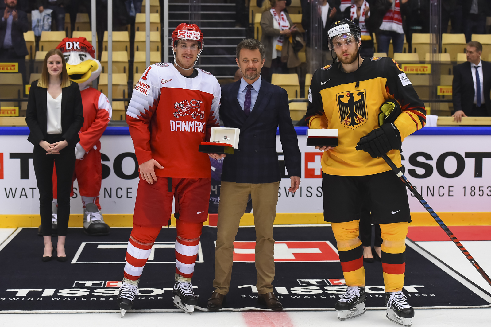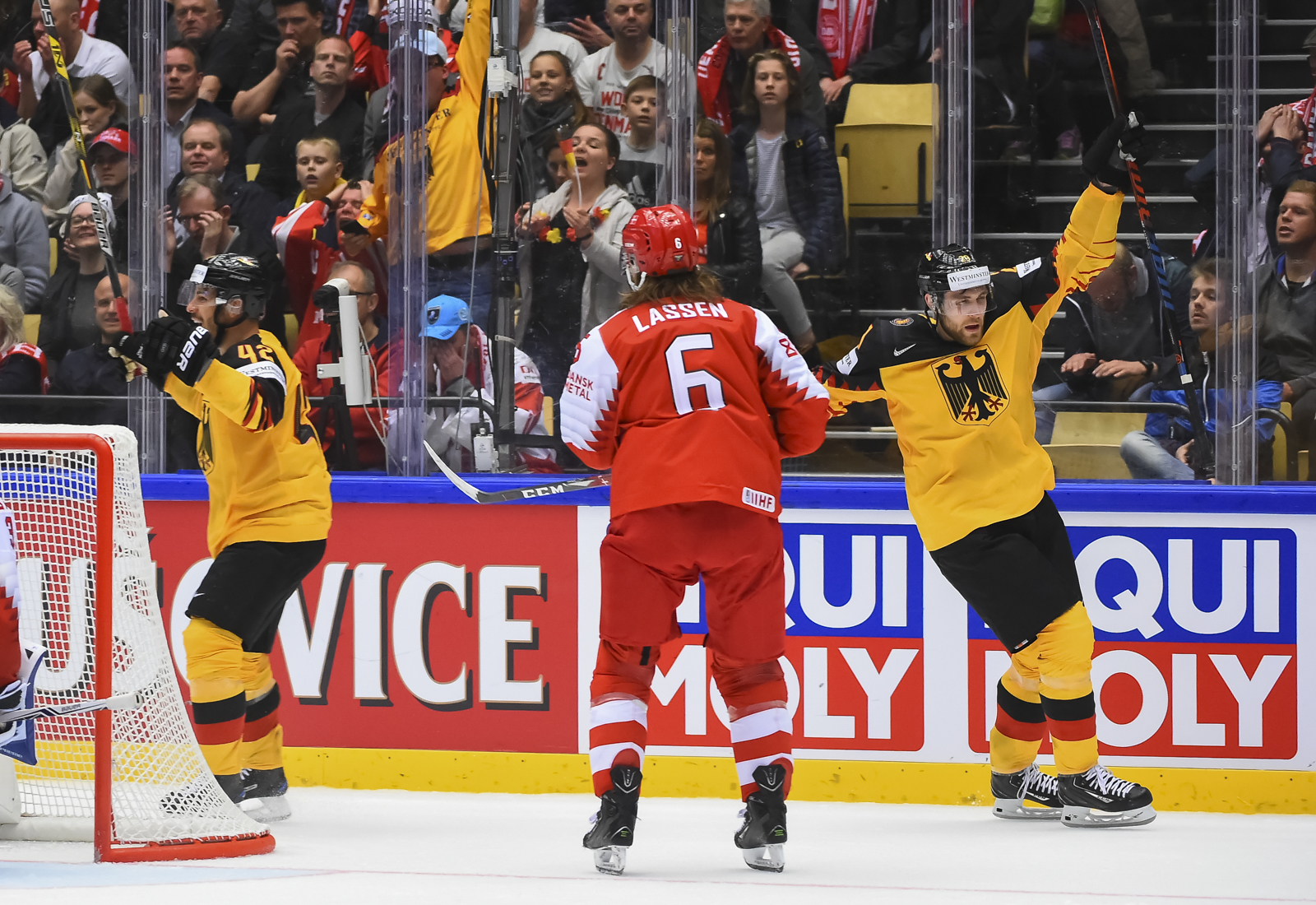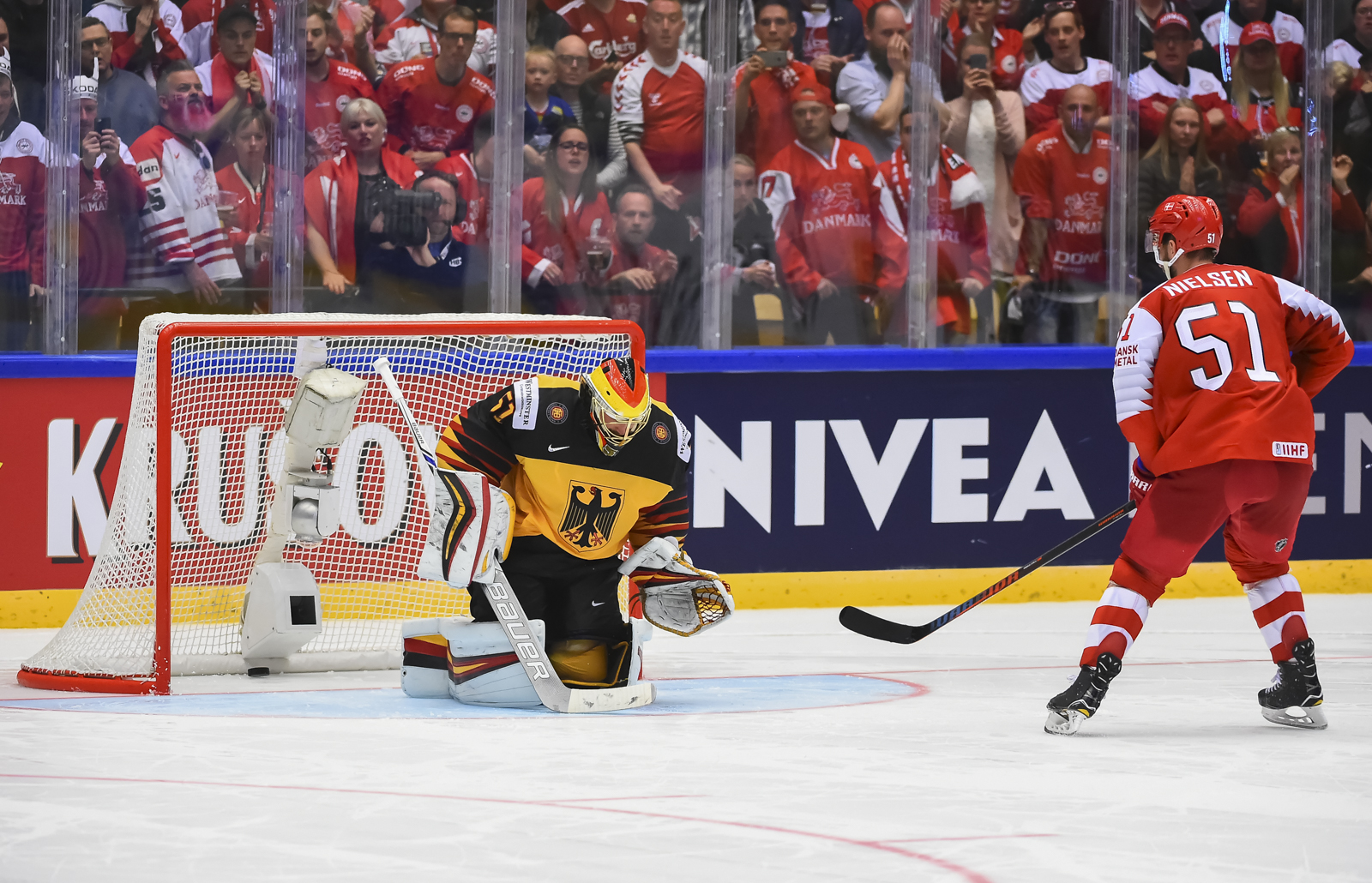 But with twenty seconds remaining in the penalty, Jesper Jensen scored. Jensen’s goal was scored from the faceoff circle to the left of the German net. With that, the decidedly Danish crowd was more excited than at the first drop of the puck.