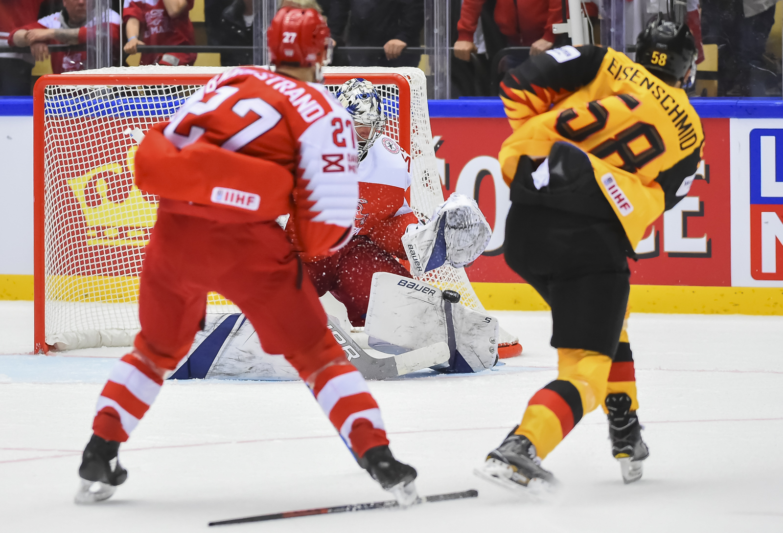 Yannic Seidenberg was whistled off for hooking, giving Denmark its first power play of the game. Denmark moved the puck looking to develop a quality chance. Patrick Bjorkstrand beat a defender in the offensive zone and broke in alone but his eventual shot sailed wide right. A great play by Bjorkstrand that was only missing the finish.