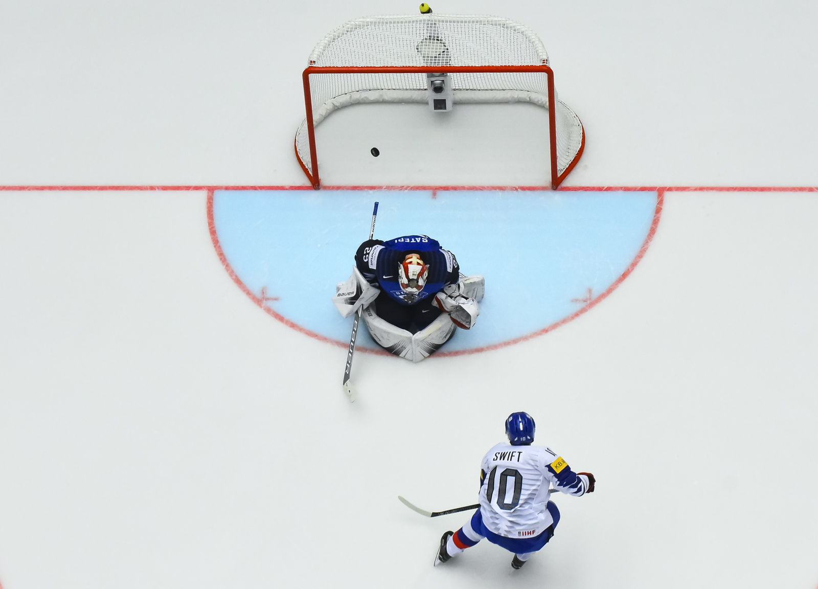 Korea scored its historic first ever top-level World Championship goal thanks to two great plays from Canadian-born players. Brock Radunske made a nifty pokecheck in the Korea end and Swift got the puck. Swift fled up ice all alone. Like Aho in the first, he fired a shot between the goalie’s pads at 13:00 to make it a 4-1 game.