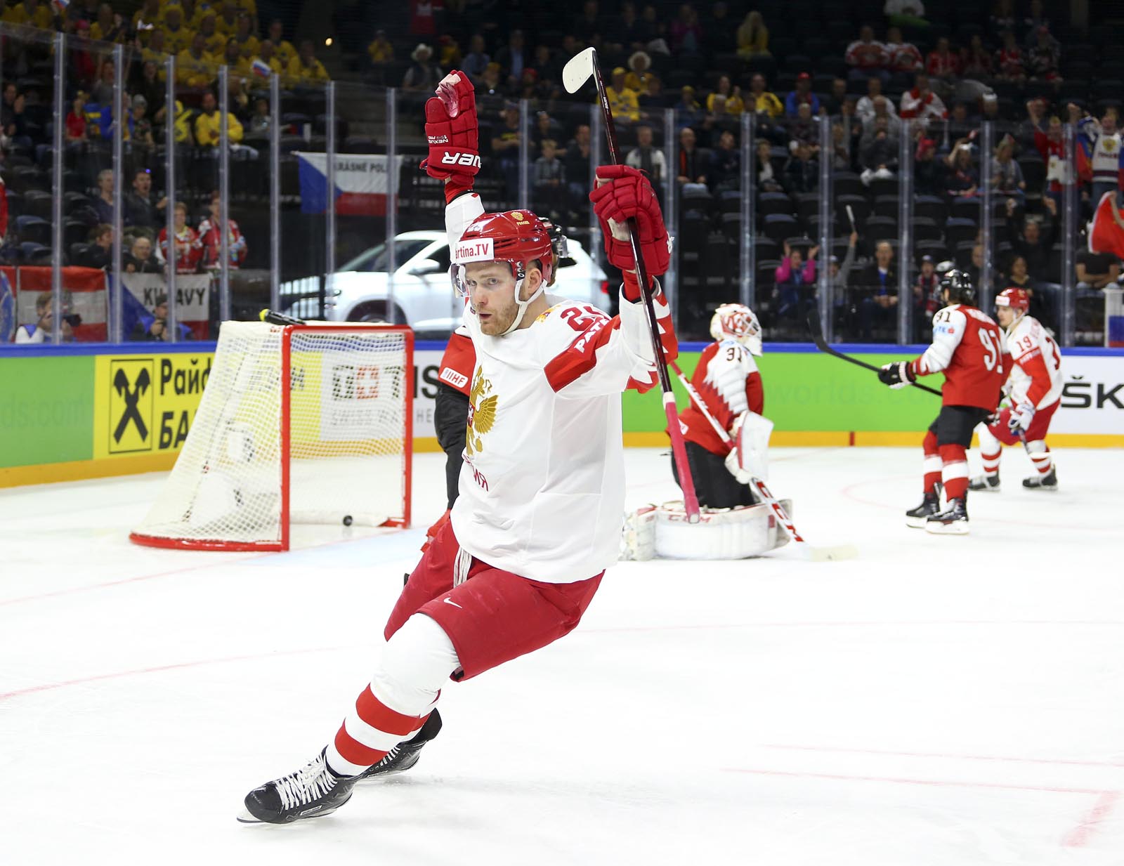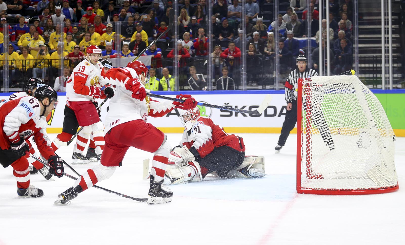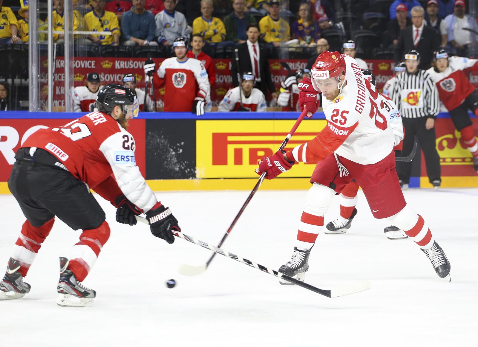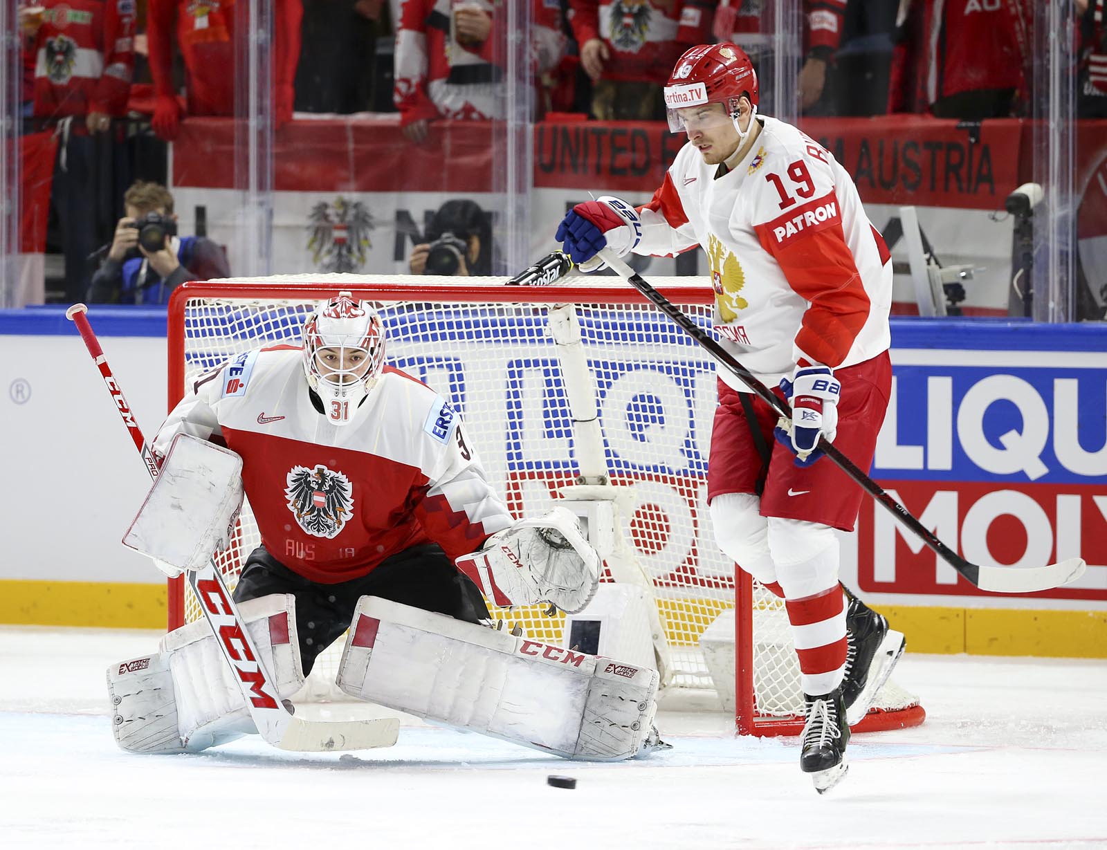 Against the French, Russia opened the scoring midway through the opening frame and quickly jumped into a 3-0 lead. Here, recent history repeated itself. Anisimov, one of just two players to skate for Russia when the countries last met in 2013, soon added a second when he gobbled up the rebound after Pavel Buchnevich got up close with Madlener. Now the Russians could relax into their natural game: a fine passage of tic-tac-toe drew an appreciative reaction from the FHR’s vice-president Roman Rotenberg as the bemused Austrians looked on.