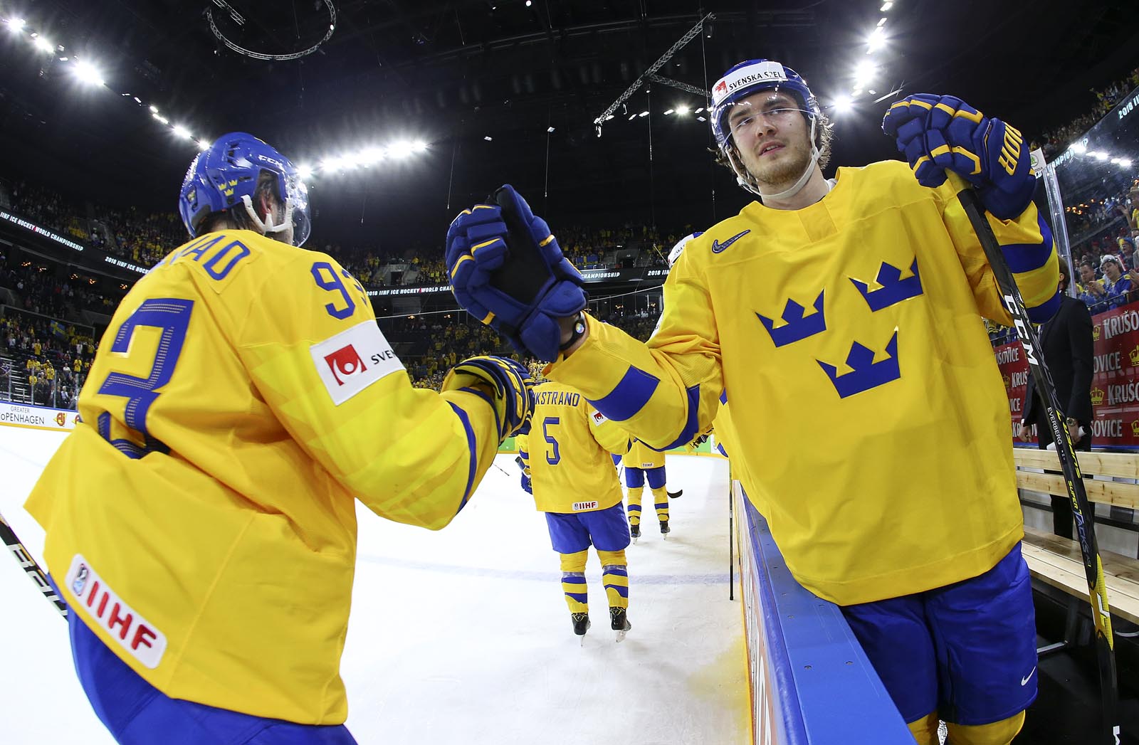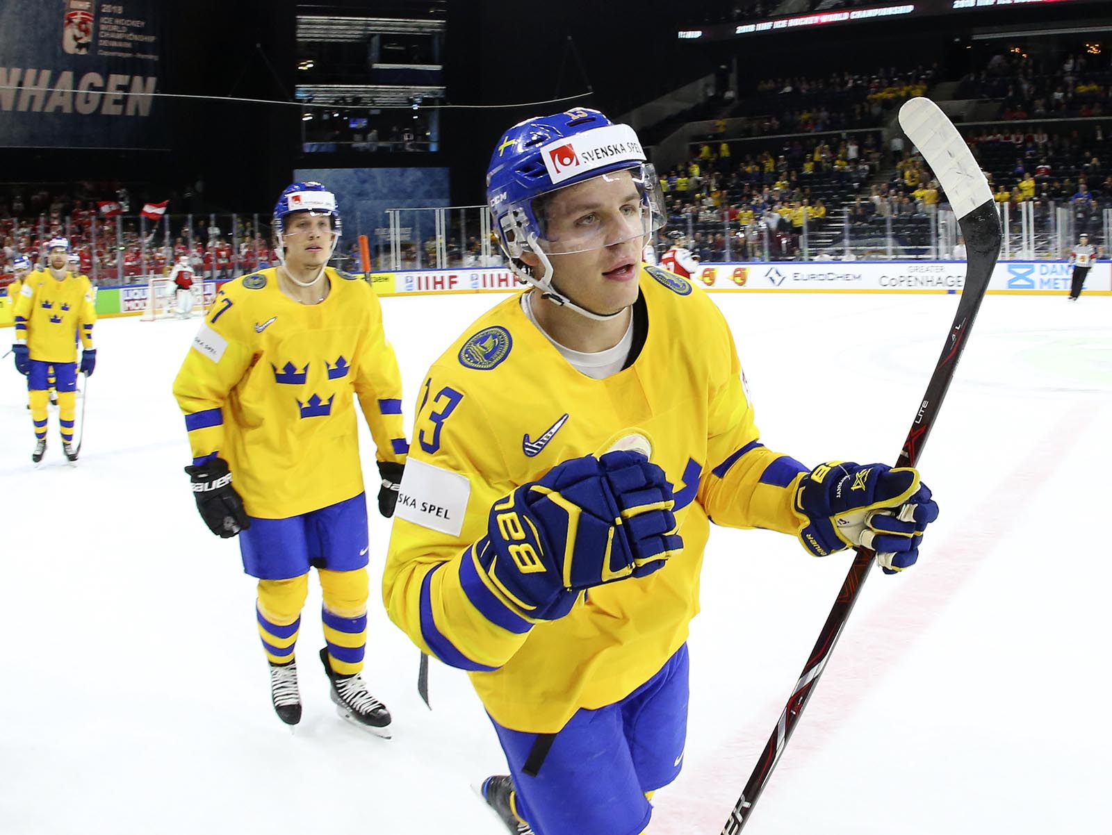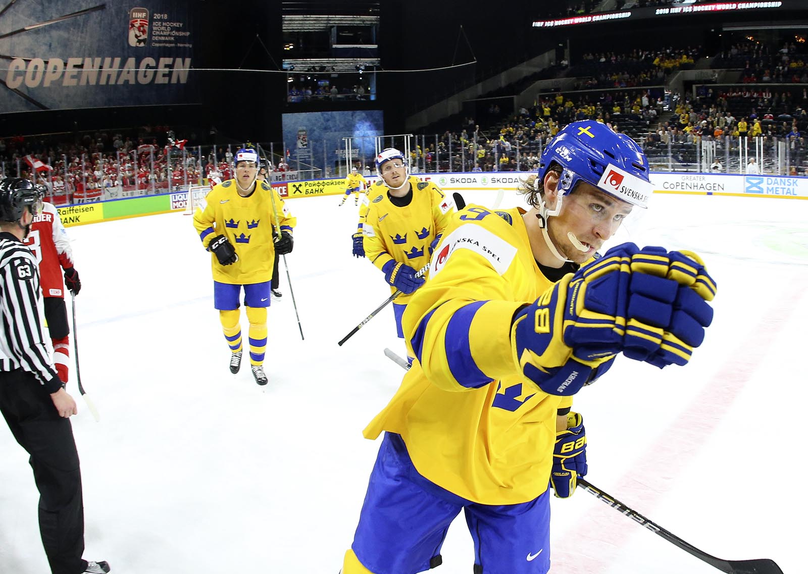 Sweden's Rickard Rakell celebrates during his team's comfortable victory over Austria in World Championship Group A action in Copenhagen.