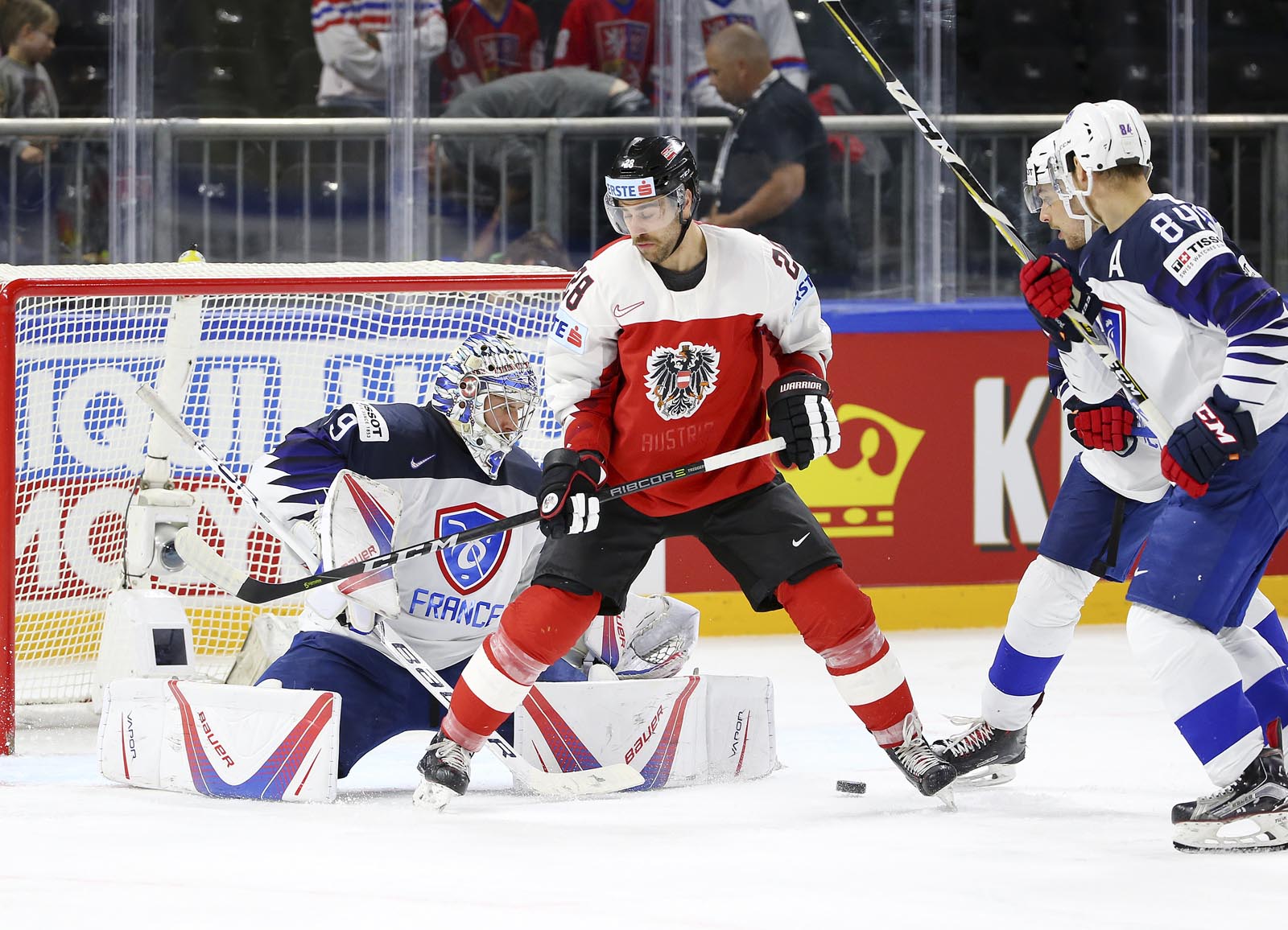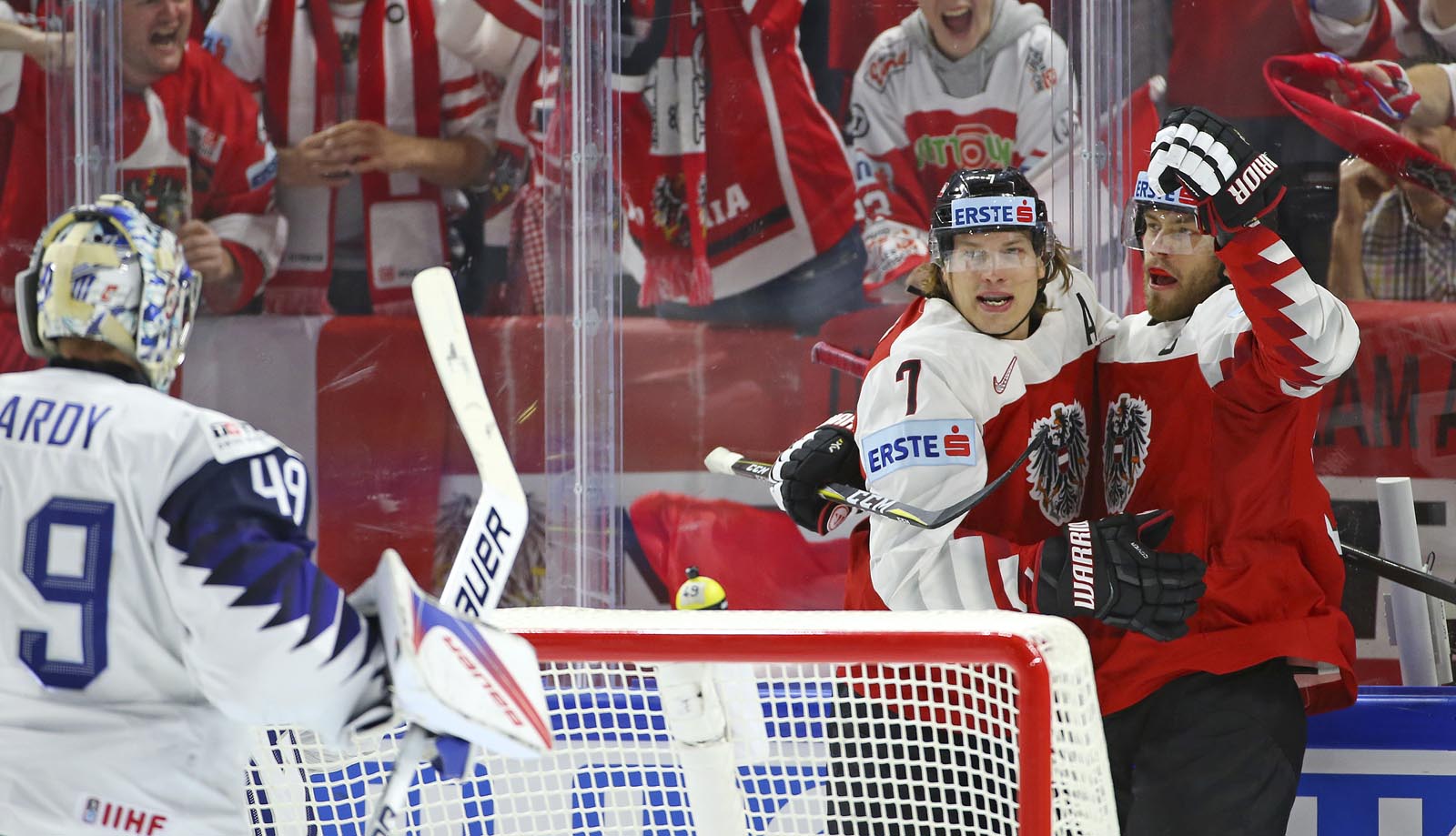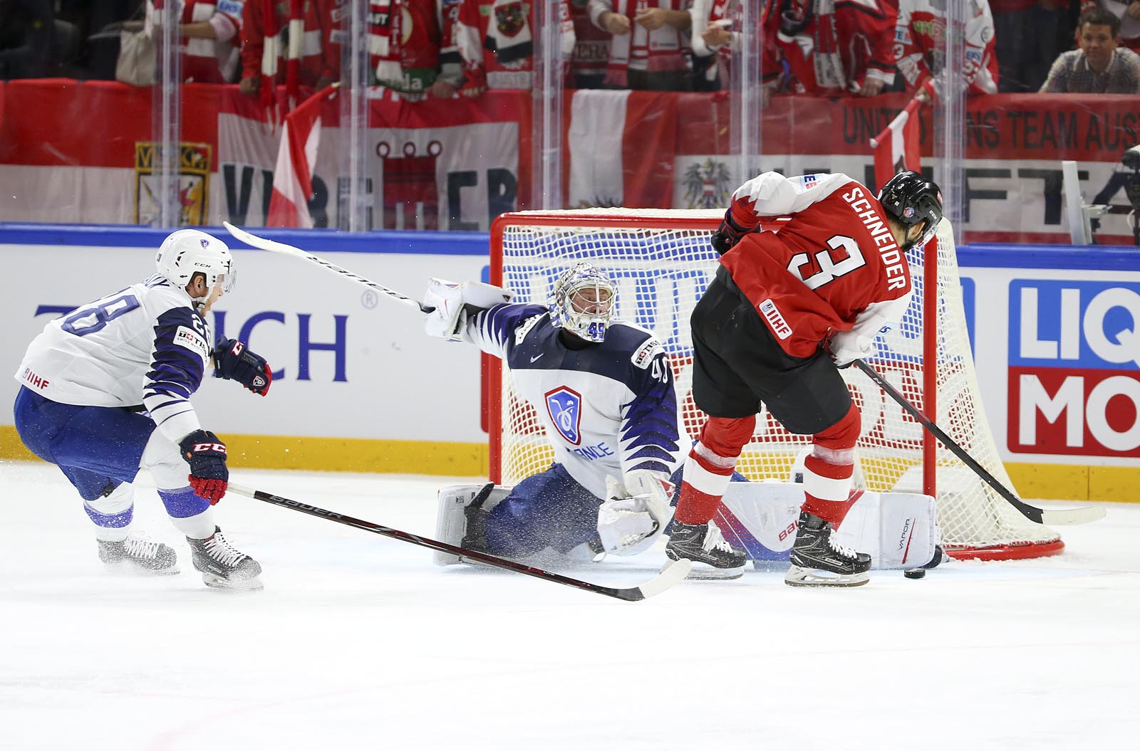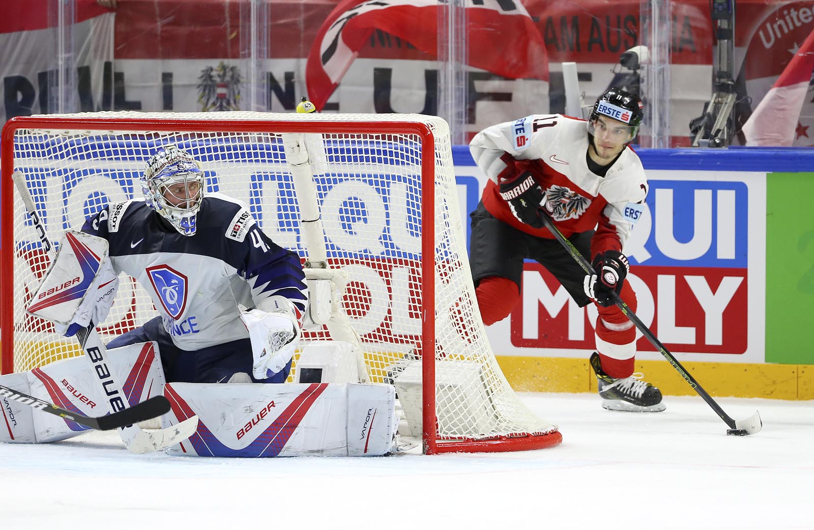 It was pure frustration for the Austrians, who outshot France 19-5 in the final stanza. Hardy slid across to foil Hundertpfund on a 2-on-1 with 12 minutes remaining. And later, French forward Floran Douay got mixed up with Starkbaum during an ineffective Austrian power play and knocked his mask off.