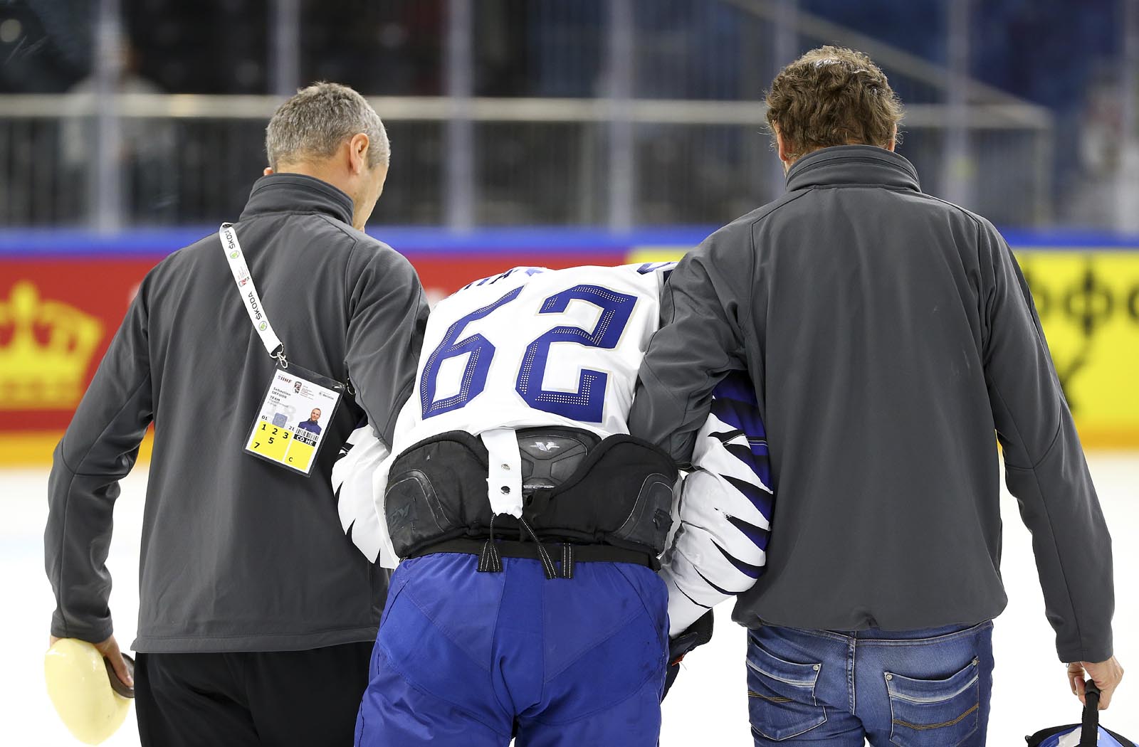 Things got worse for France. Just after dumping the puck in, veteran defenceman Florian Chakiachvili was shaken up when Patrick Spannring hit him into the boards at the French bench, back-first. The trainers assisted Chakiachvili off the ice, and he would not return.