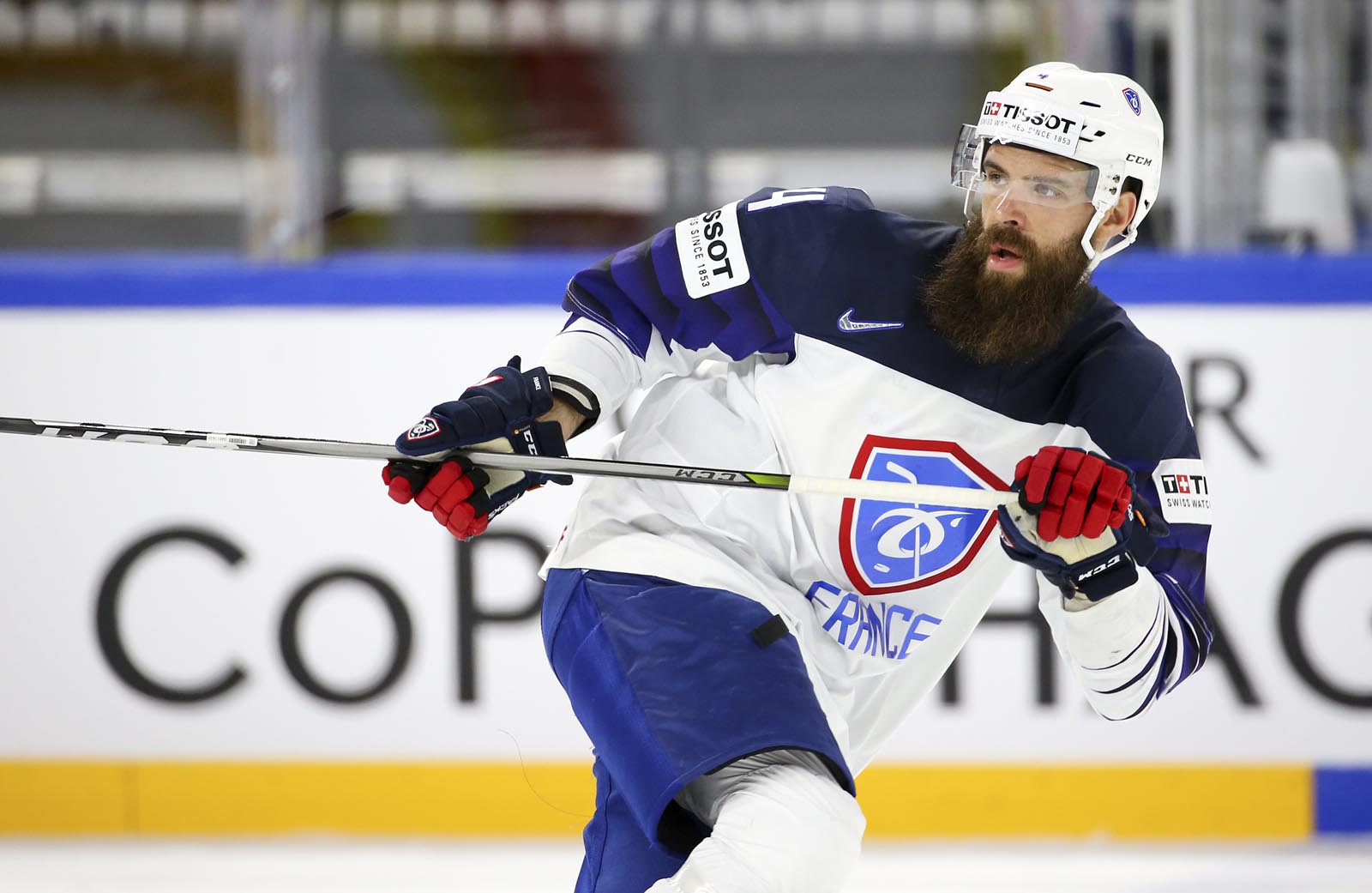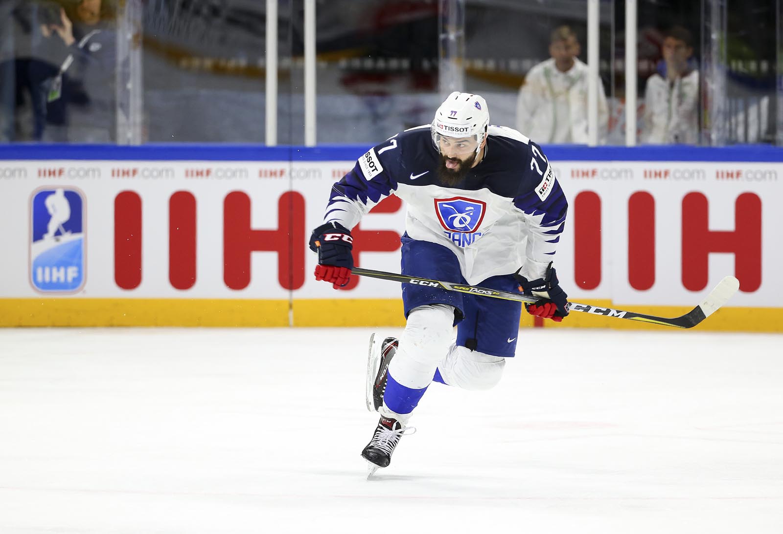 At 13:10, Les Bleus went up 2-1 on the power play. Texier rushed the puck to the net from the right side and Sacha Treille pitchforked it in during a scrum. Stephane Da Costa then had a glorious opportunity alone in front, but put the puck off Starkbaum’s blocker and stick.