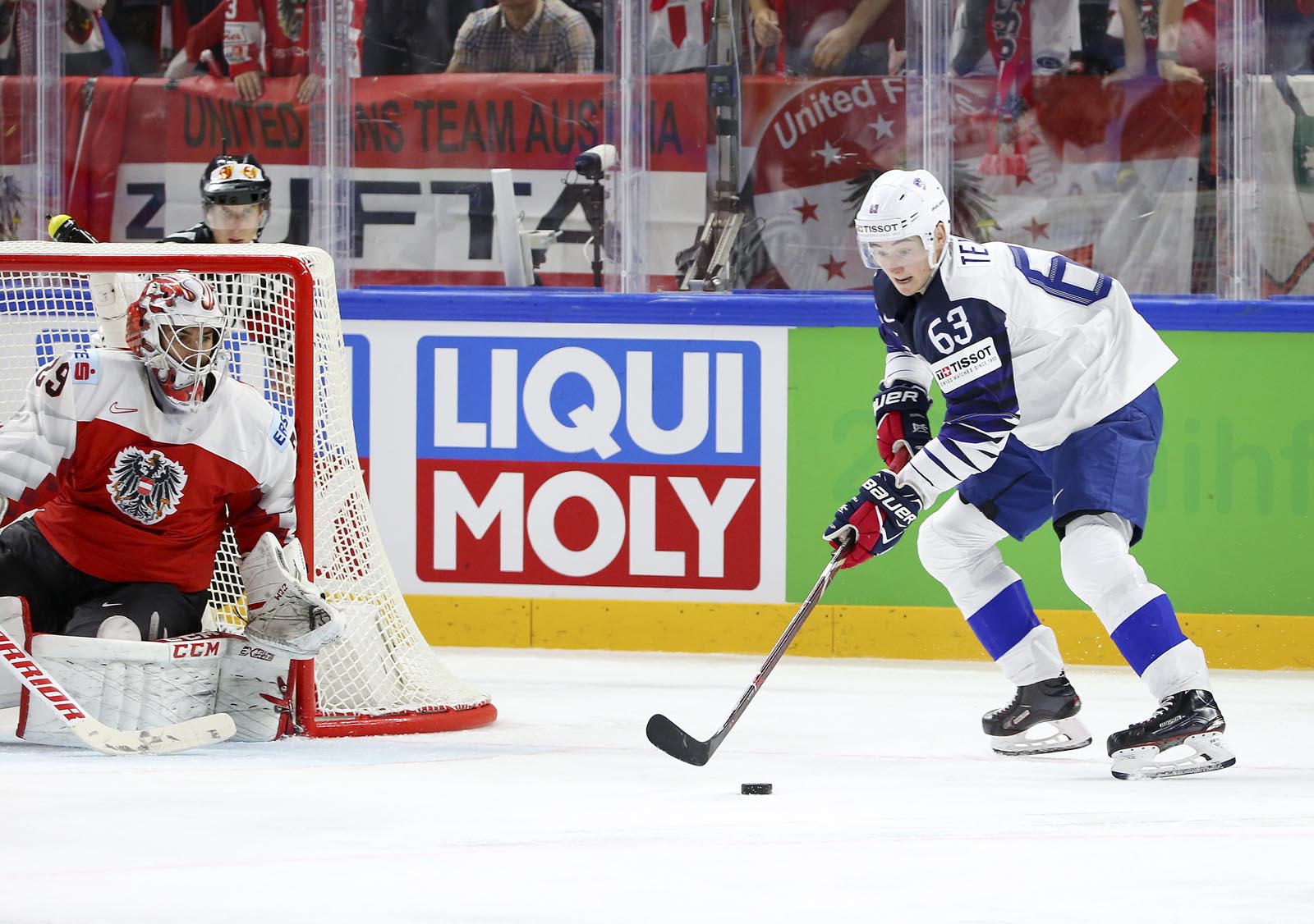 Moments after Lukus Haudum missed a great opportunity at the side of Hardy's net, the French rushed back down and made it 4-2 at 17:49. Texier made a deft back pass to Teddy Da Costa, who used the Austrian defenceman as a screen before beating Starkbaum five-hole.