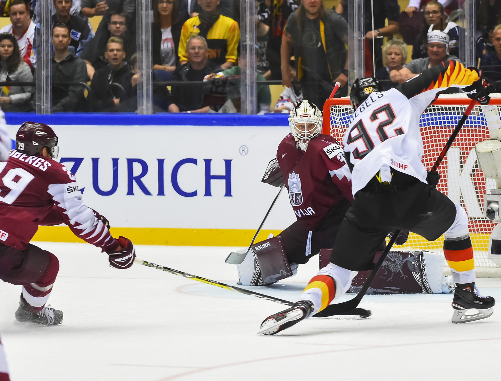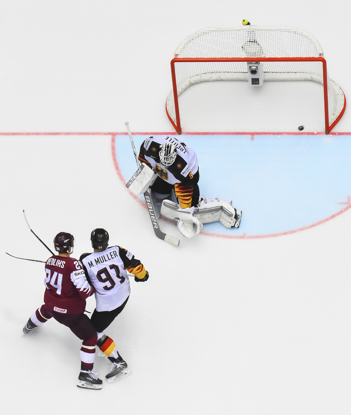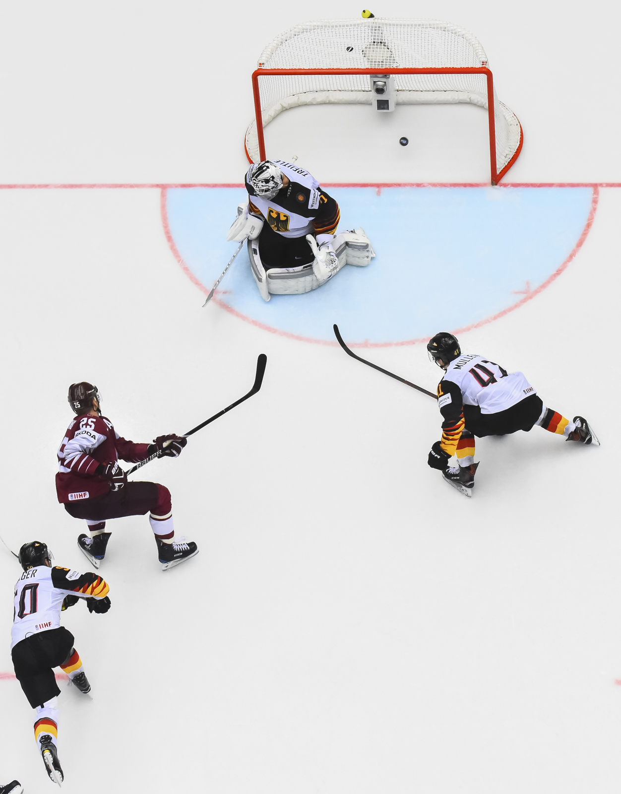 Play came up ice and all of a sudden Germany had a three-on-two, and the players executed a beautiful sequence. Rudolfs Balcers played the pass from the right side to Rodrigo Abols, going to the net.