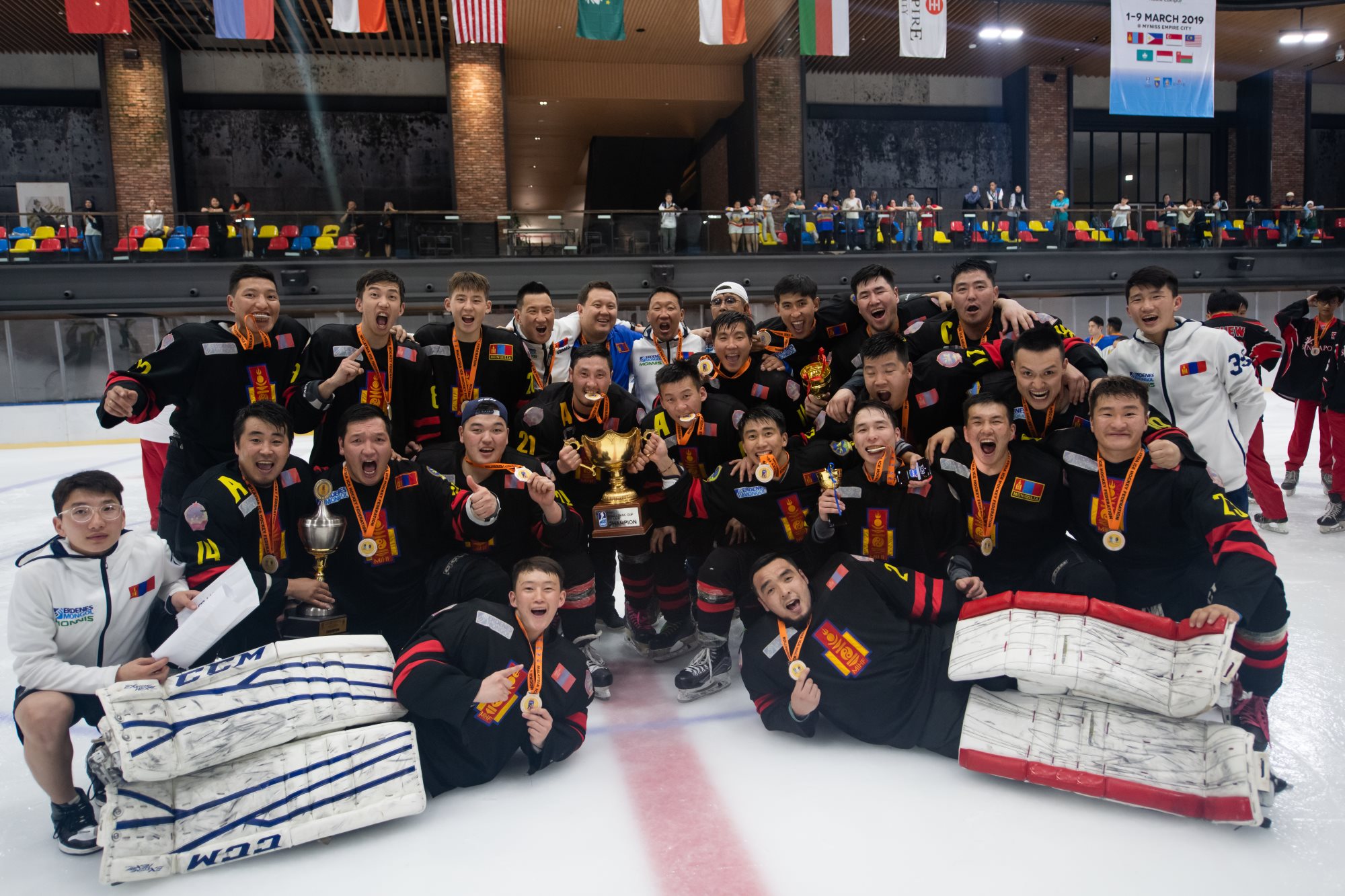 The Mongolian men’s national team celebrates after defending the title at the 2019 IIHF Ice Hockey Challenge Cup of Asia in Malaysia.