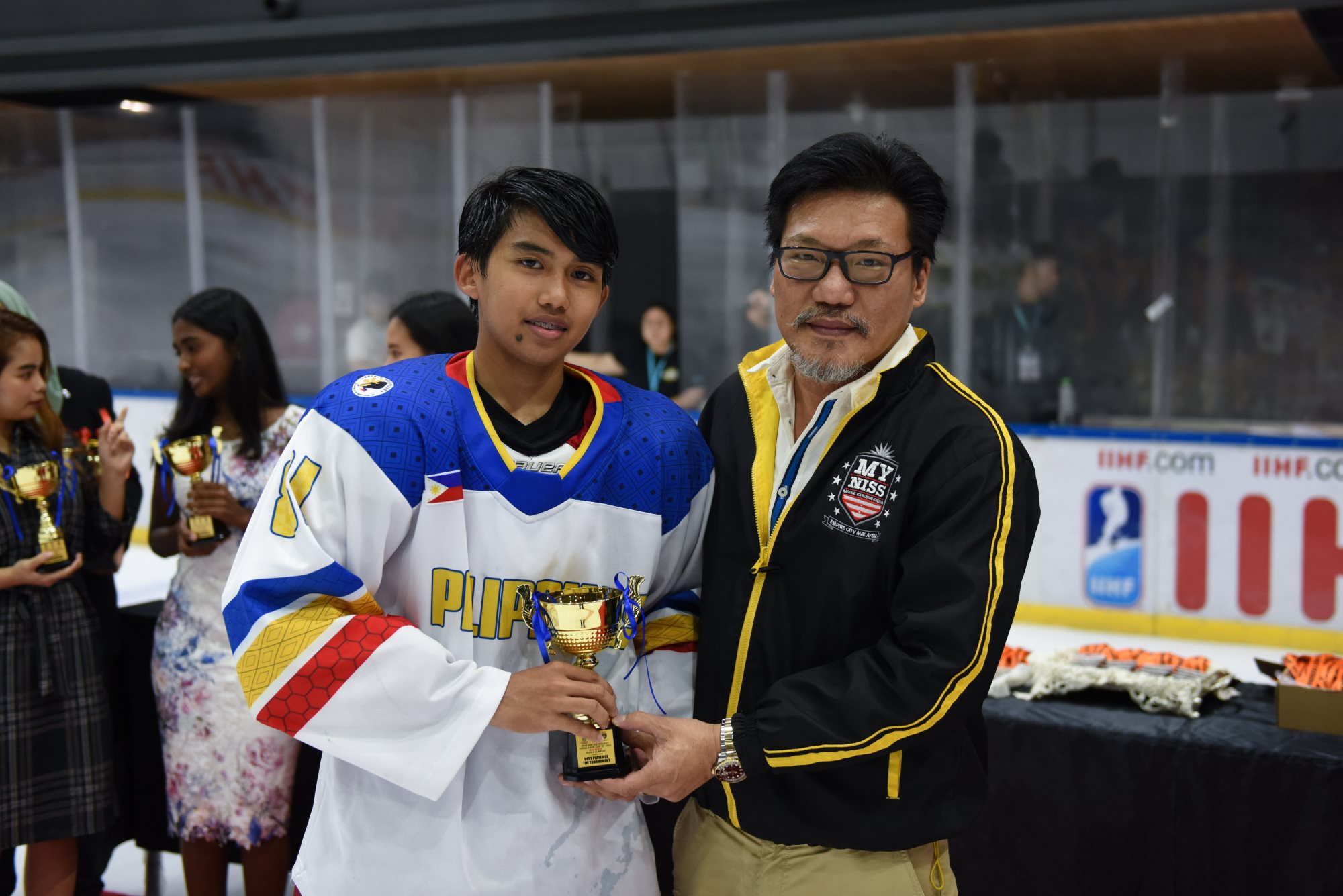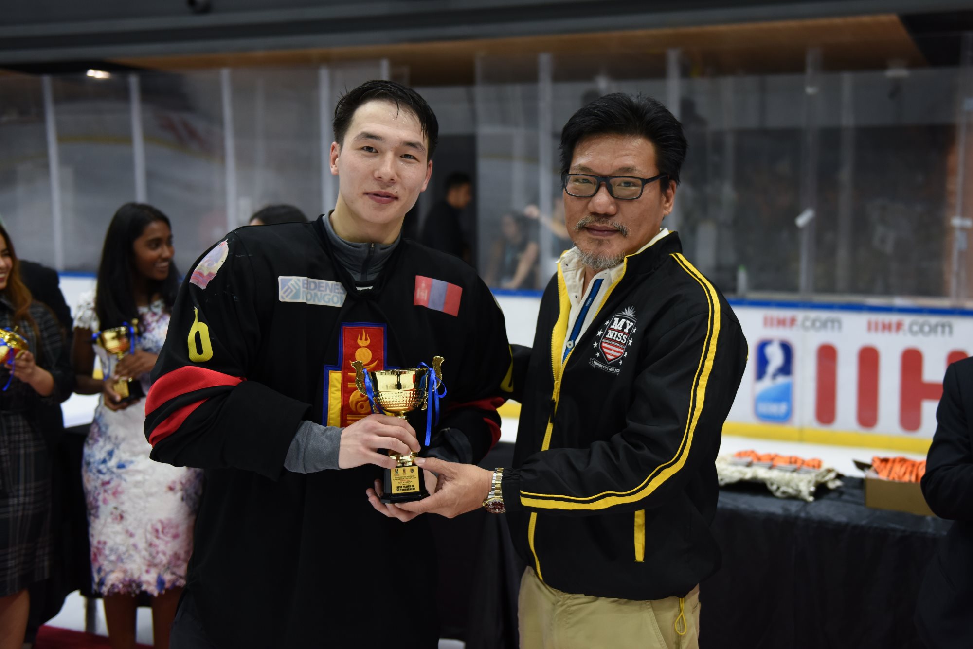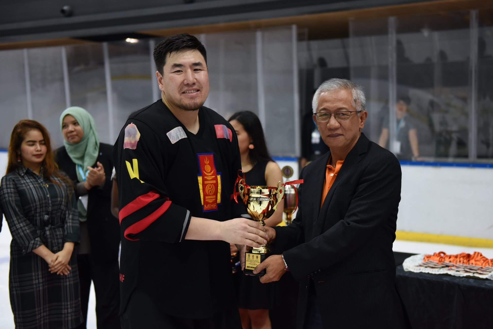 The individual honours saw Mongolia’s Ider crowned leading scorer, although Malaysia’s Brandon Tan tied him on 17 points. Ider got the verdict due to scoring more goals. John Steven Fuglister of the Philippines was third with 15 (7+8) points. The Philippines also had the most effective goalie of the competition; Spafford stopped 91.2% of the shots he faced, a fraction better than Oman’s Mohamed al Balushi on 91.16%. Spafford was selected as the tournament’s top goalie, Tan was the best forward and Fuglister earned the MVP award. Batgerel Zorigt of Mongolia was the rated the leading defenceman.