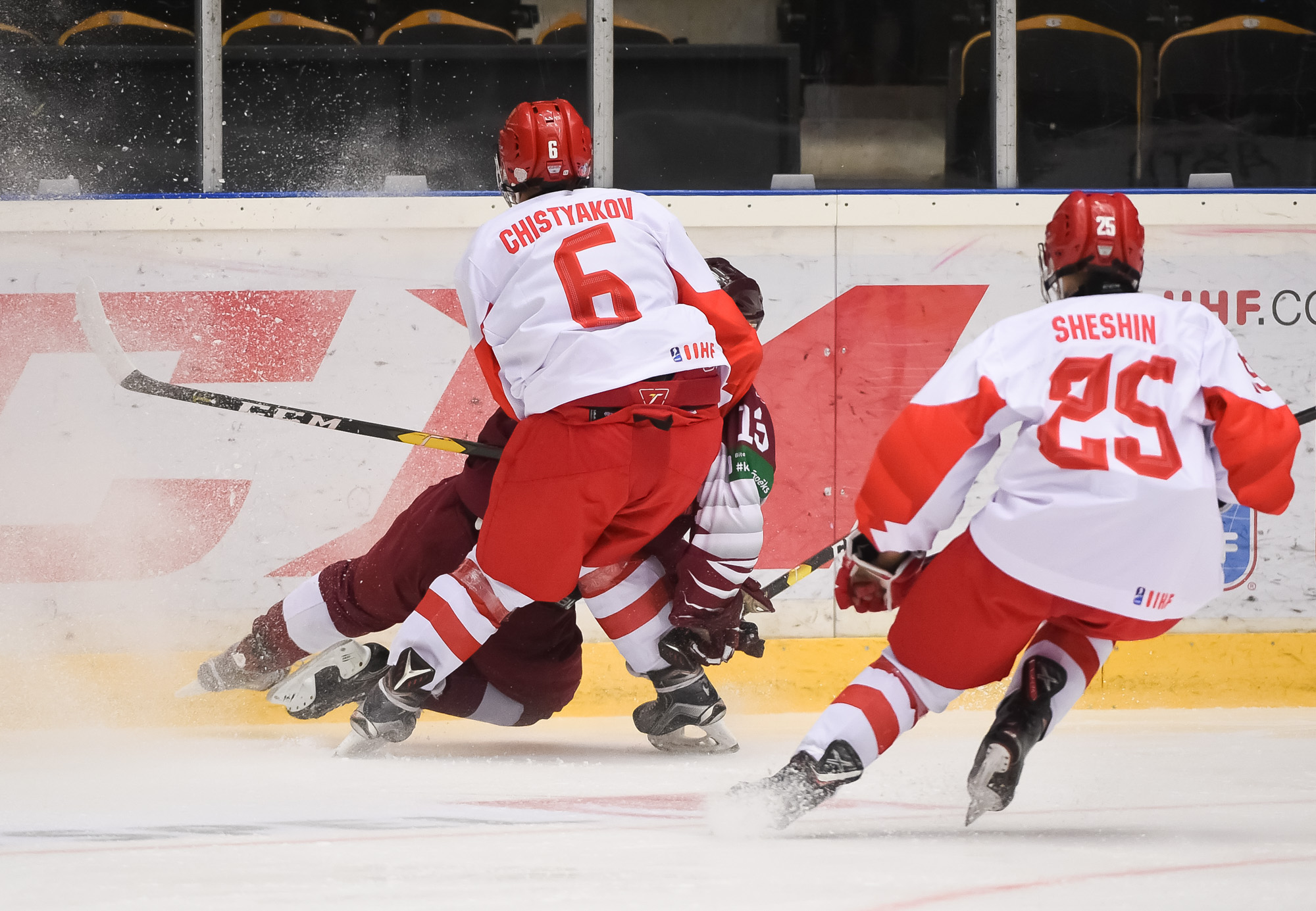 The bulk of the third period was spent with the teams fighting to get shots through. With 3:04 left in regulation, Latvia tried a nice drop pass play which caused some shoving by the Russian net. Latvian head coach Olegs Sorokins called timeout and pulled Silovs for the extra attacker.
