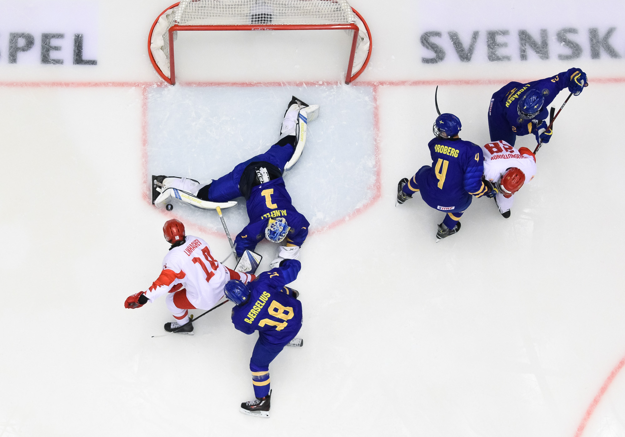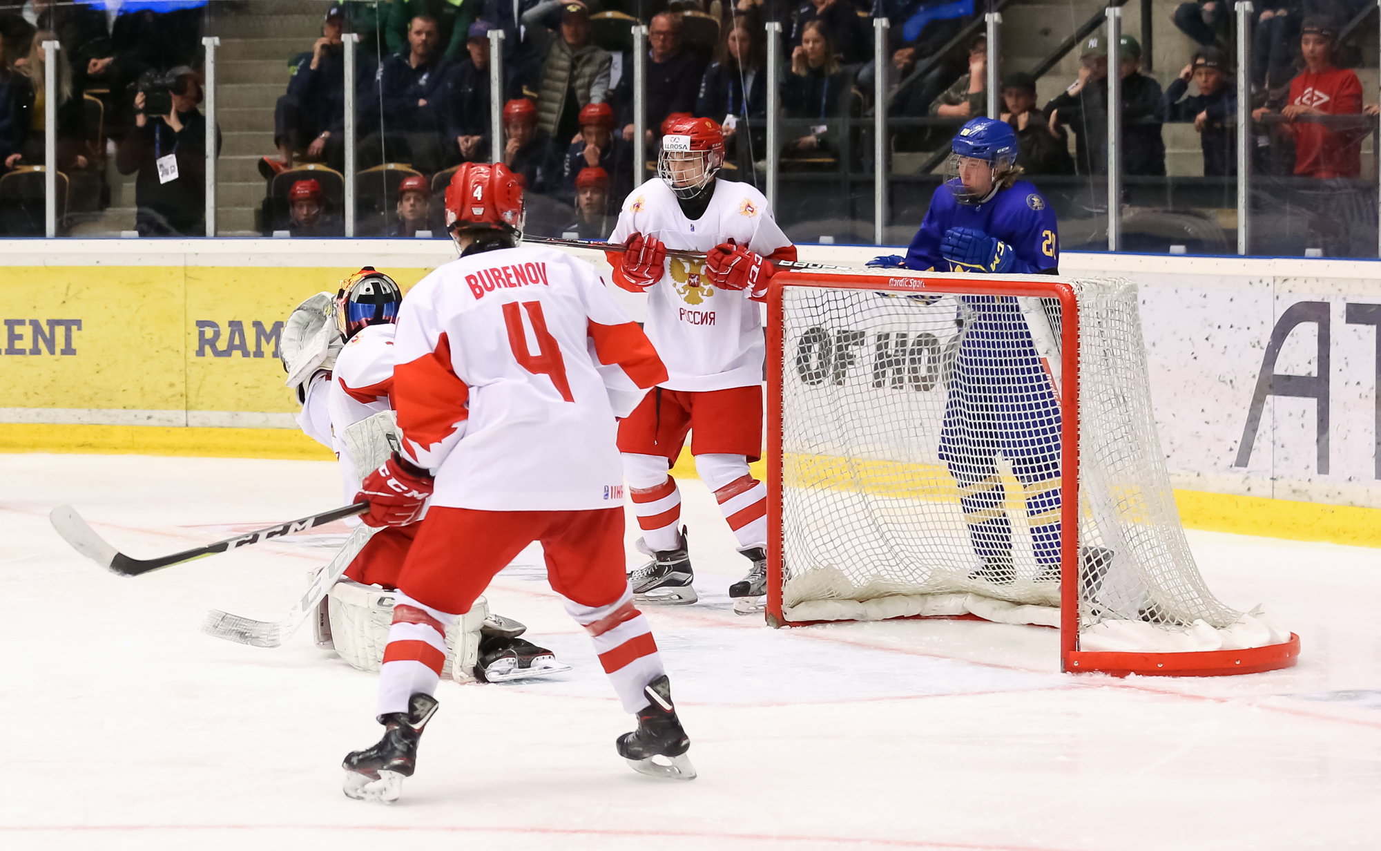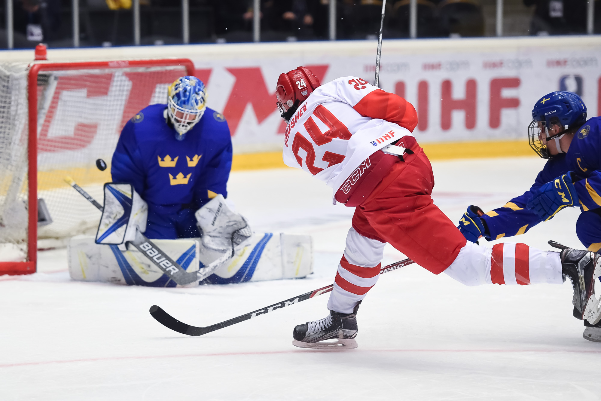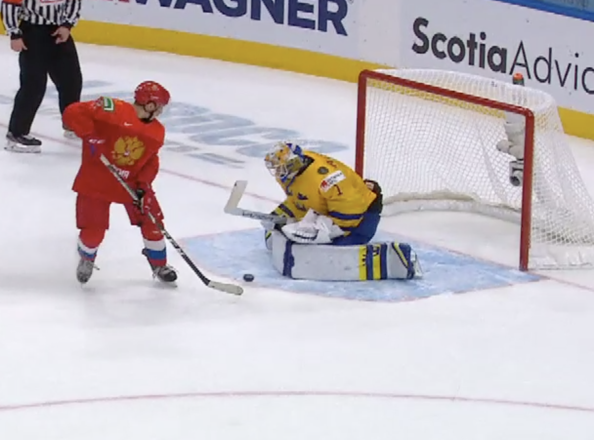 At 10:22, Groshev put Russia up 3-2 with a stellar individual effort. Picking up a Nikita Vashenko pass in the neutral zone, he split the Swedish defence and snapped one past Alnefelt's blocker in close.