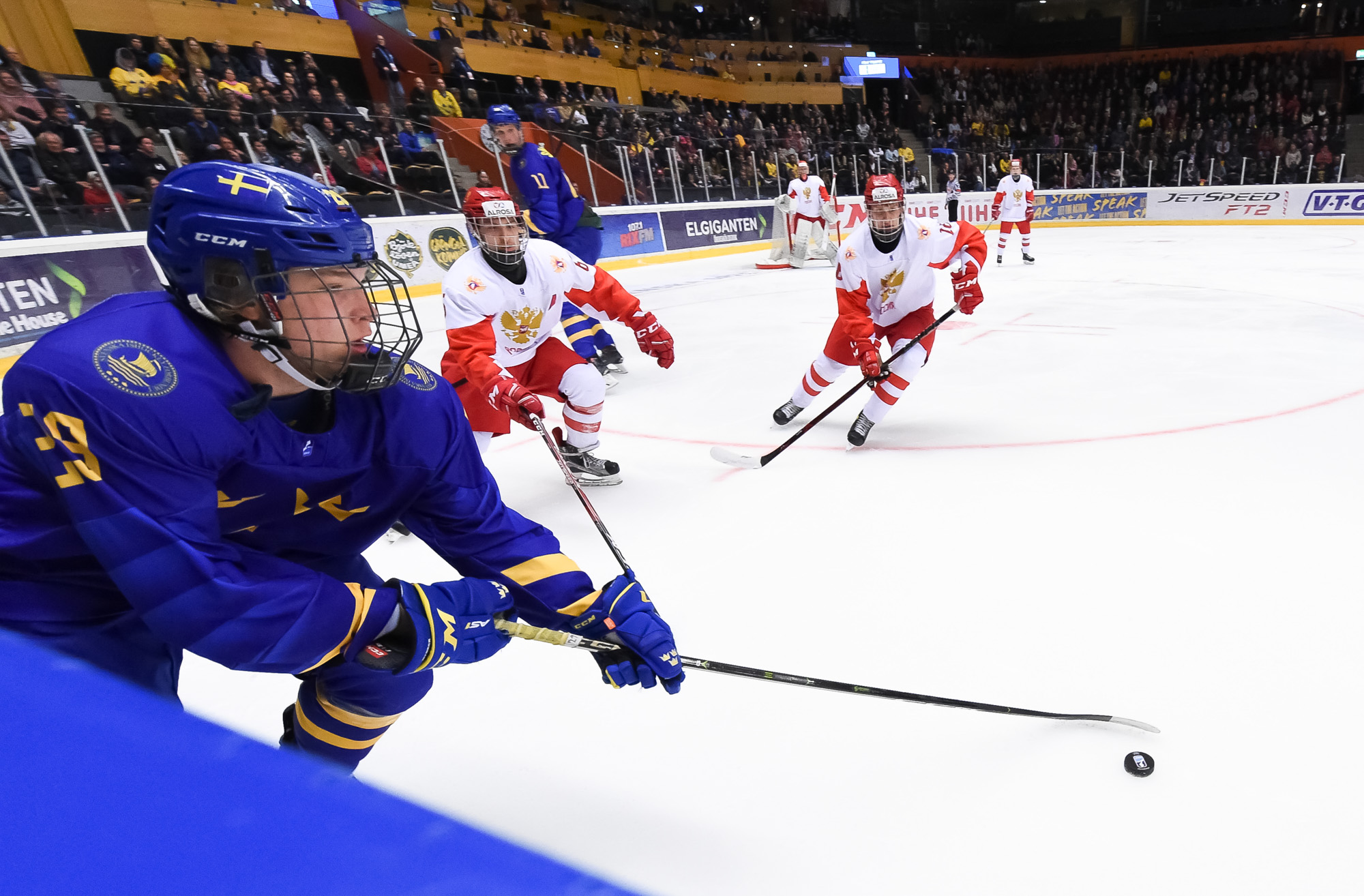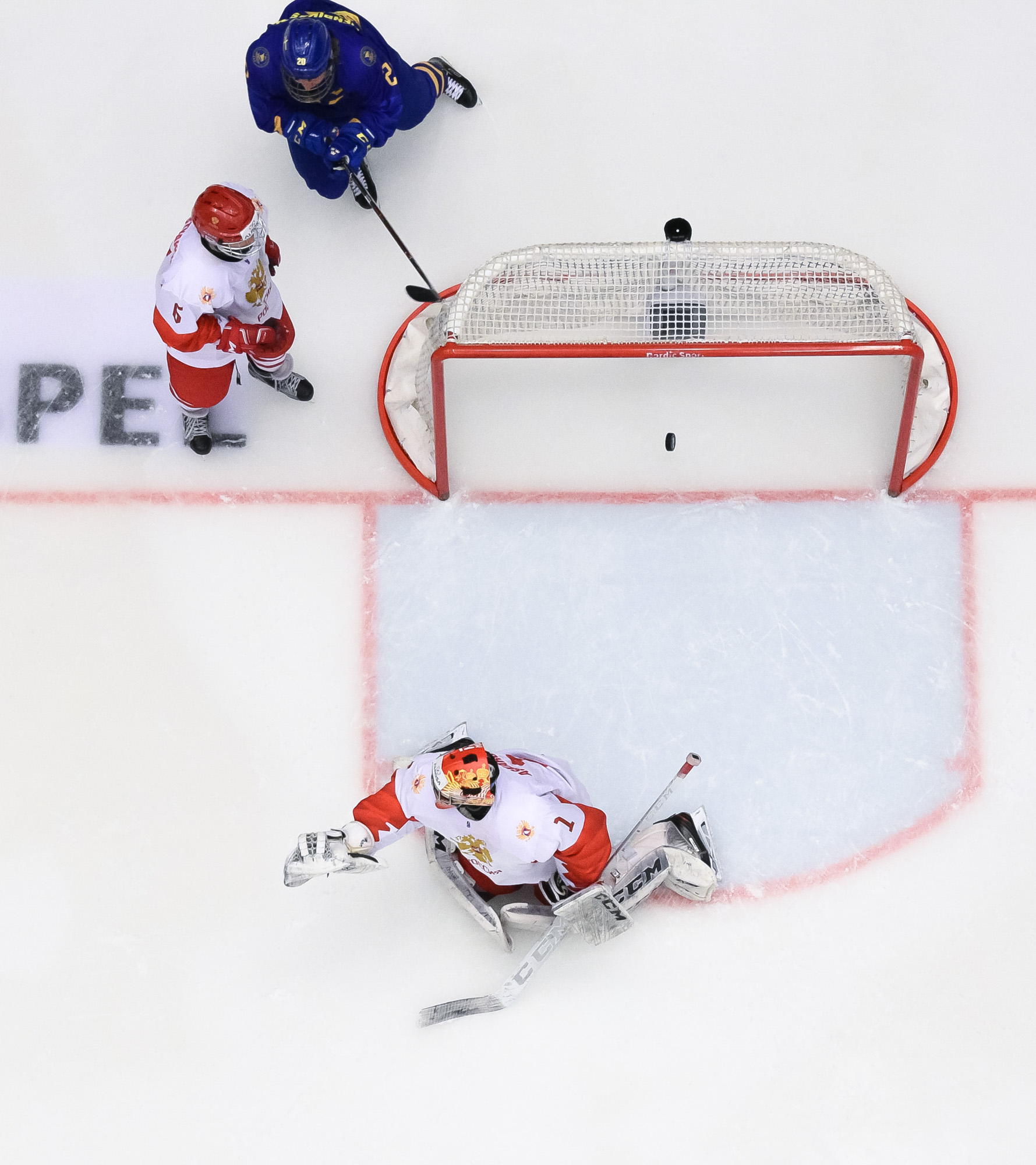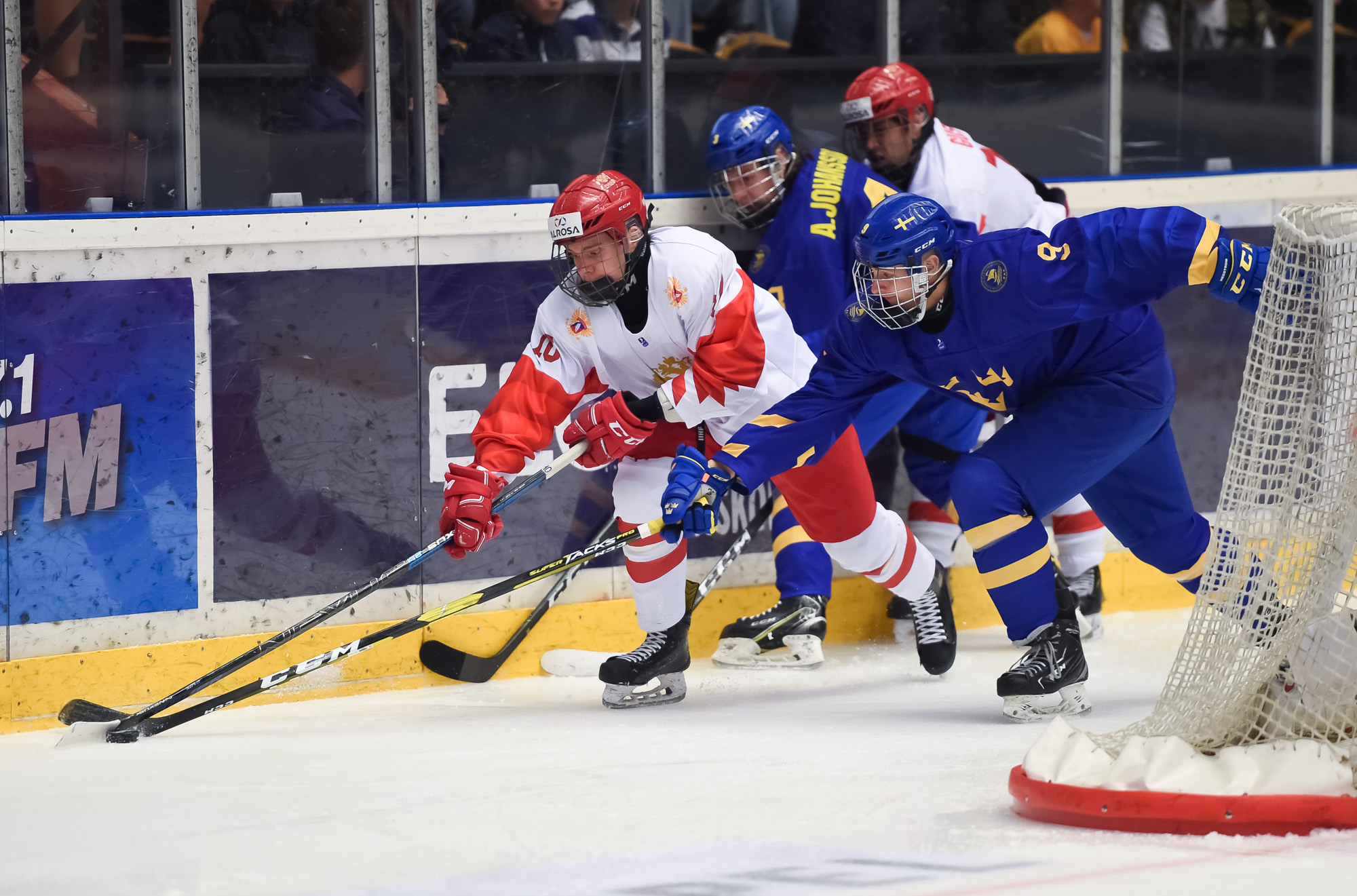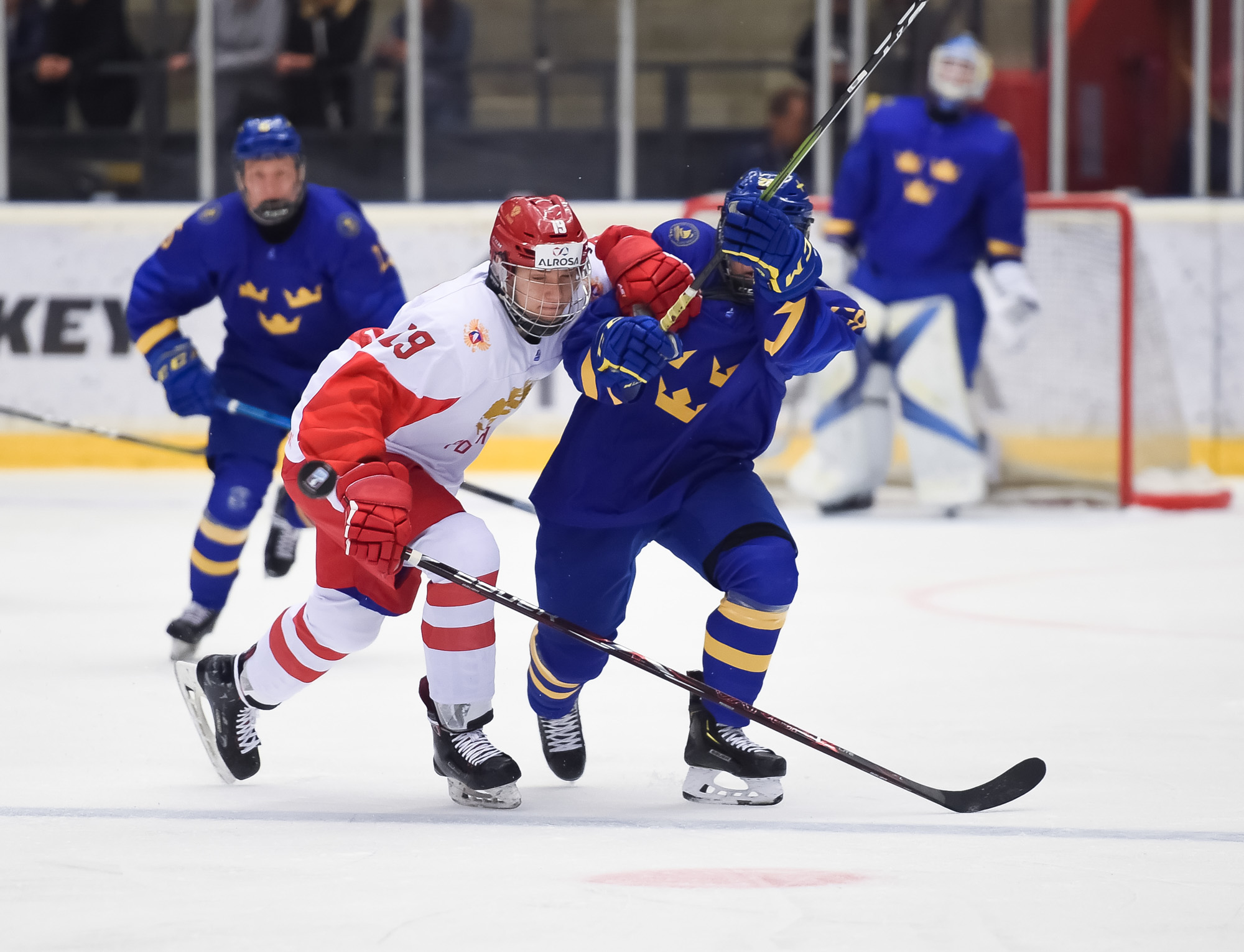 At 10:22, Groshev put Russia up 3-2 with a stellar individual effort. Picking up a Nikita Vashenko pass in the neutral zone, he split the Swedish defence and snapped one past Alnefelt's blocker in close.