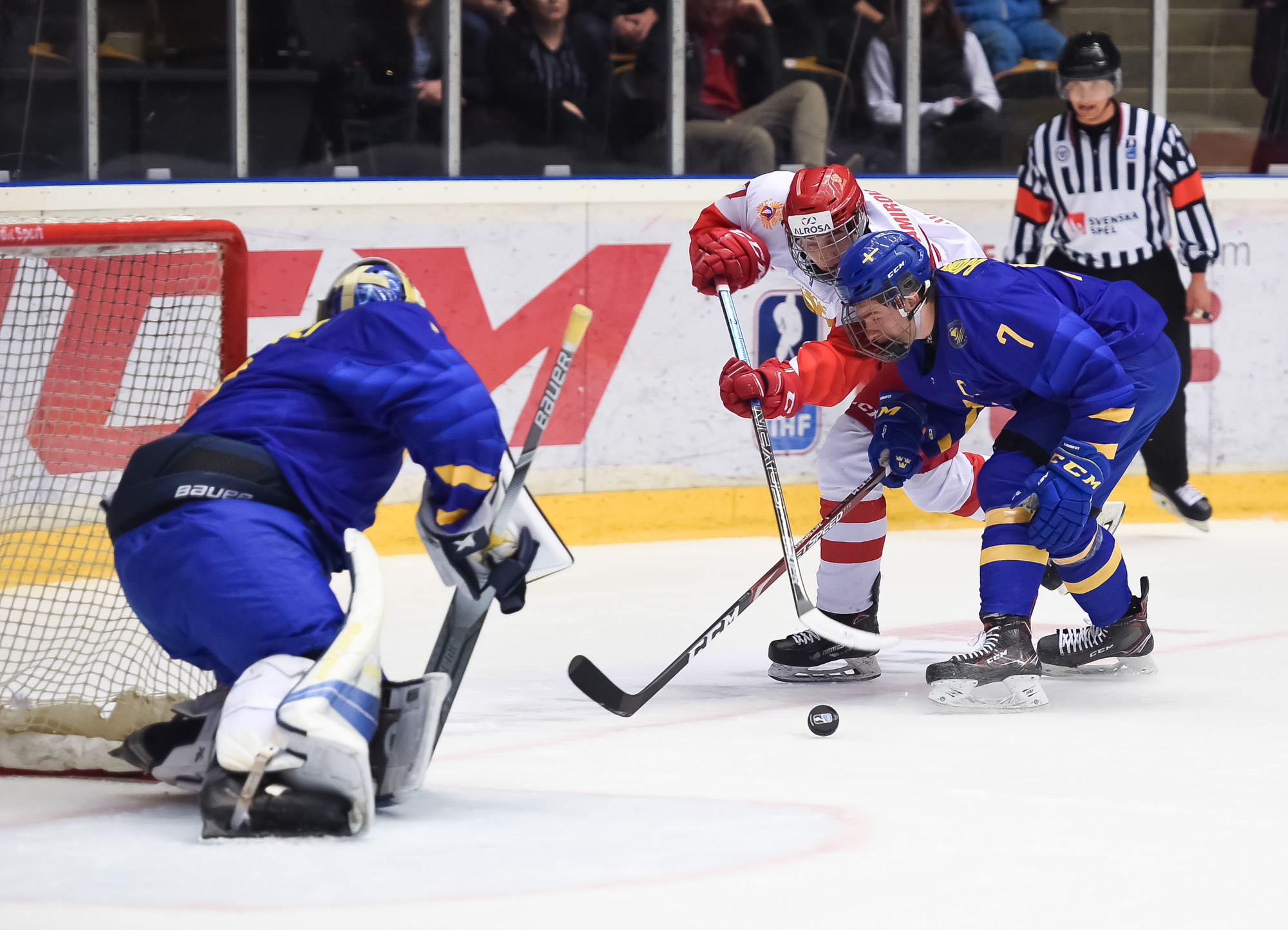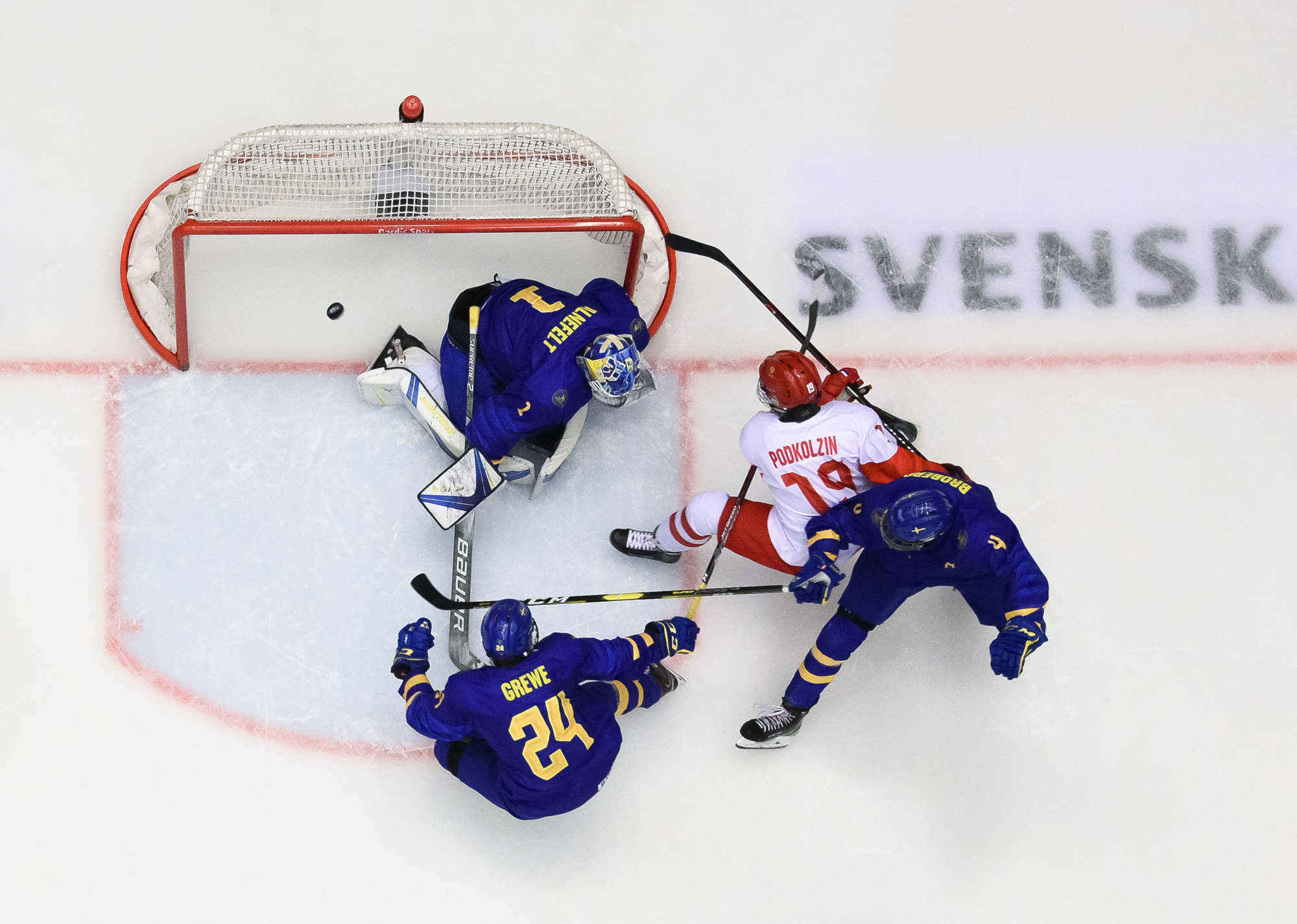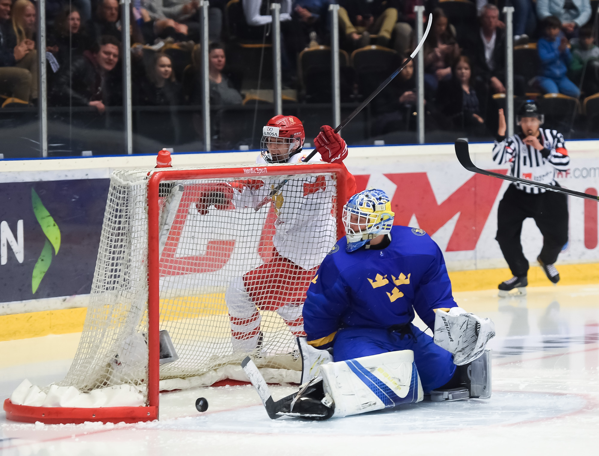 At 11:48, Podkolzin whooped it up after he got the puck from Amirov, cut to the net and beat Alnefelt with a power move. The officials initially waved the goal off and signalled for a goalie interference penalty. However, after a brief review, the call was reversed and the score was 2-1 Sweden.
