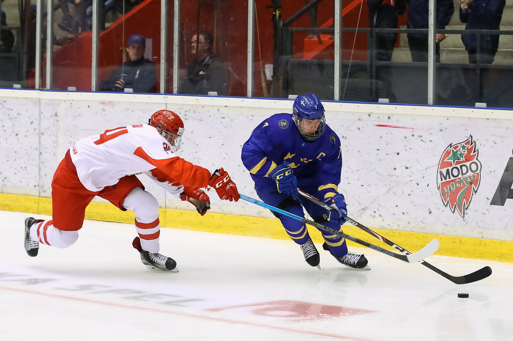 Max Wahlgren, the lone Modo Hockey skater, seemed a trifle nervous, picking up both of his team’s minor penalties so far. But overall, the Swedes played with poise that belied their youth.