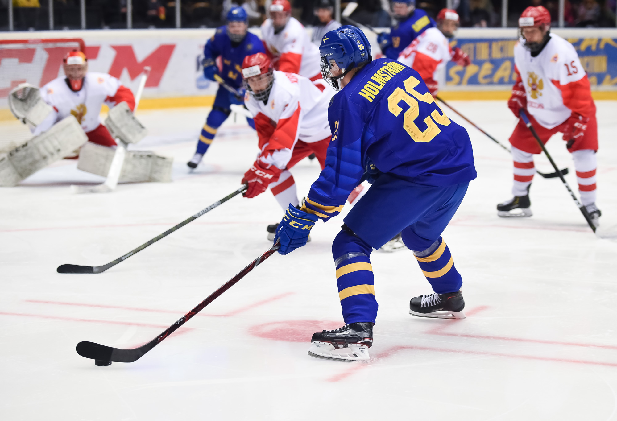 Sweden jumped into a 2-0 lead at 5:53 of the second period. Unassisted, Holmstrom showed extraordinary patience as he picked up a loose puck in the Russian zone, cruised into the left faceoff circle and went high from a bad angle.