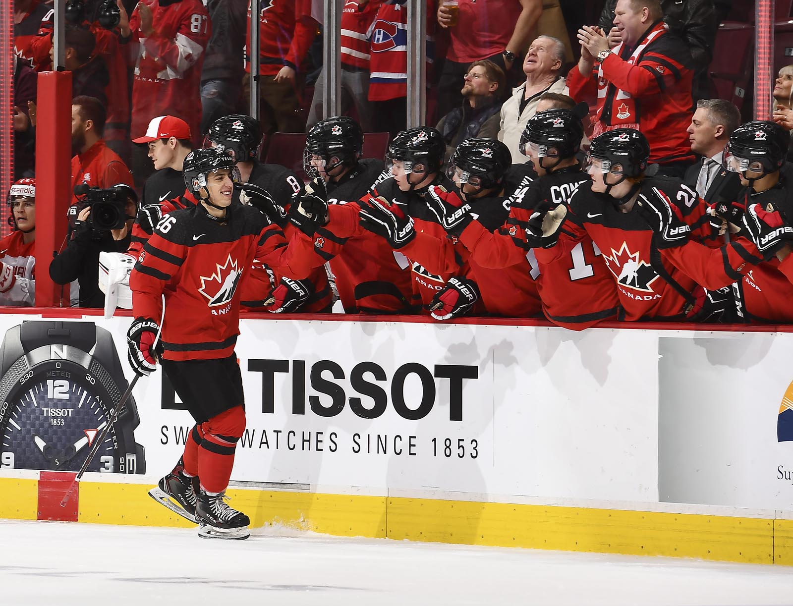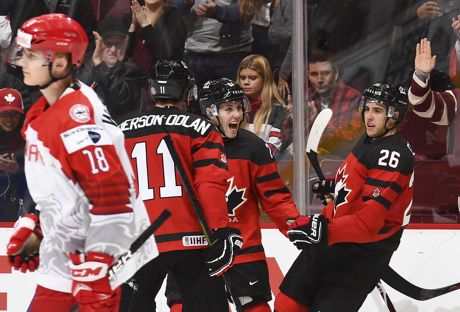 Morgan Frost's (#26) hat trick led Canada to a one-sided victory over Denmark at Rogers Arena tonight.