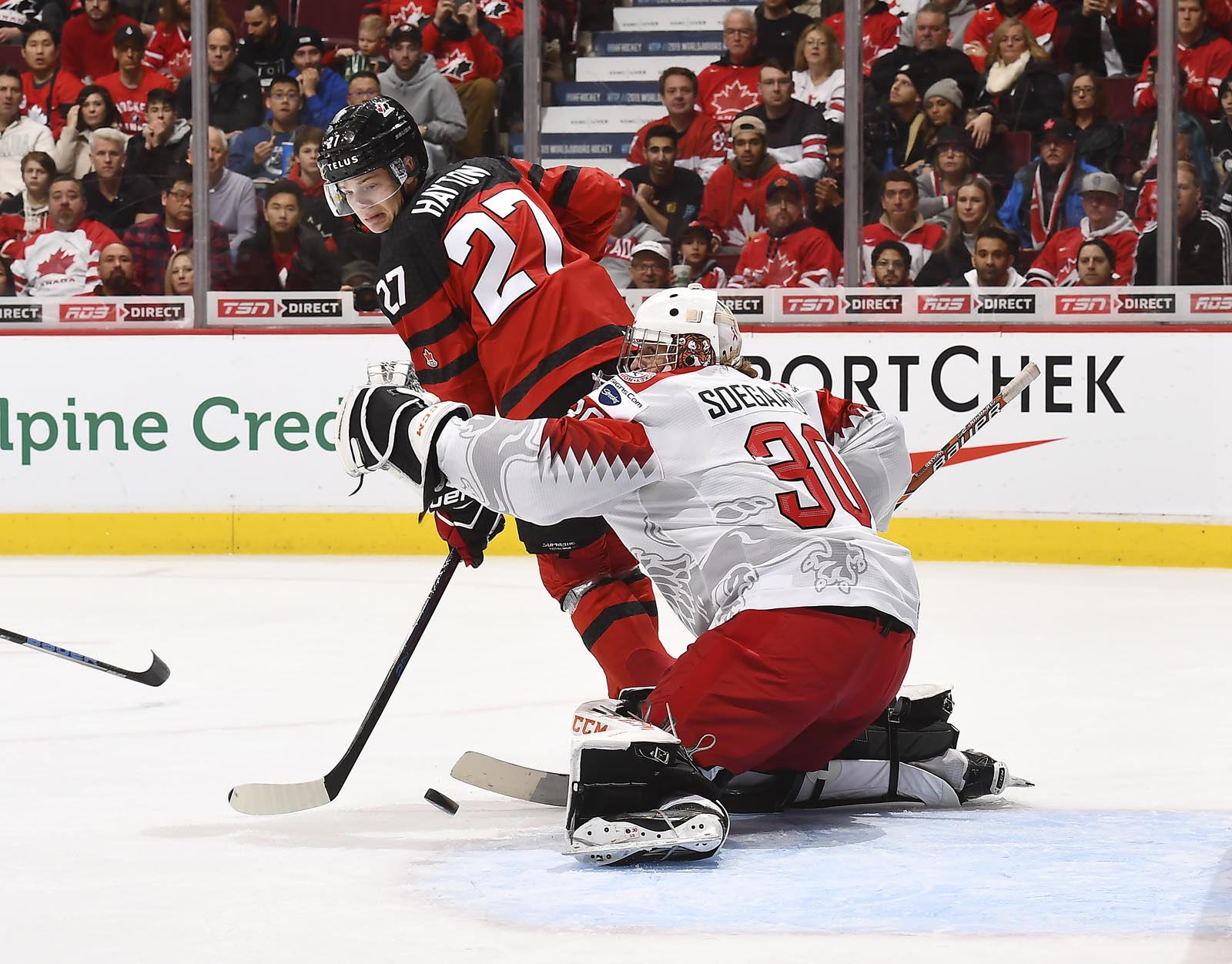 Canada added five unanswered goals in the second. Soegaard deserved the Purple Heart fro his valiant effort, but Canada’s every shot seemed to be of quality. Captain Maxime Comtois made it 4-0 in the first minute, snapping his own rebound home, and then Frost got his hat-trick goal on a torpedo play started by Canadian goalie Michael DiPietro.