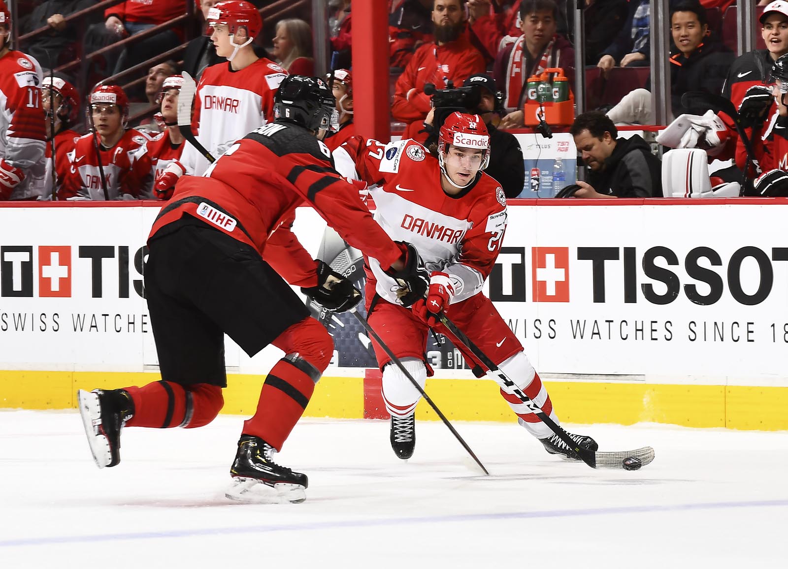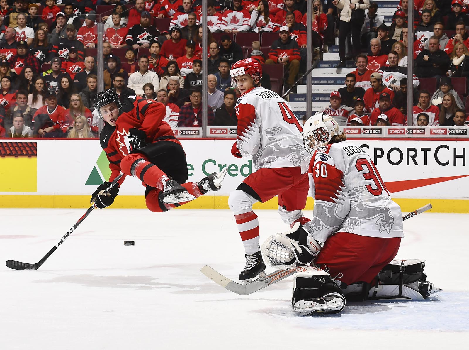 Frost got things going early before a raucous home crowd. Brett Leason created a turnover inside the Danish blue line, and Frost ended up with the puck in front of goalie Mads Soegaard. A quick shuffle from the Canadian forward, though, and the puck was in the net at 4:52.