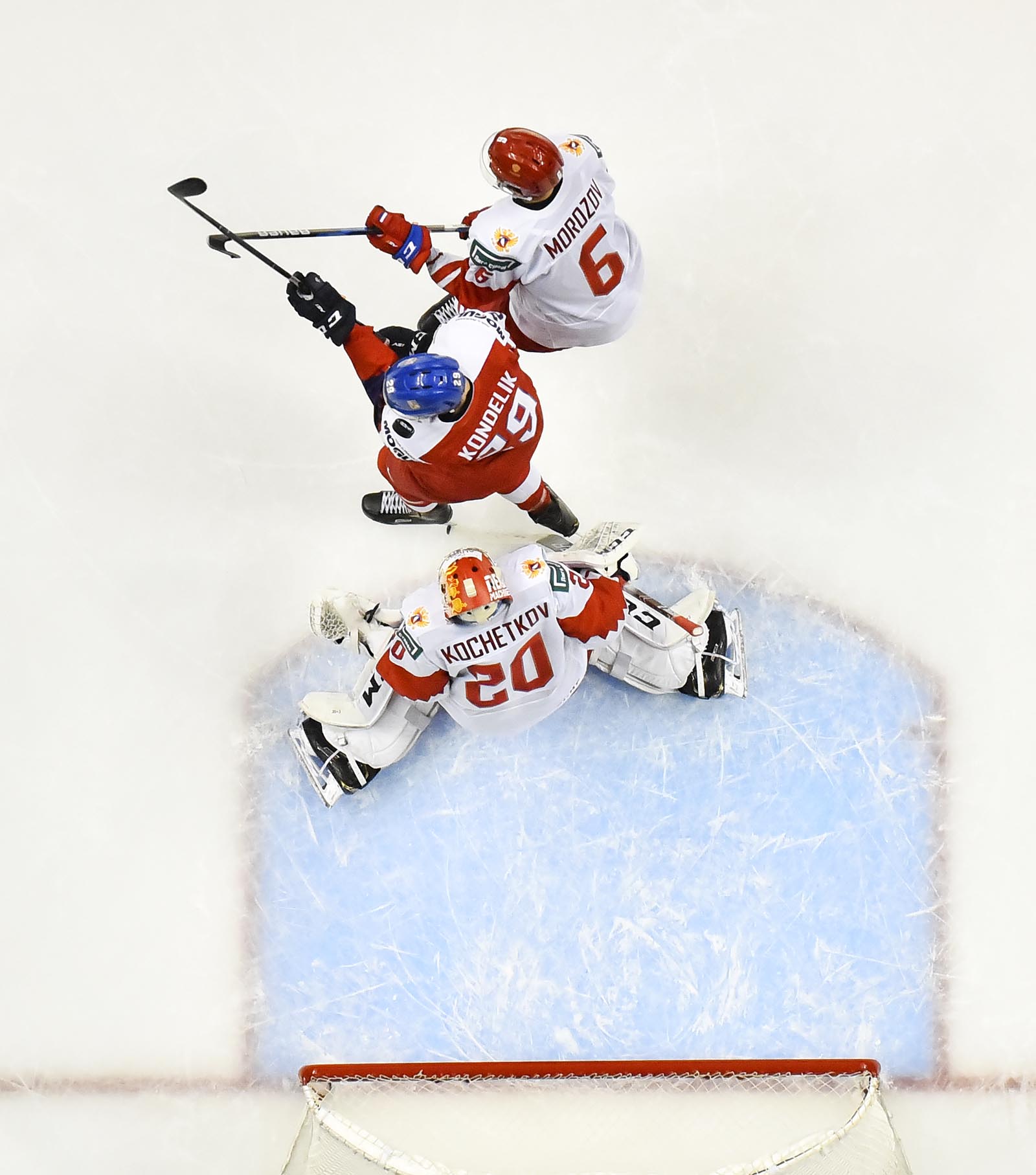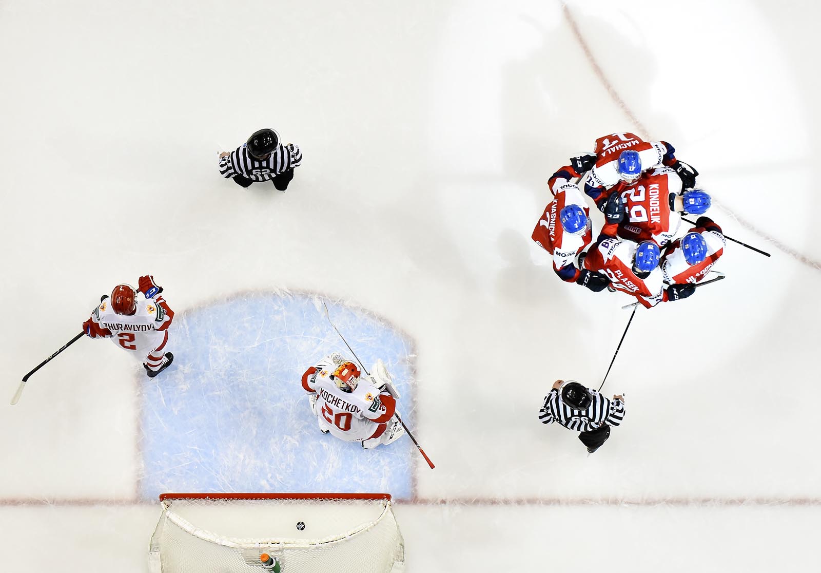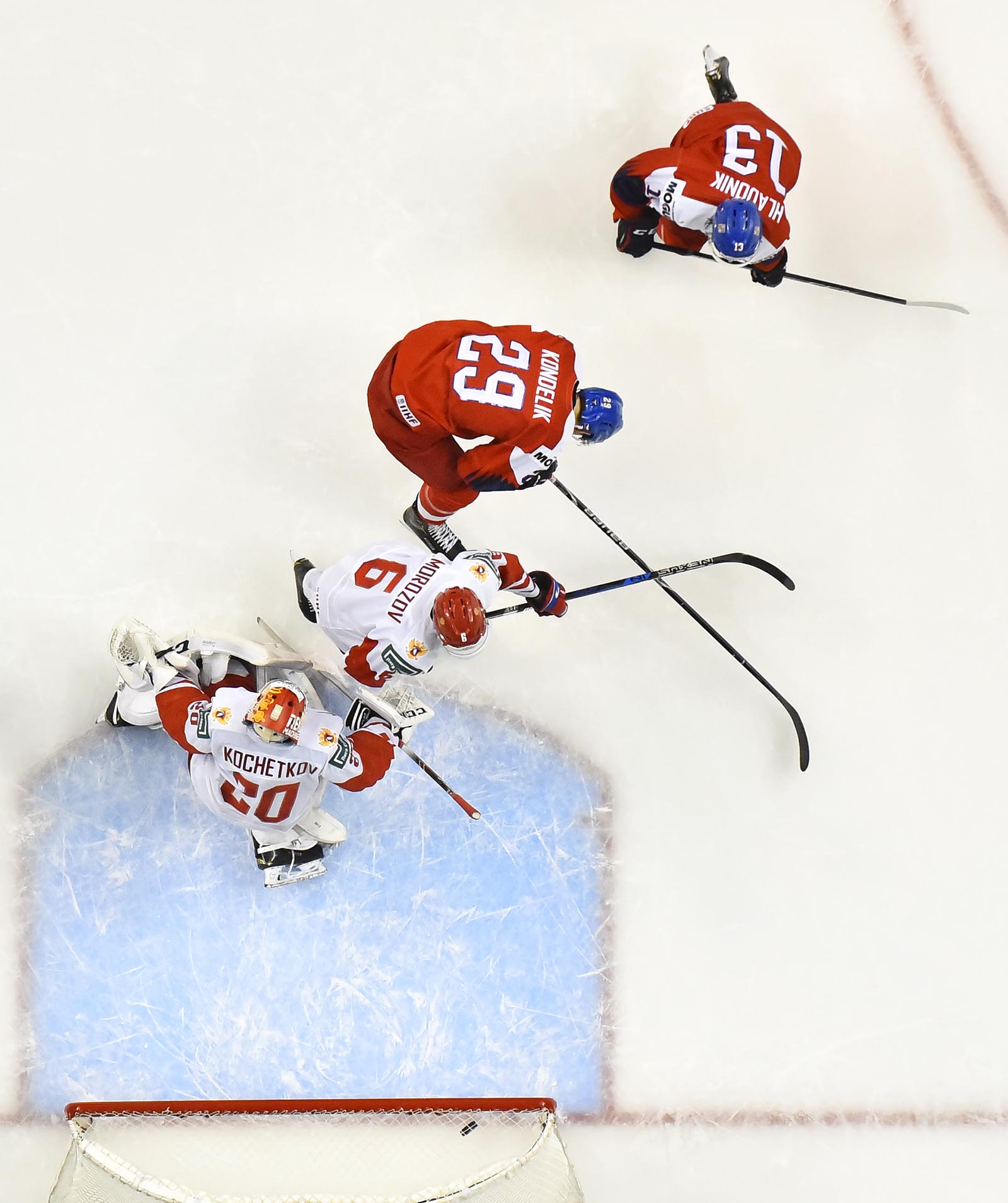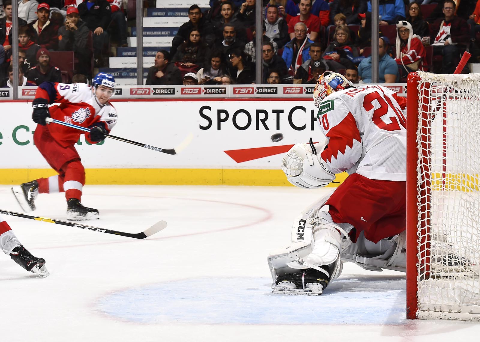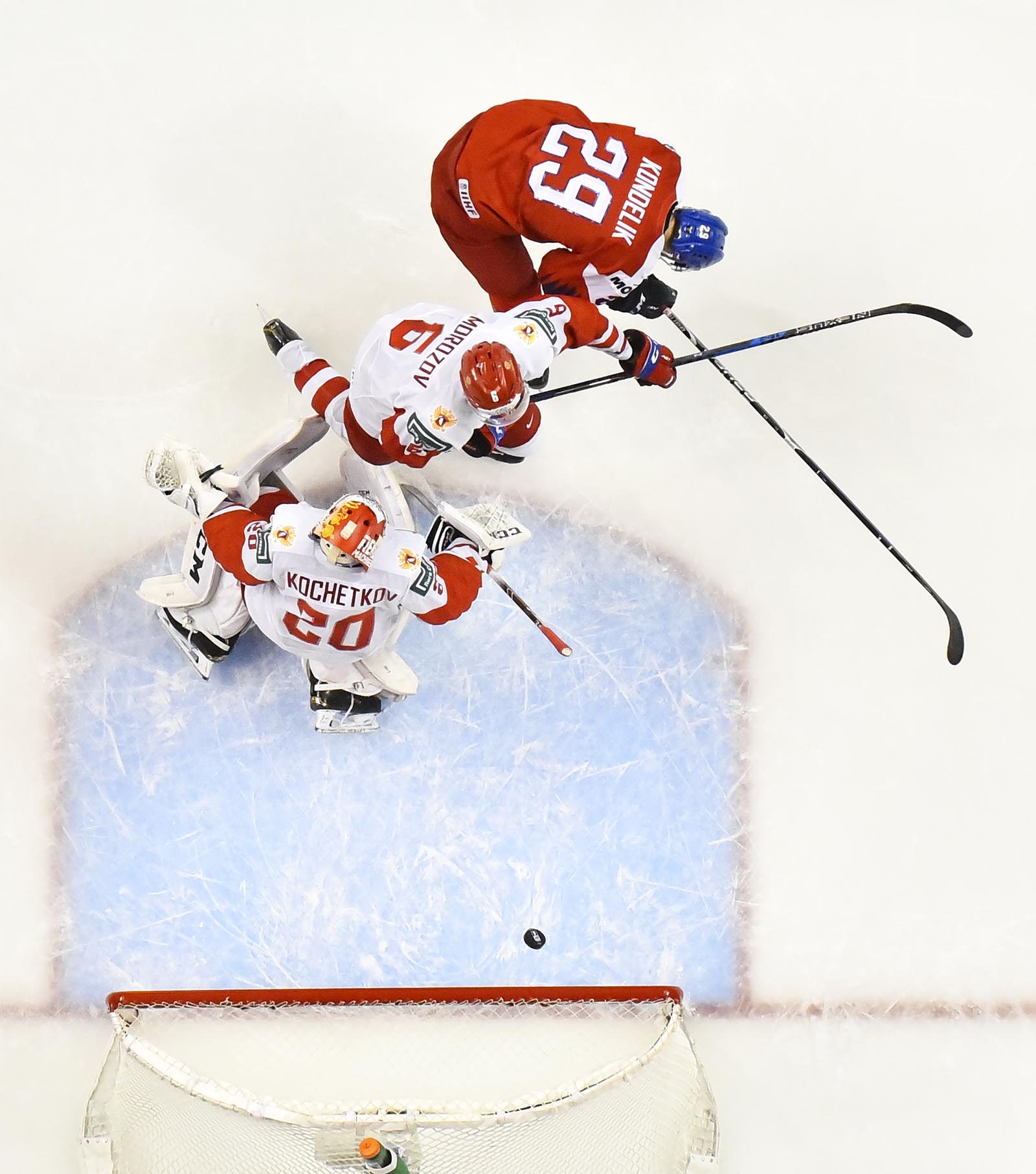 Kovalenko was slow to get up after his goal, but his pain was nothing compared to Kondelik’s. On the same power play, he was in front of the Russian goal when defenceman David Kvasnicka drilled a high shot towards the goal. Kondelik, tied up in front, couldn’t get out of the way. The puck hit him in the face and trickled over the goal line, making it a 2-1 game at 15:50 in the most painful way imaginable.