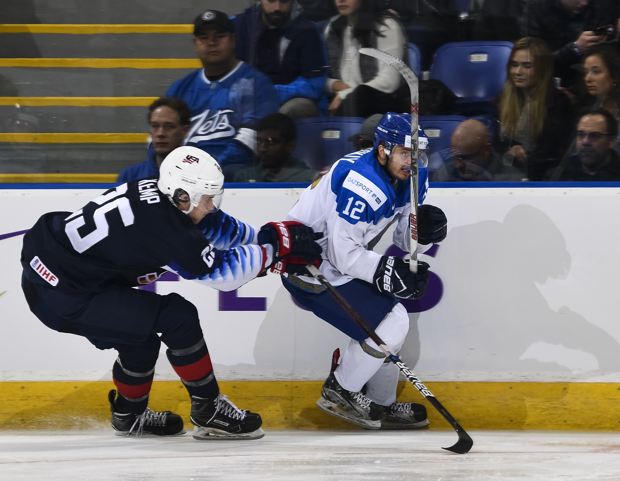 The Americans drew first blood at 1:37 off a faceoff in the Kazakh end. Poehling won the draw and got it back to Wahlstrom, who zinged it high past Nurek.