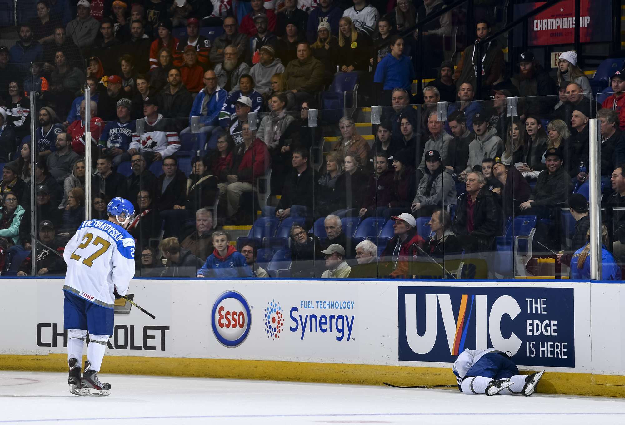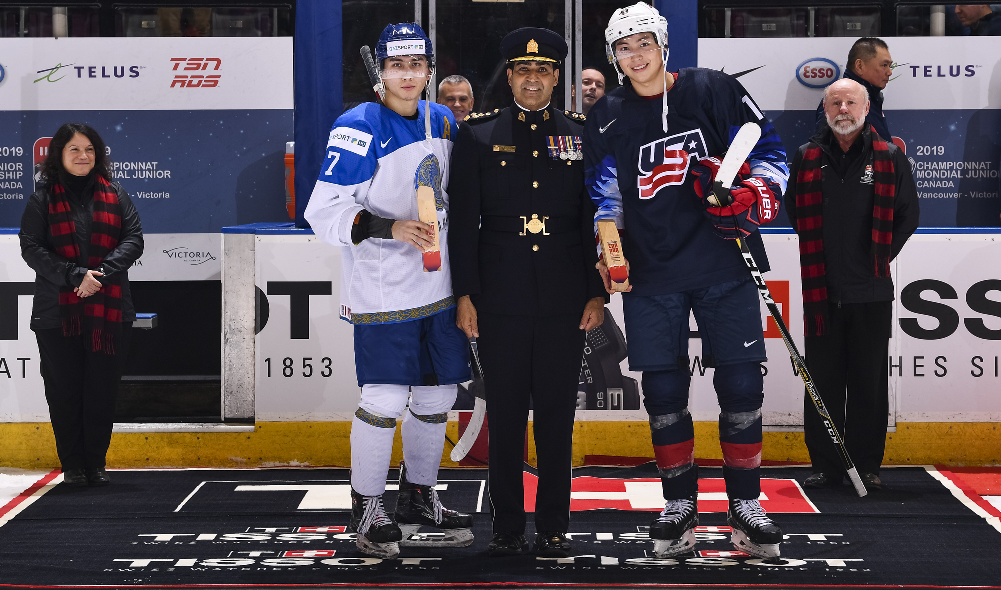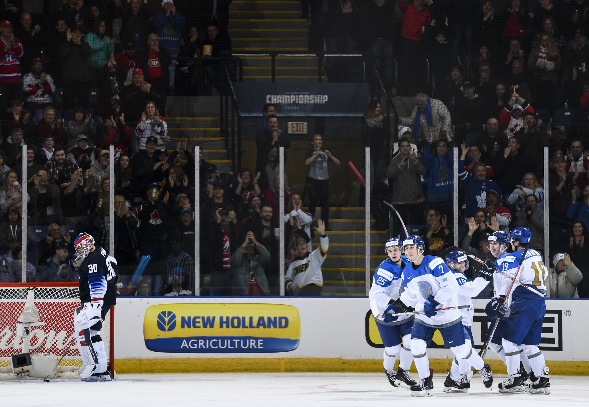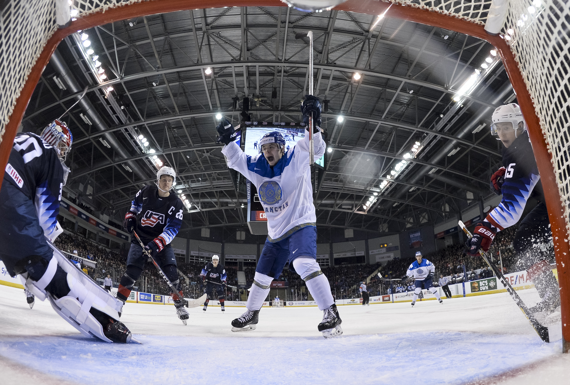 Just 18 seconds later, Kazakhstan knotted the score. Sprung by assistant captain Valeri Orekhov, Buyalski eluded the U.S. defence on a breakaway and slid one through Primeau. For the first time at these World Juniors, the former Soviet republic's goal song was played – Neil Diamond’s “Sweet Caroline” – and the pro-underdog Victoria crowd of 6,185 belted it out.