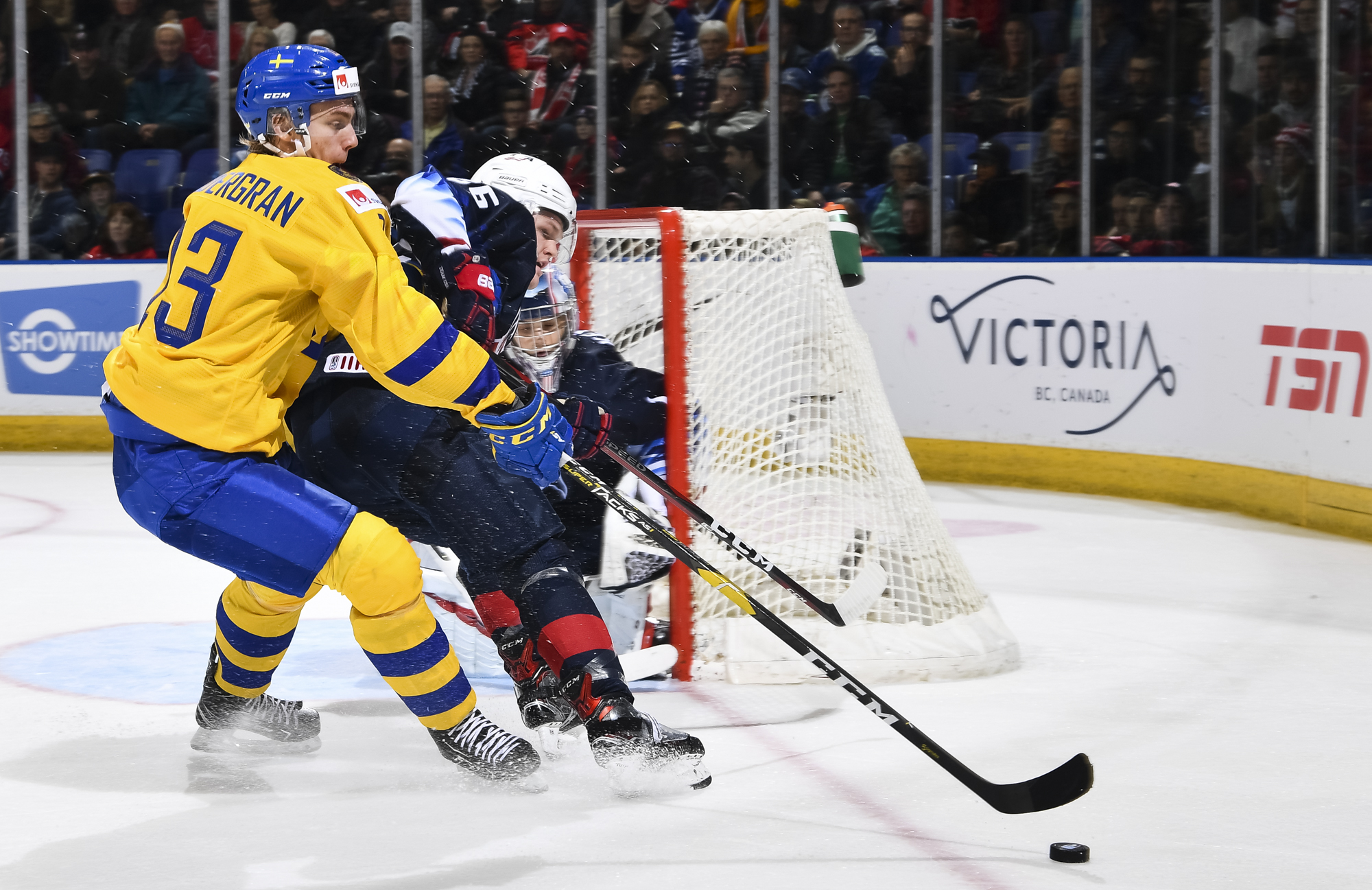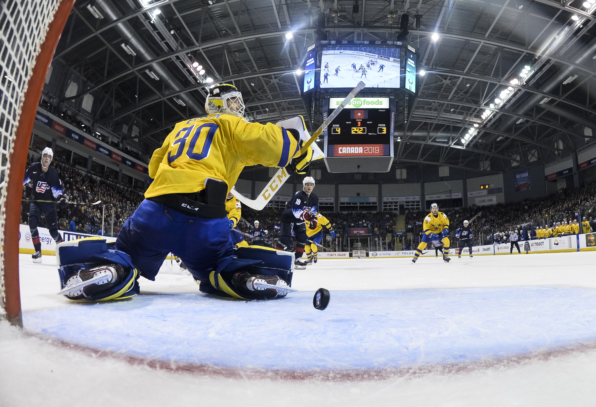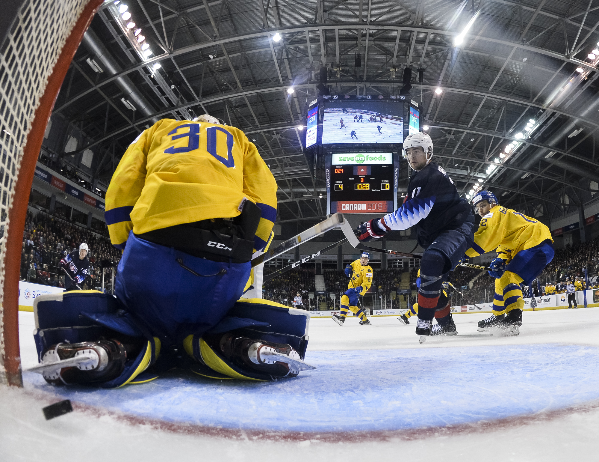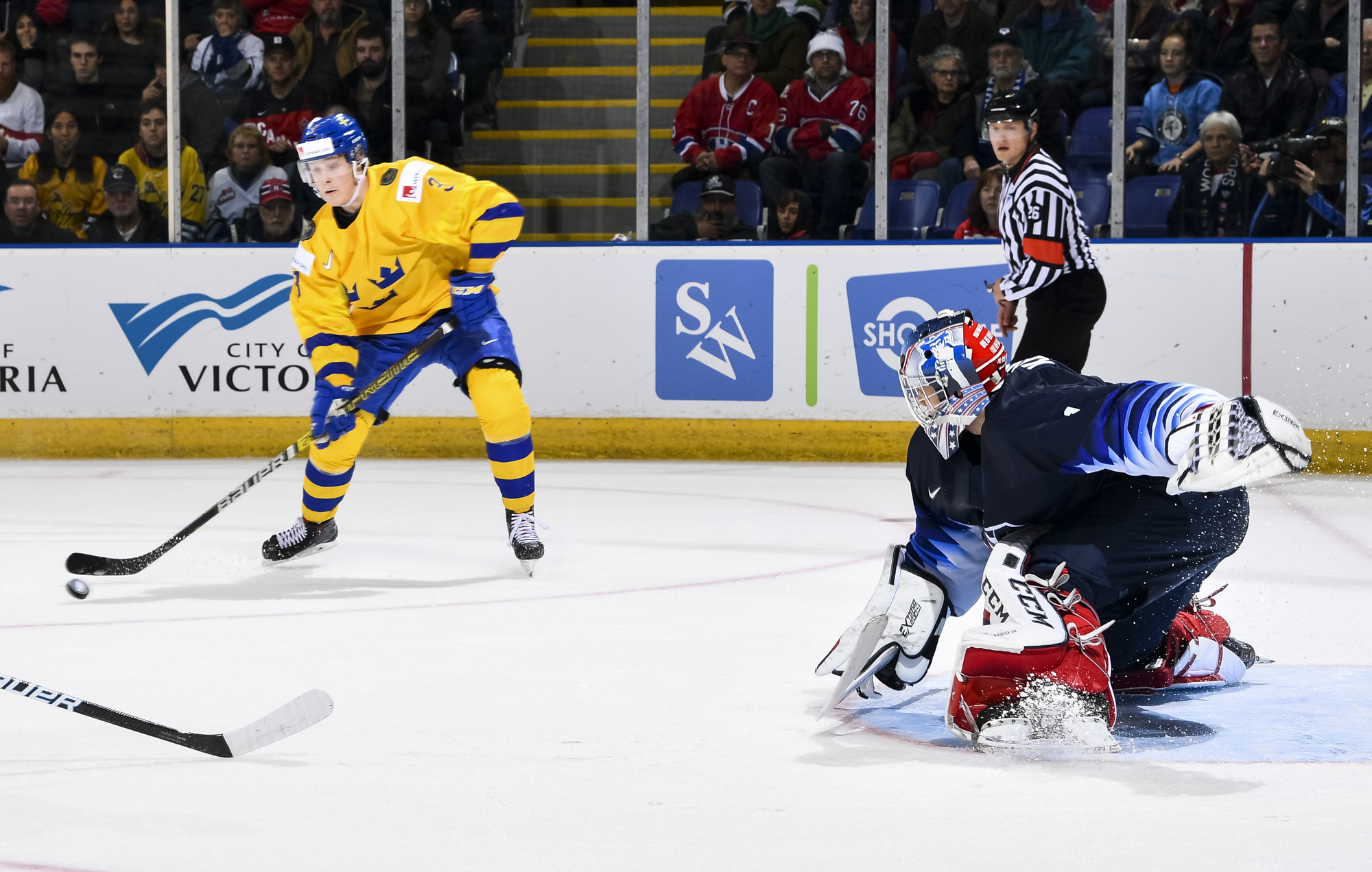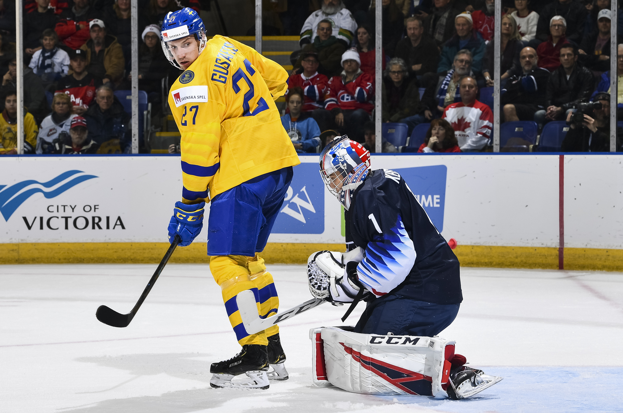 Reflecting the cross-border rivalry between Canada and the U.S., the Victoria crowd of 6,602 chanted, “Let’s go, Sweden!” The Swedes got a 5-on-3 for 1:56 after Josh Norris took a cross-checking minor and Dylan Samberg promptly shot the puck over the glass. But Monten’s boys were ineffective, overpassing the puck and handing it away to the Americans.