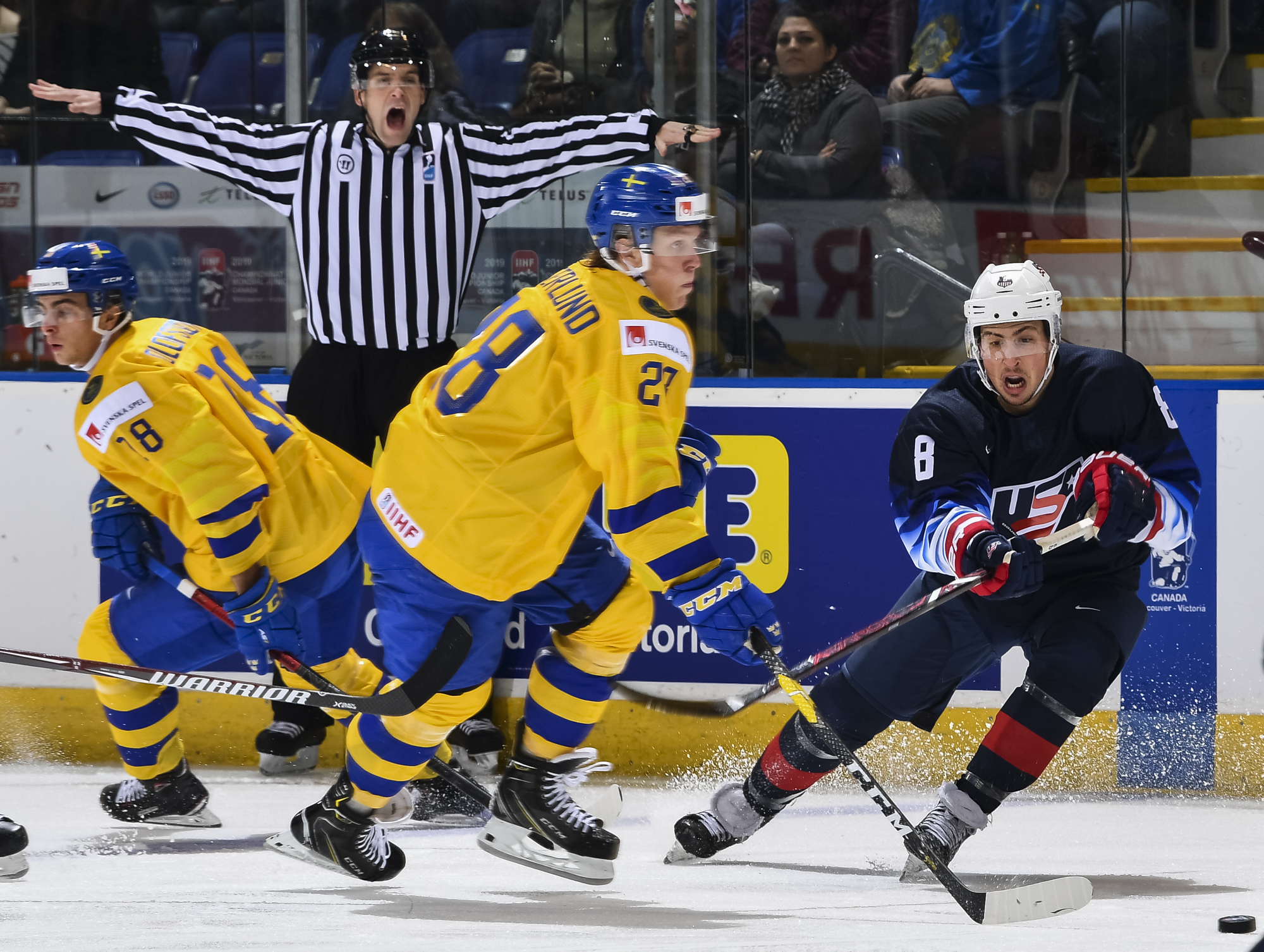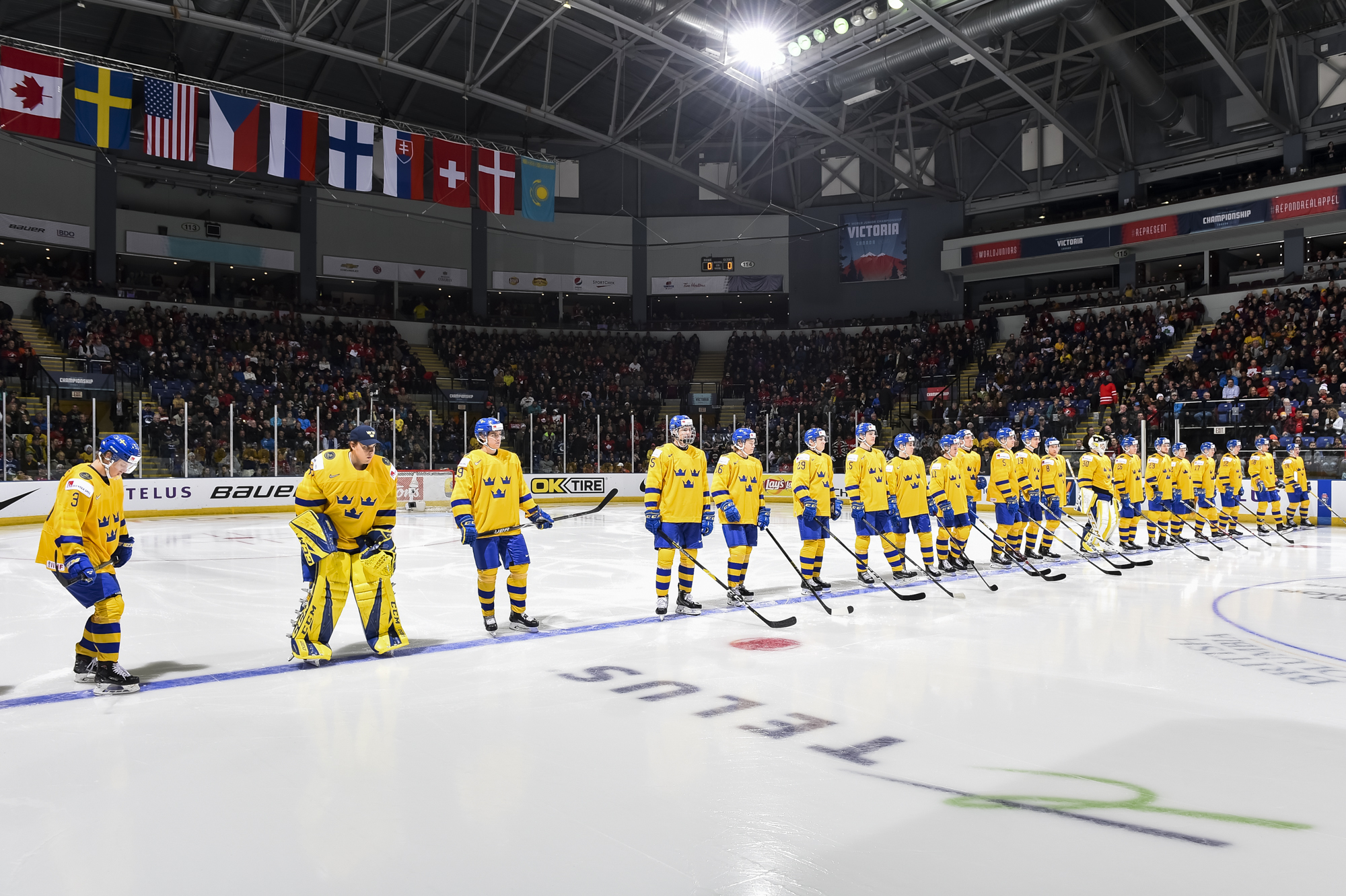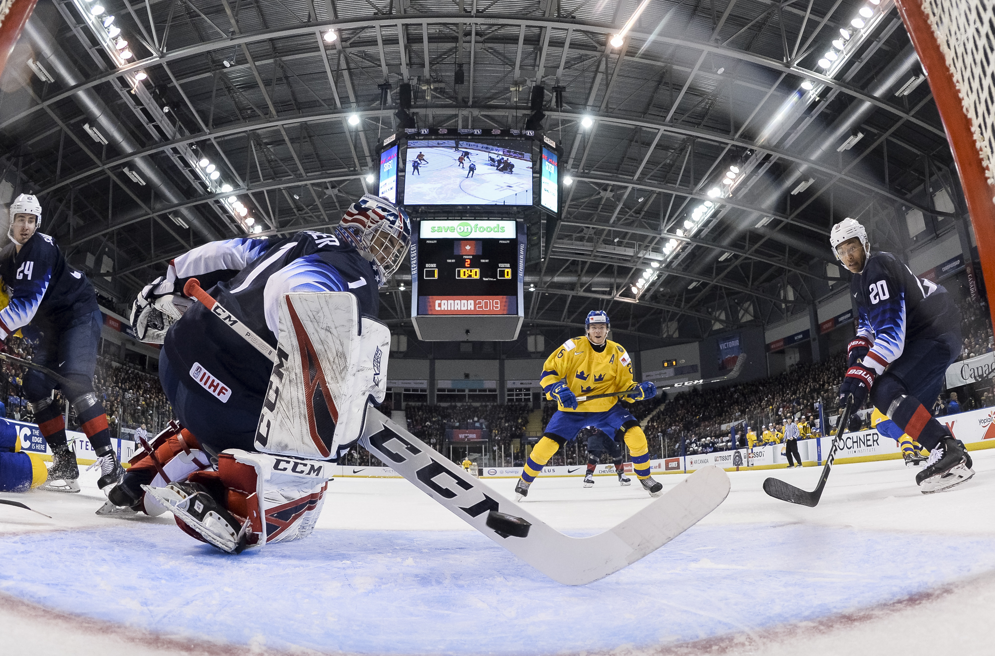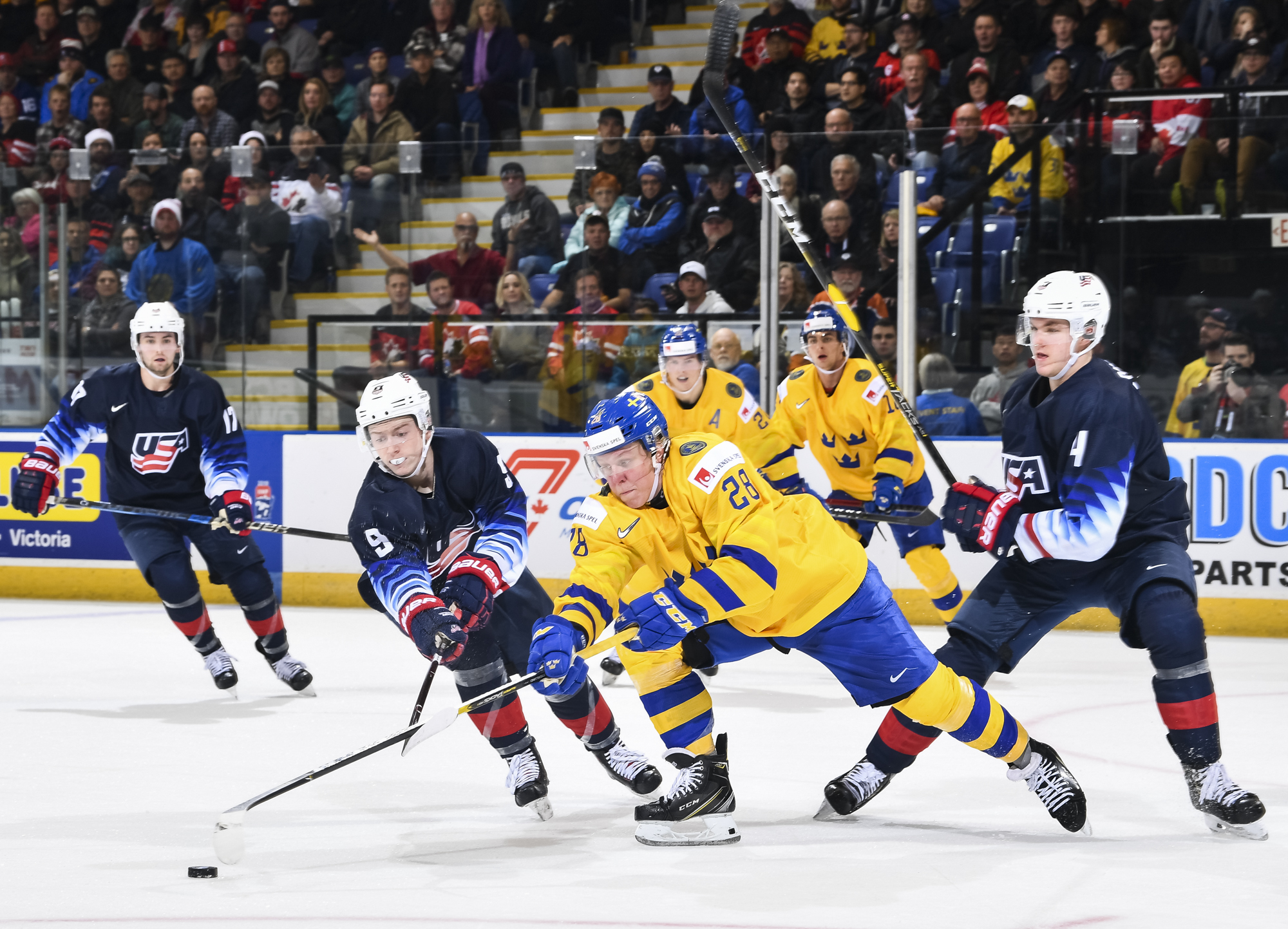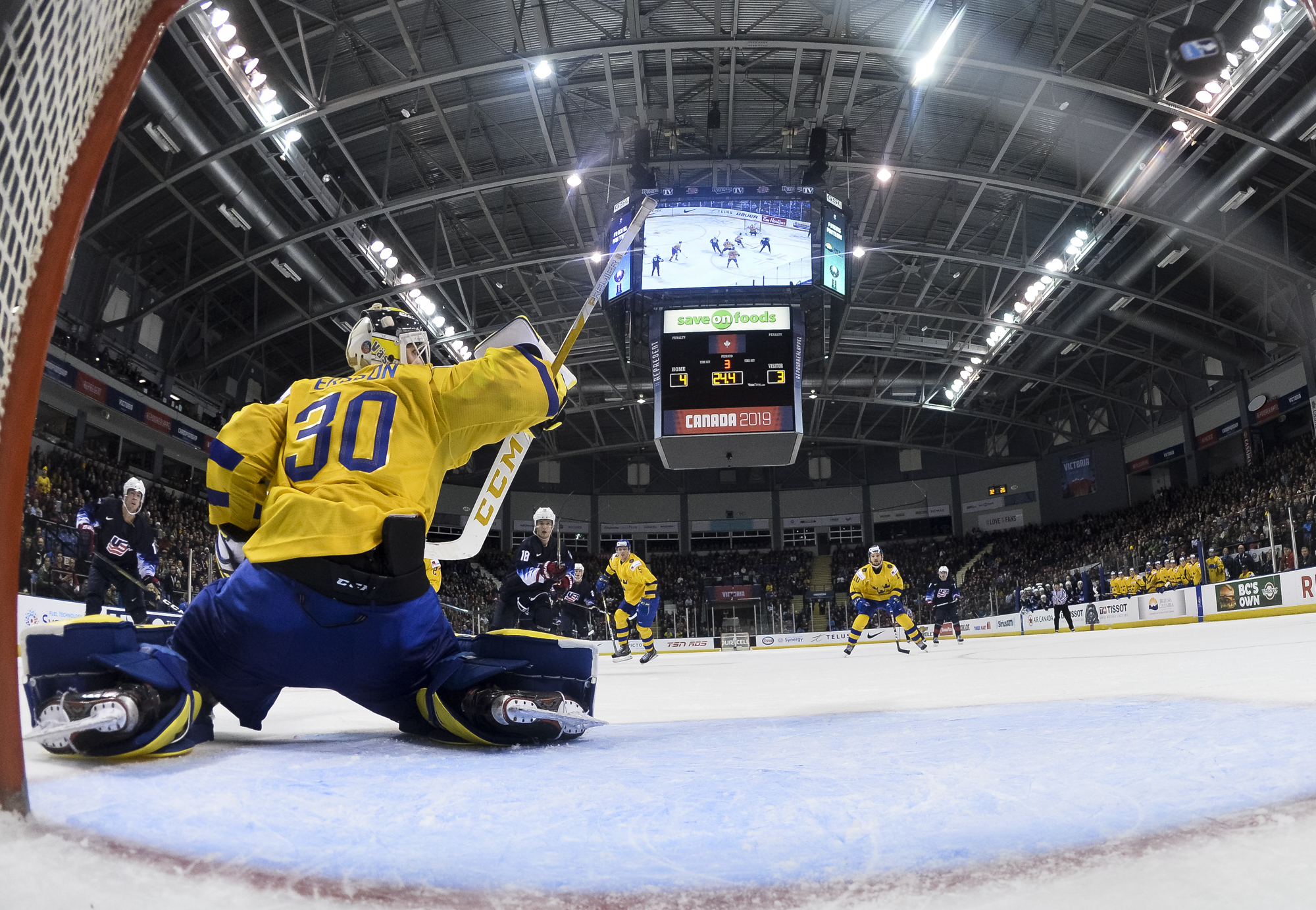 Reflecting the cross-border rivalry between Canada and the U.S., the Victoria crowd of 6,602 chanted, “Let’s go, Sweden!” The Swedes got a 5-on-3 for 1:56 after Josh Norris took a cross-checking minor and Dylan Samberg promptly shot the puck over the glass. But Monten’s boys were ineffective, overpassing the puck and handing it away to the Americans.