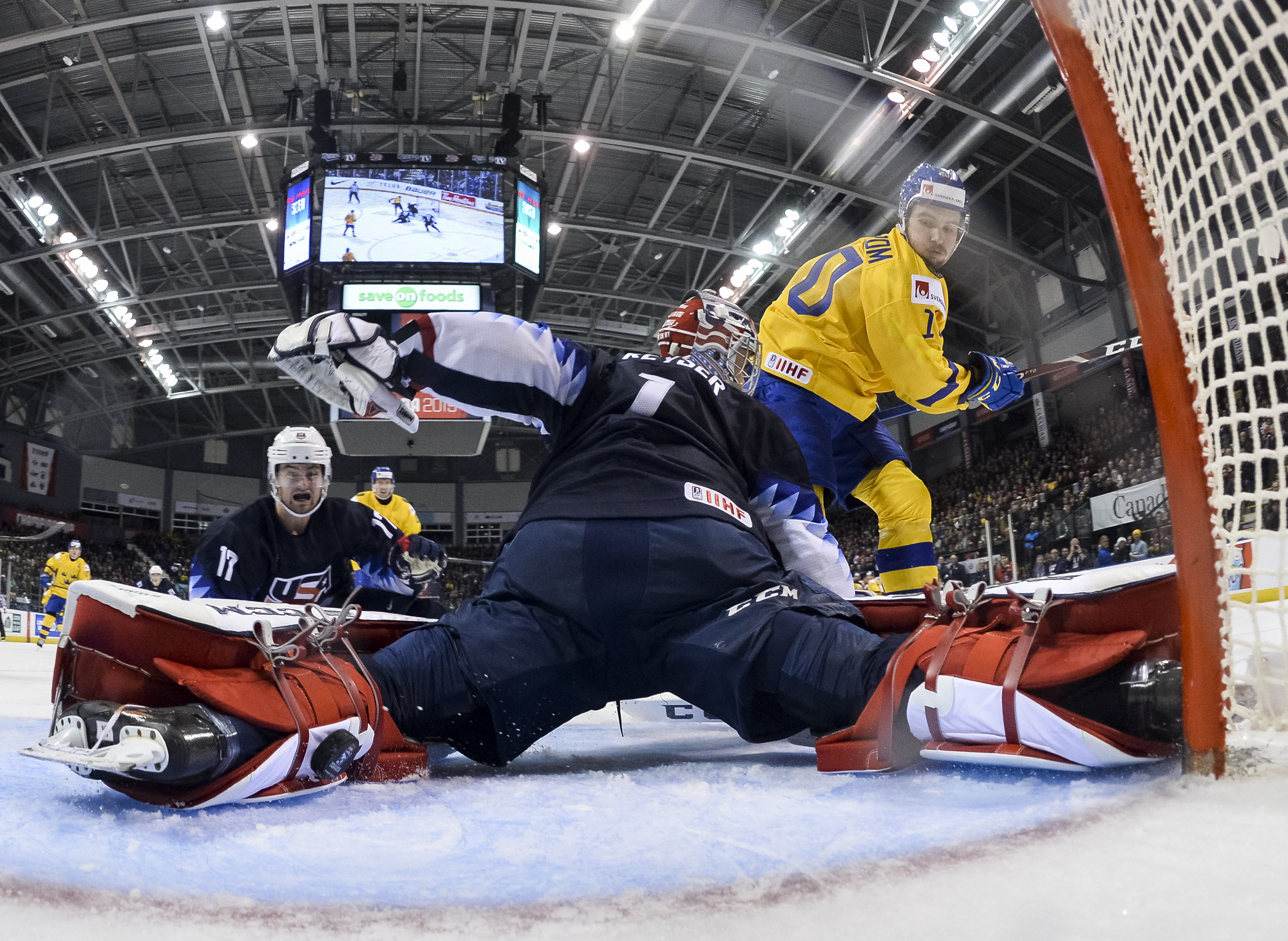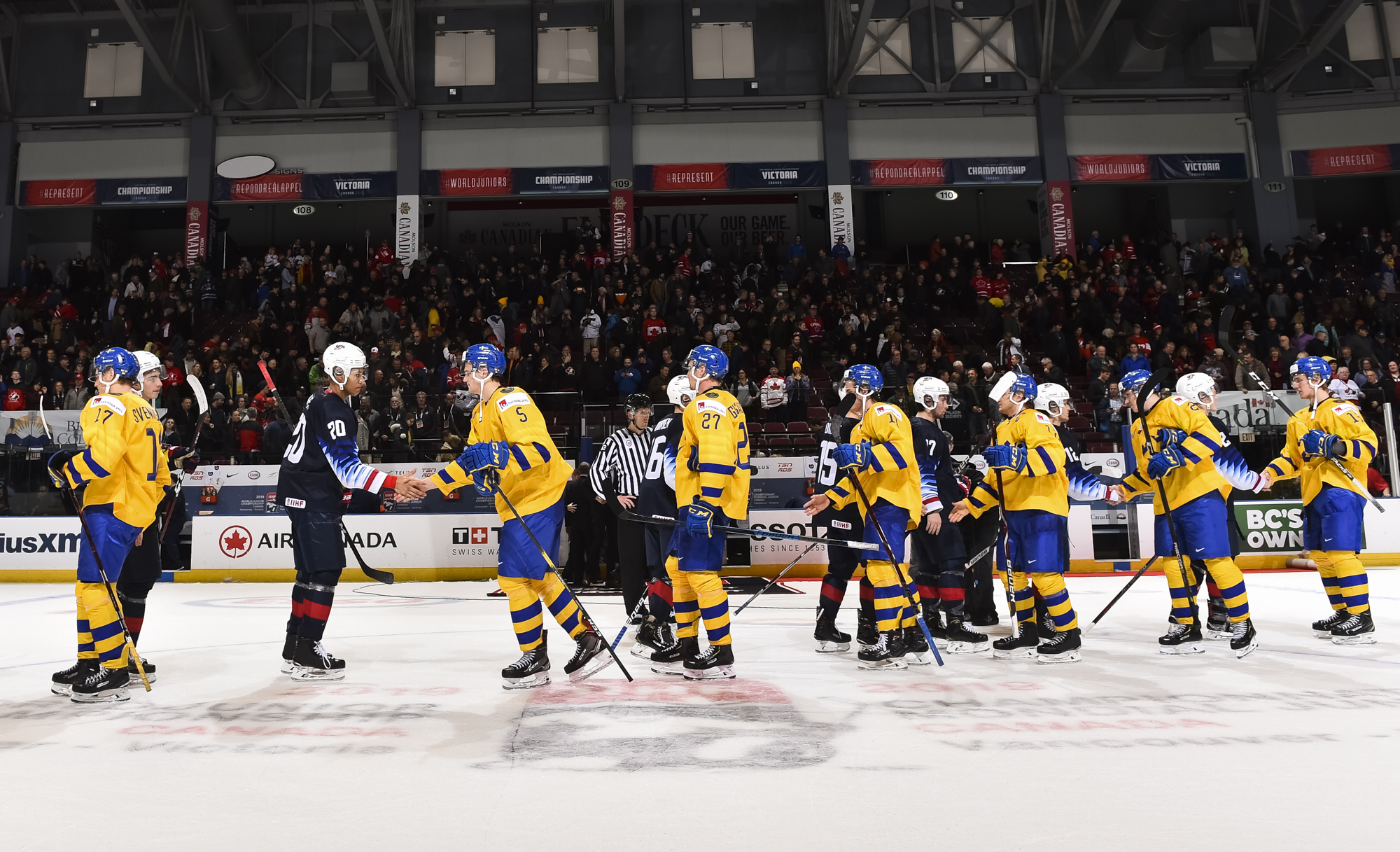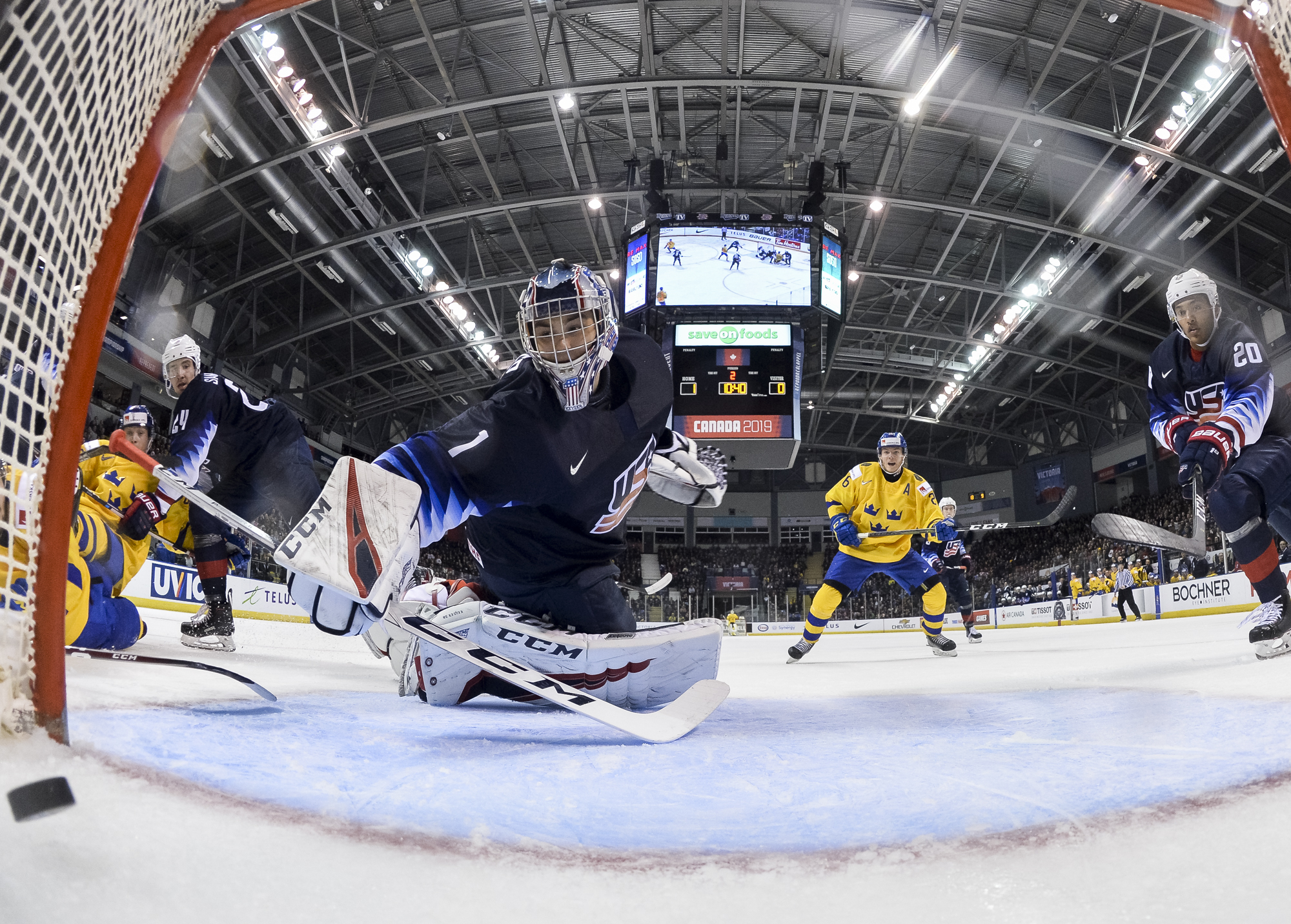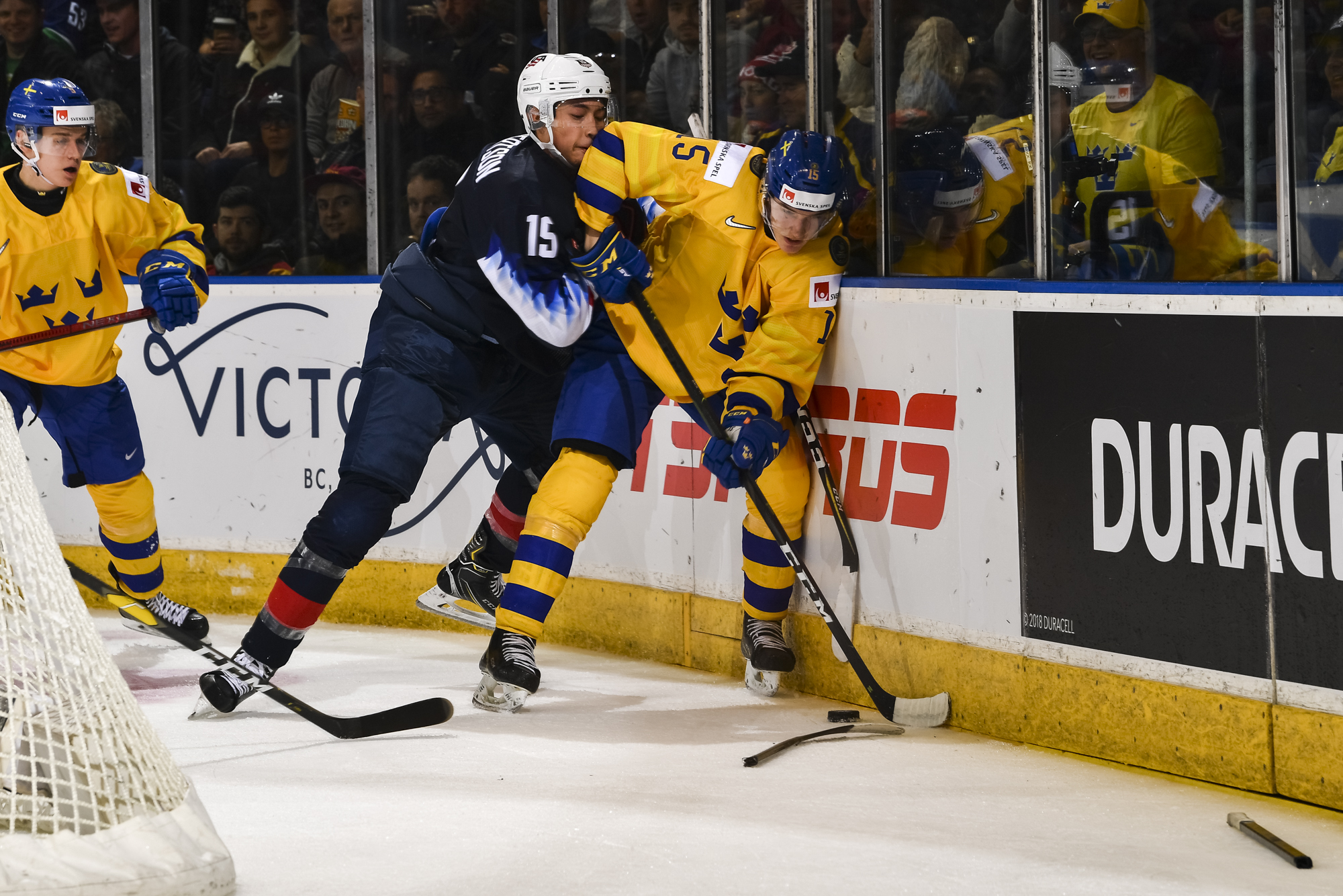 Reflecting the cross-border rivalry between Canada and the U.S., the Victoria crowd of 6,602 chanted, “Let’s go, Sweden!” The Swedes got a 5-on-3 for 1:56 after Josh Norris took a cross-checking minor and Dylan Samberg promptly shot the puck over the glass. But Monten’s boys were ineffective, overpassing the puck and handing it away to the Americans.