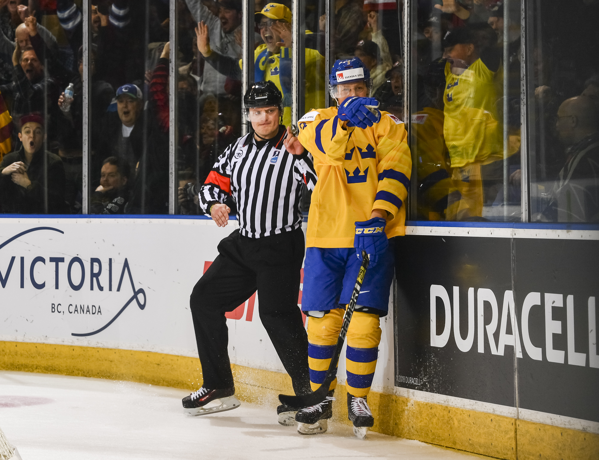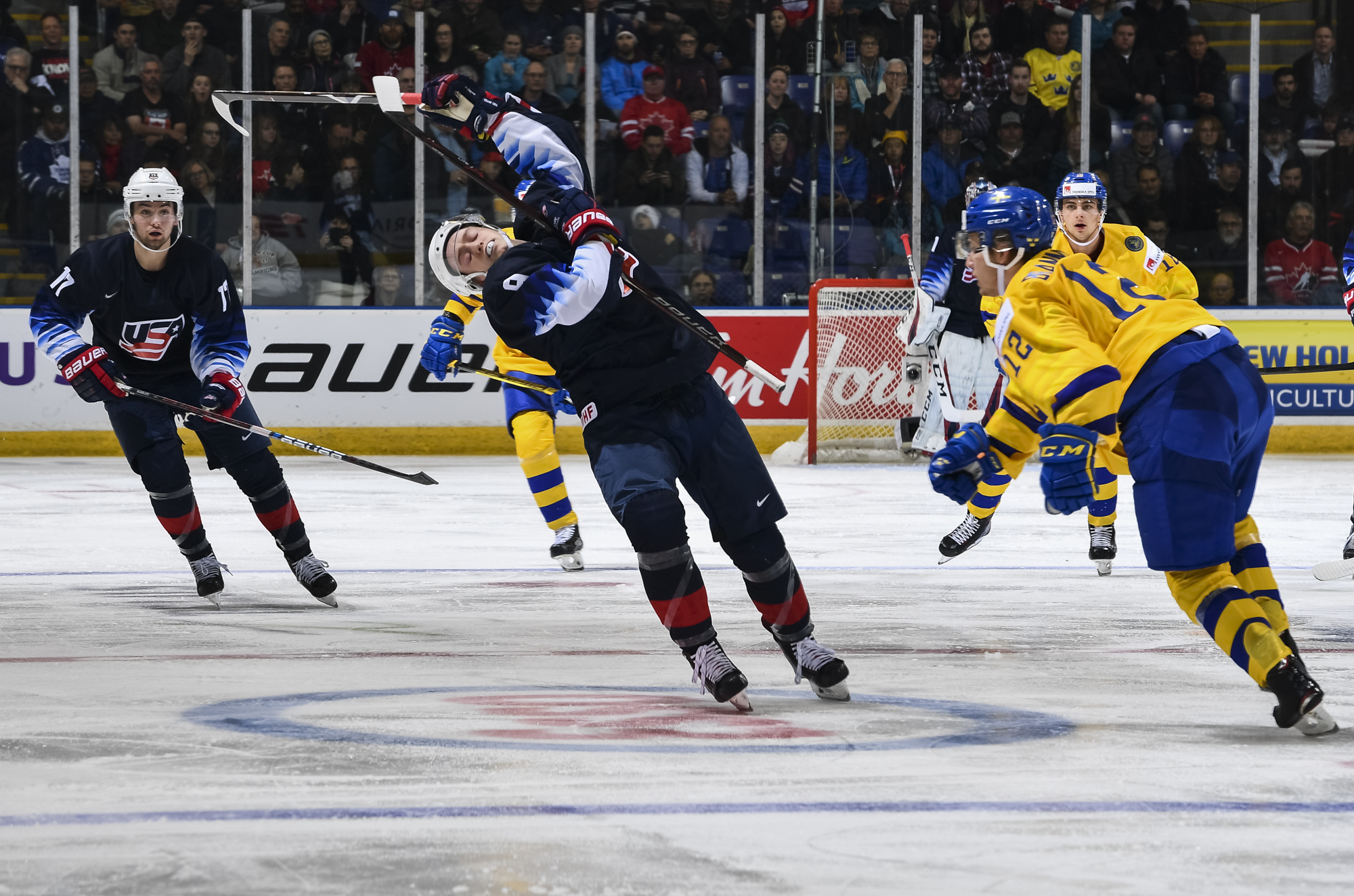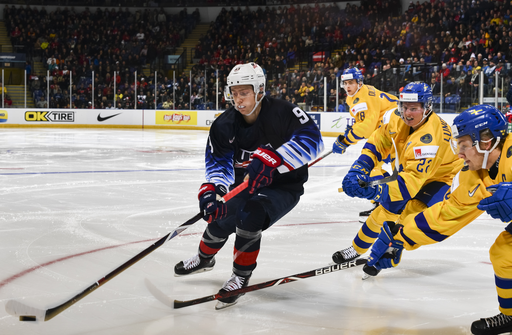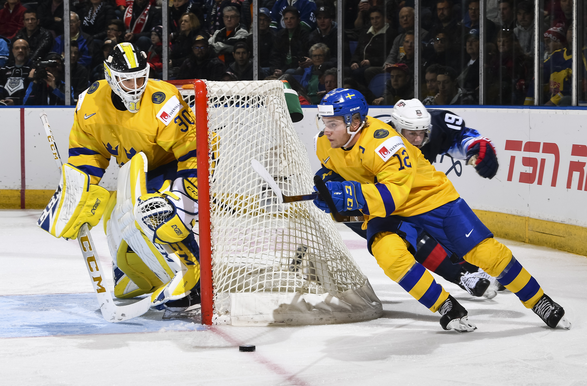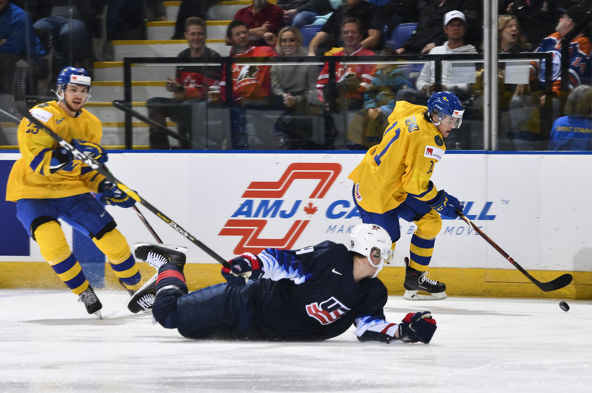 Reflecting the cross-border rivalry between Canada and the U.S., the Victoria crowd of 6,602 chanted, “Let’s go, Sweden!” The Swedes got a 5-on-3 for 1:56 after Josh Norris took a cross-checking minor and Dylan Samberg promptly shot the puck over the glass. But Monten’s boys were ineffective, overpassing the puck and handing it away to the Americans.