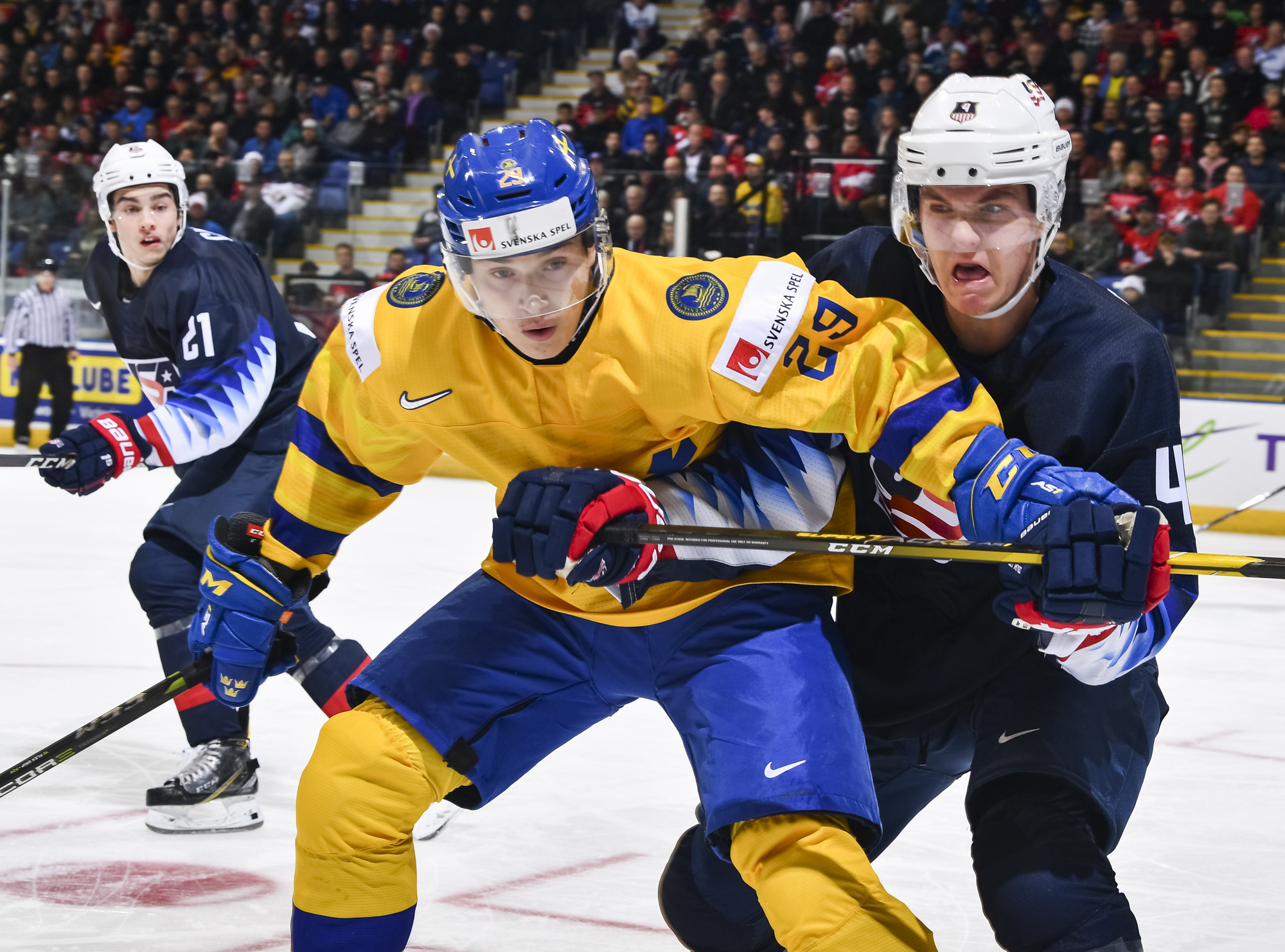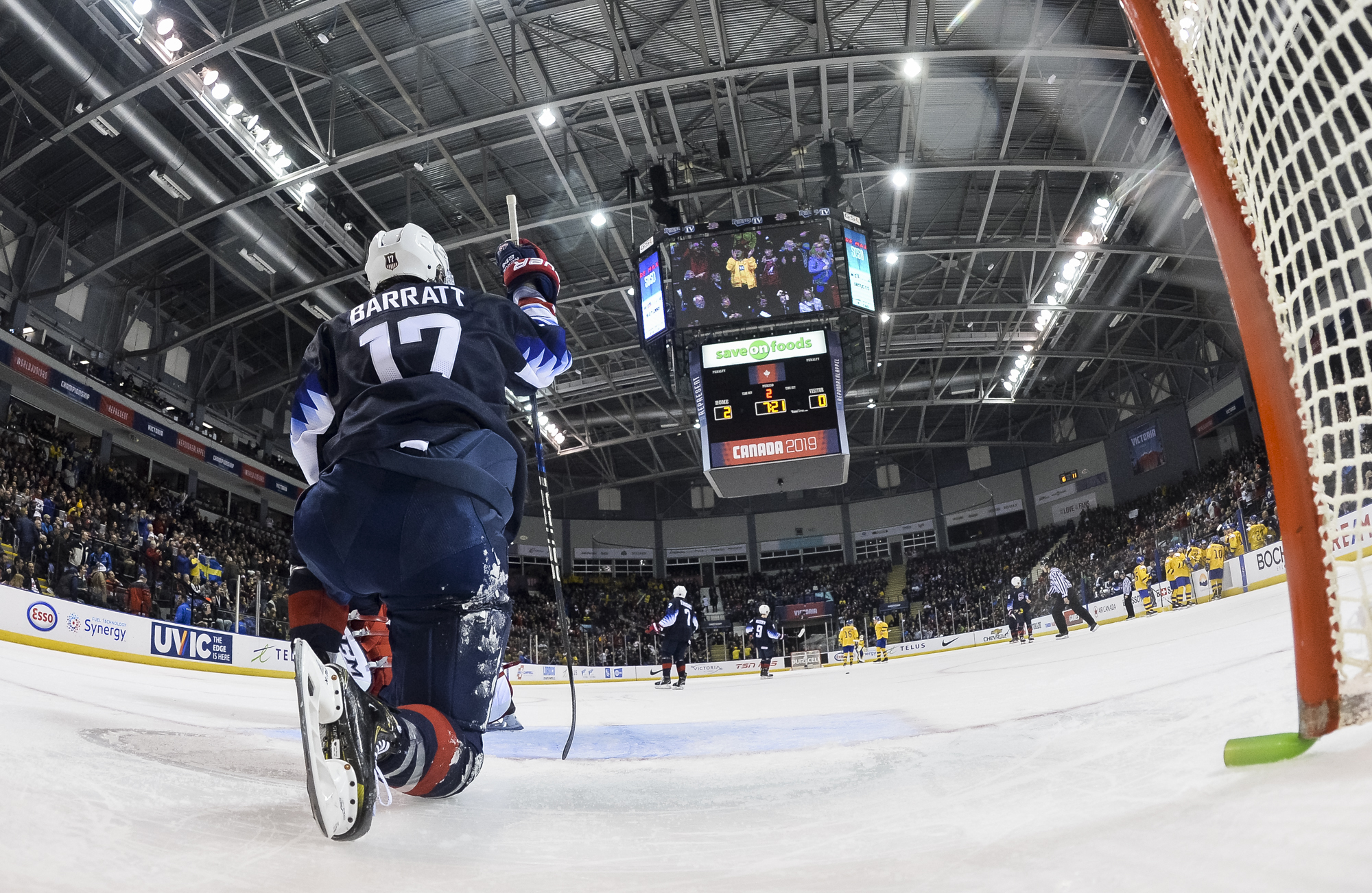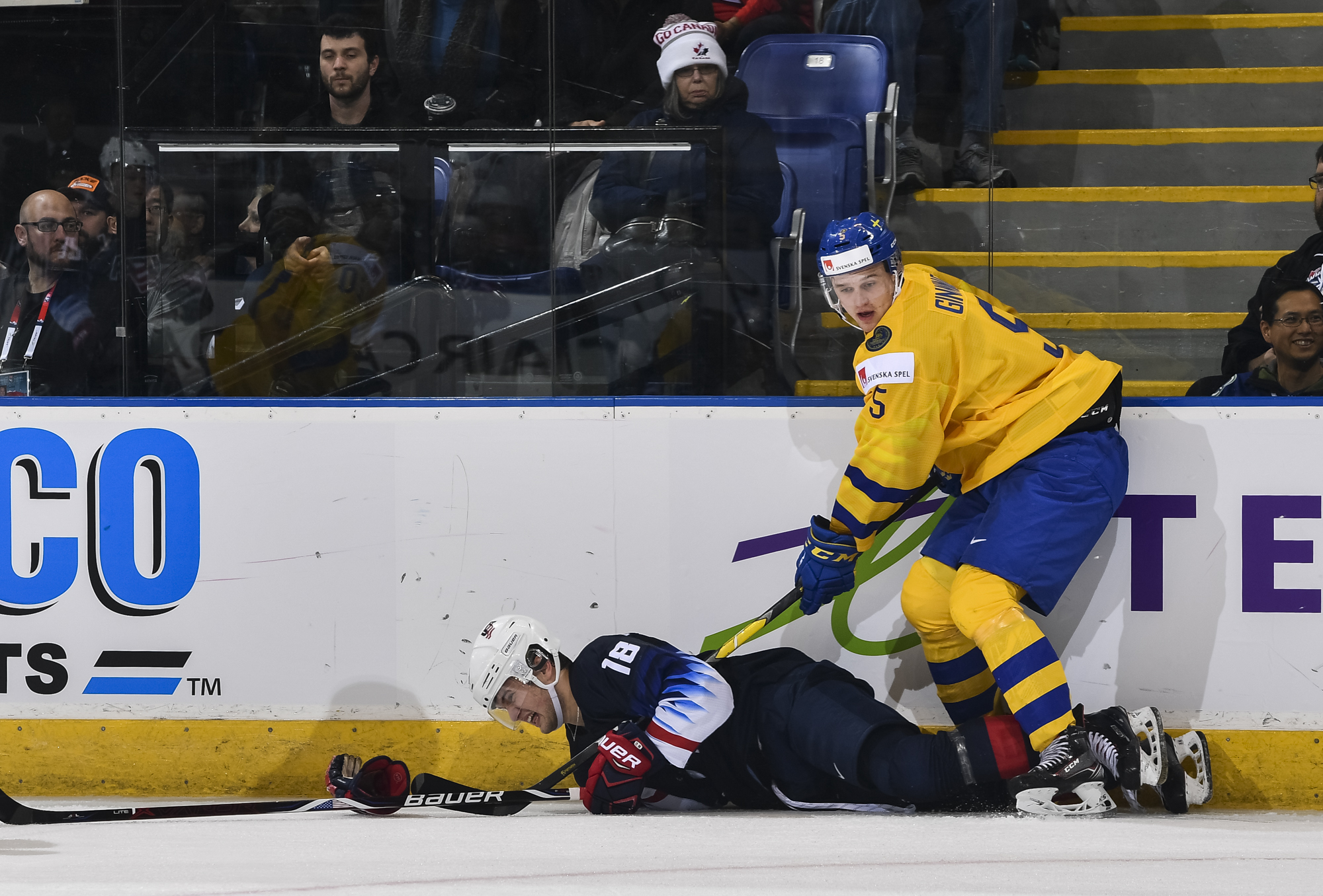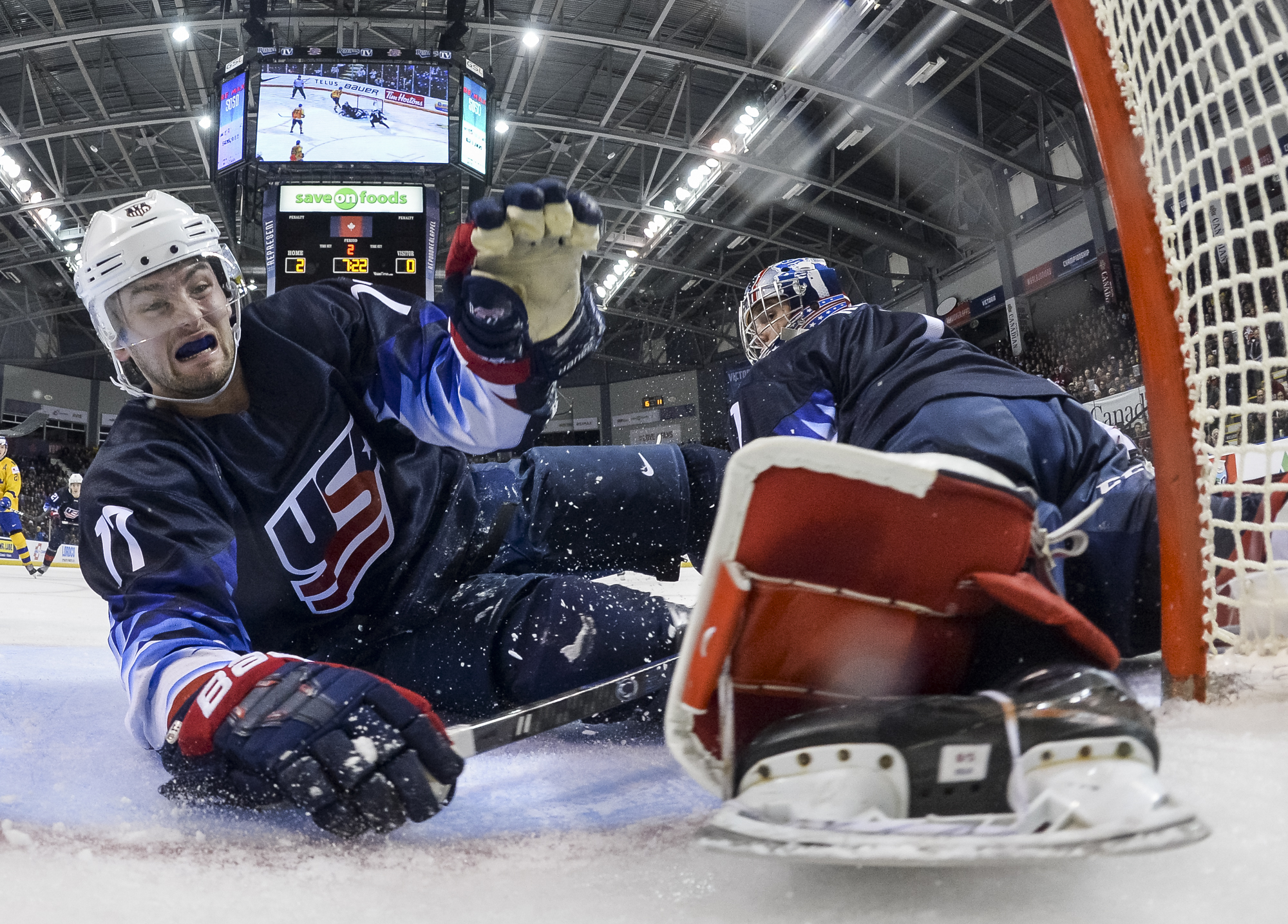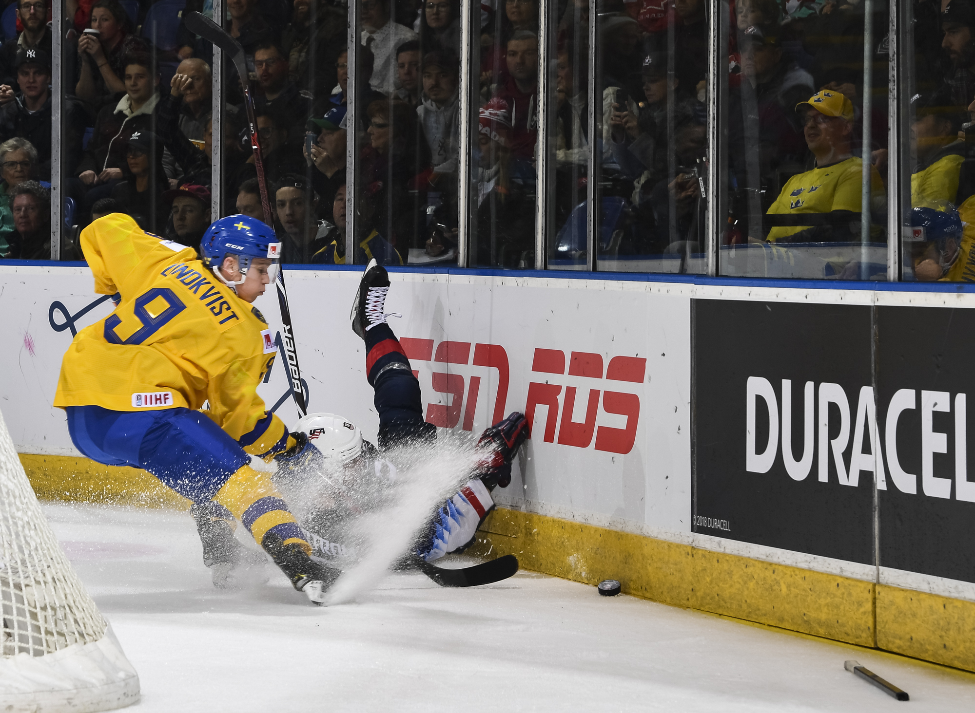 Reflecting the cross-border rivalry between Canada and the U.S., the Victoria crowd of 6,602 chanted, “Let’s go, Sweden!” The Swedes got a 5-on-3 for 1:56 after Josh Norris took a cross-checking minor and Dylan Samberg promptly shot the puck over the glass. But Monten’s boys were ineffective, overpassing the puck and handing it away to the Americans.