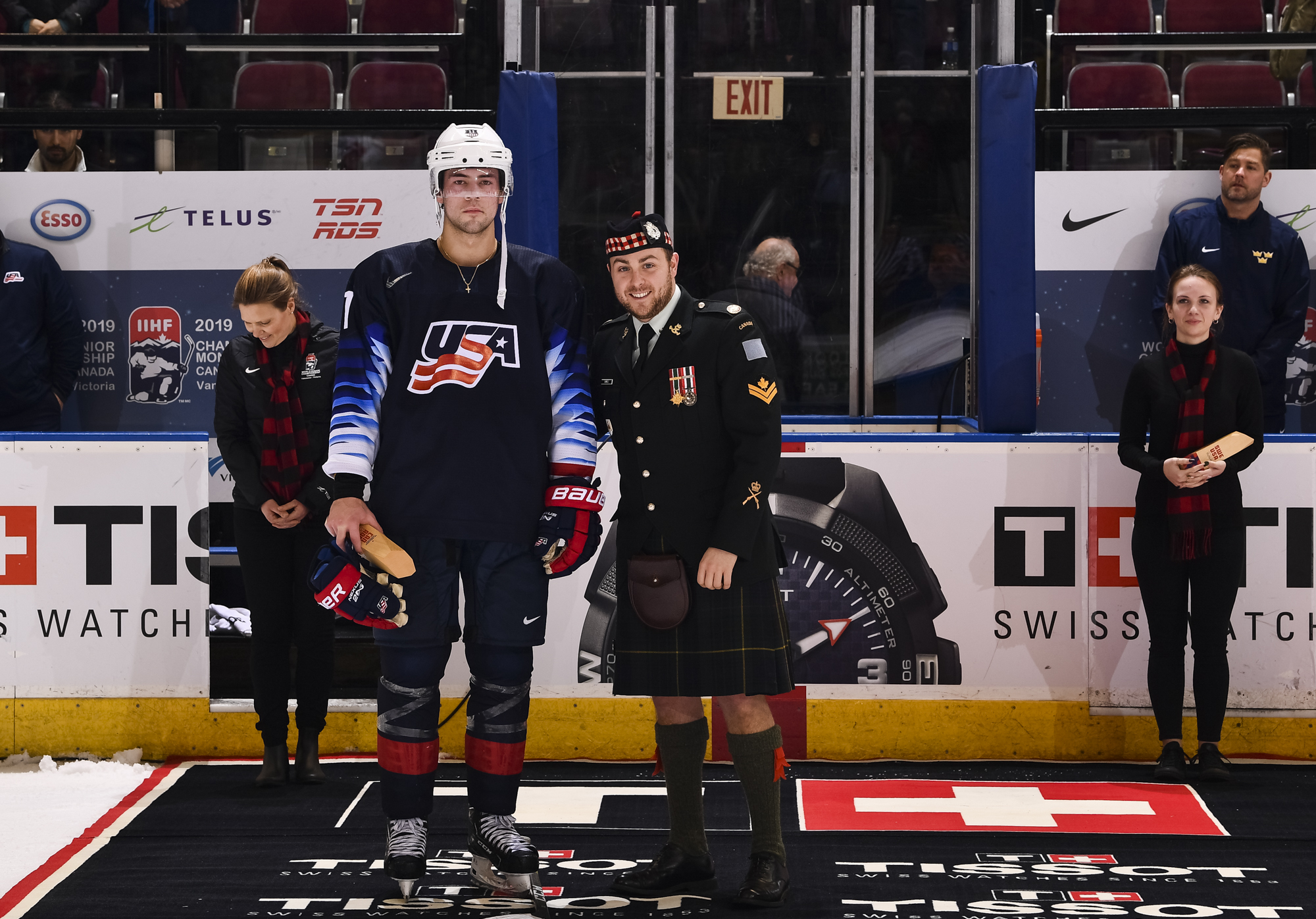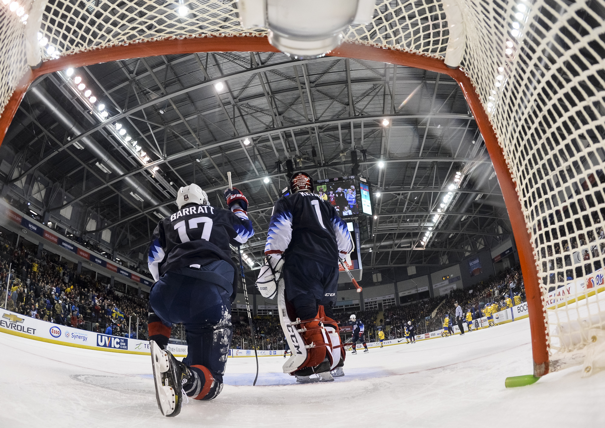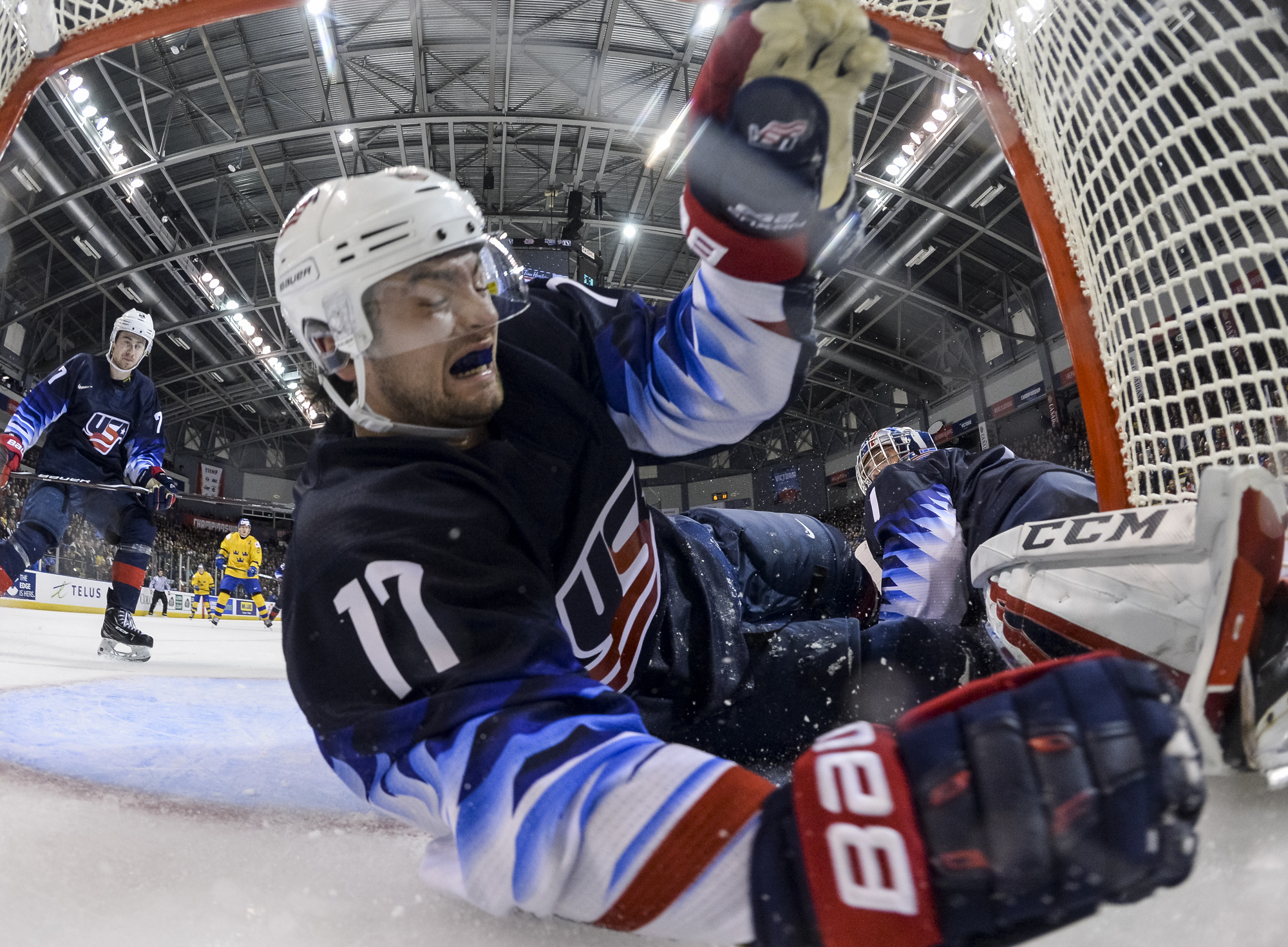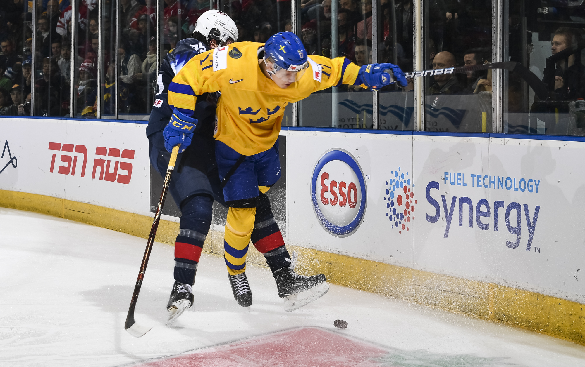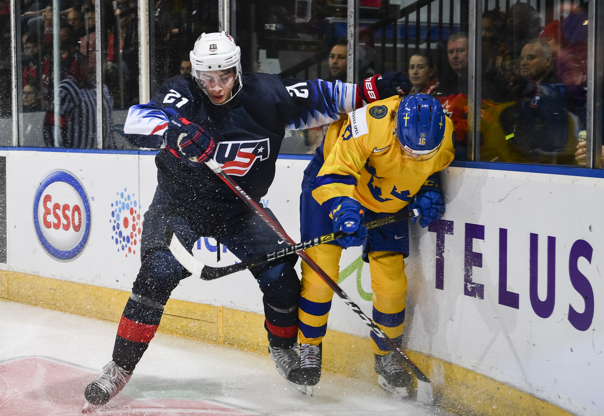 Reflecting the cross-border rivalry between Canada and the U.S., the Victoria crowd of 6,602 chanted, “Let’s go, Sweden!” The Swedes got a 5-on-3 for 1:56 after Josh Norris took a cross-checking minor and Dylan Samberg promptly shot the puck over the glass. But Monten’s boys were ineffective, overpassing the puck and handing it away to the Americans.
