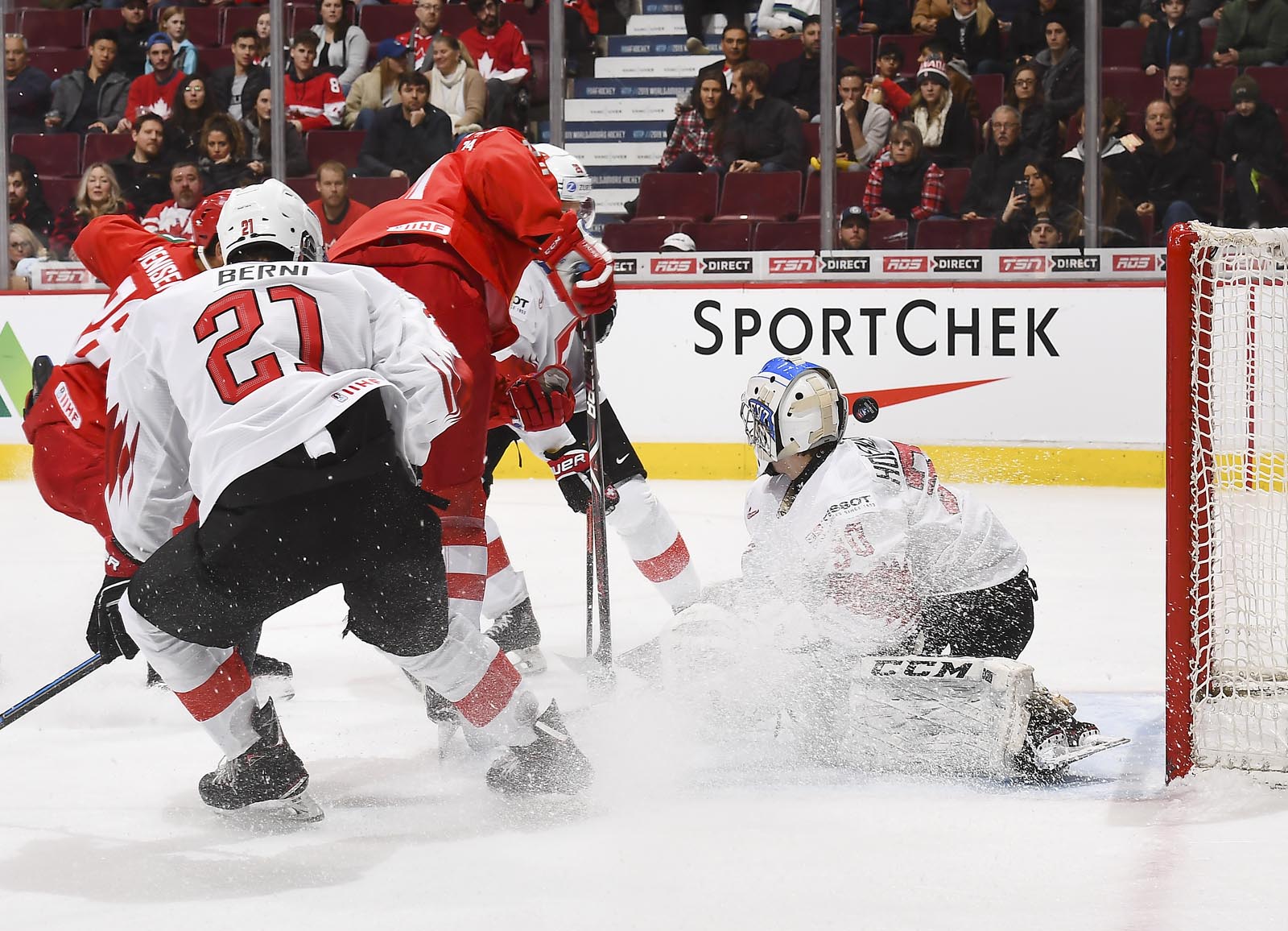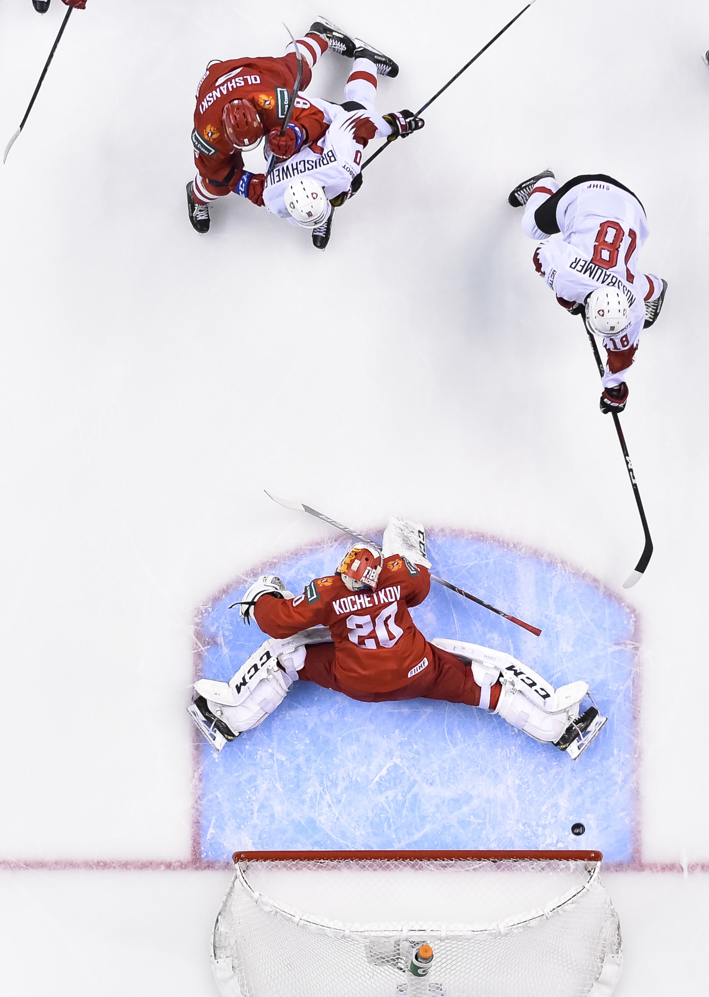 The Swiss refused to wilt. Less than three minutes later, Kochetkov made two stunning, Dominik Hasek-like saves in tight on Justin Sigrist, but the puck flew up in the air and Bruschweiler batted it in baseball-style to make it 3-2.