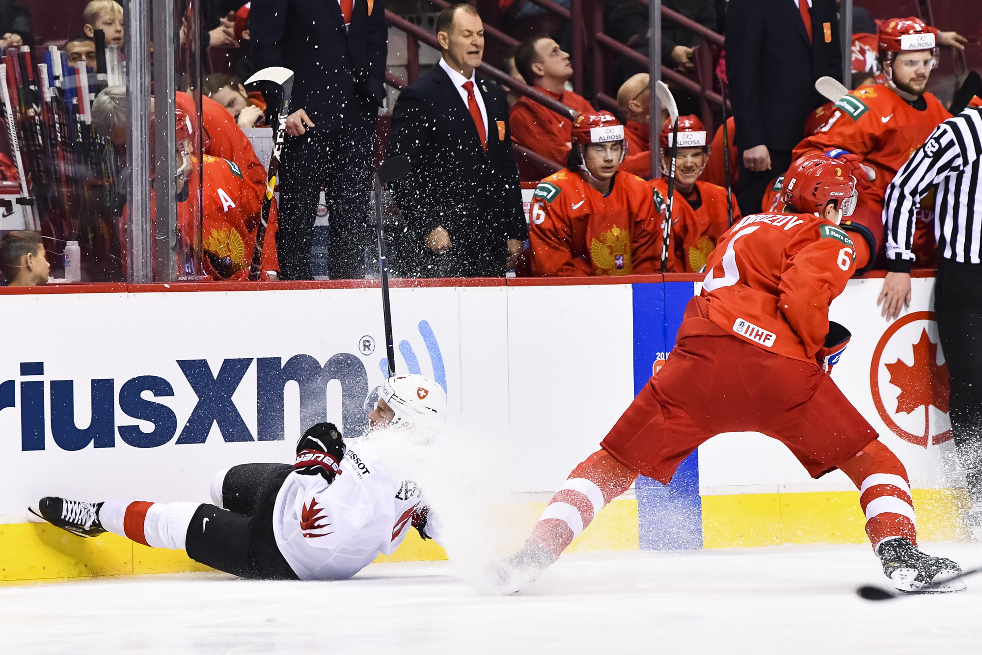 In the second period, Switzerland jacked up its urgency and got on the board at 4:54. The Russians unwisely left another Swiss forward, Nussbaumer, unguarded at the crease. He accepted defenceman Simon le Coultre's pass from the blue line, pivoted to the forehand and tucked it past Kochetkov.