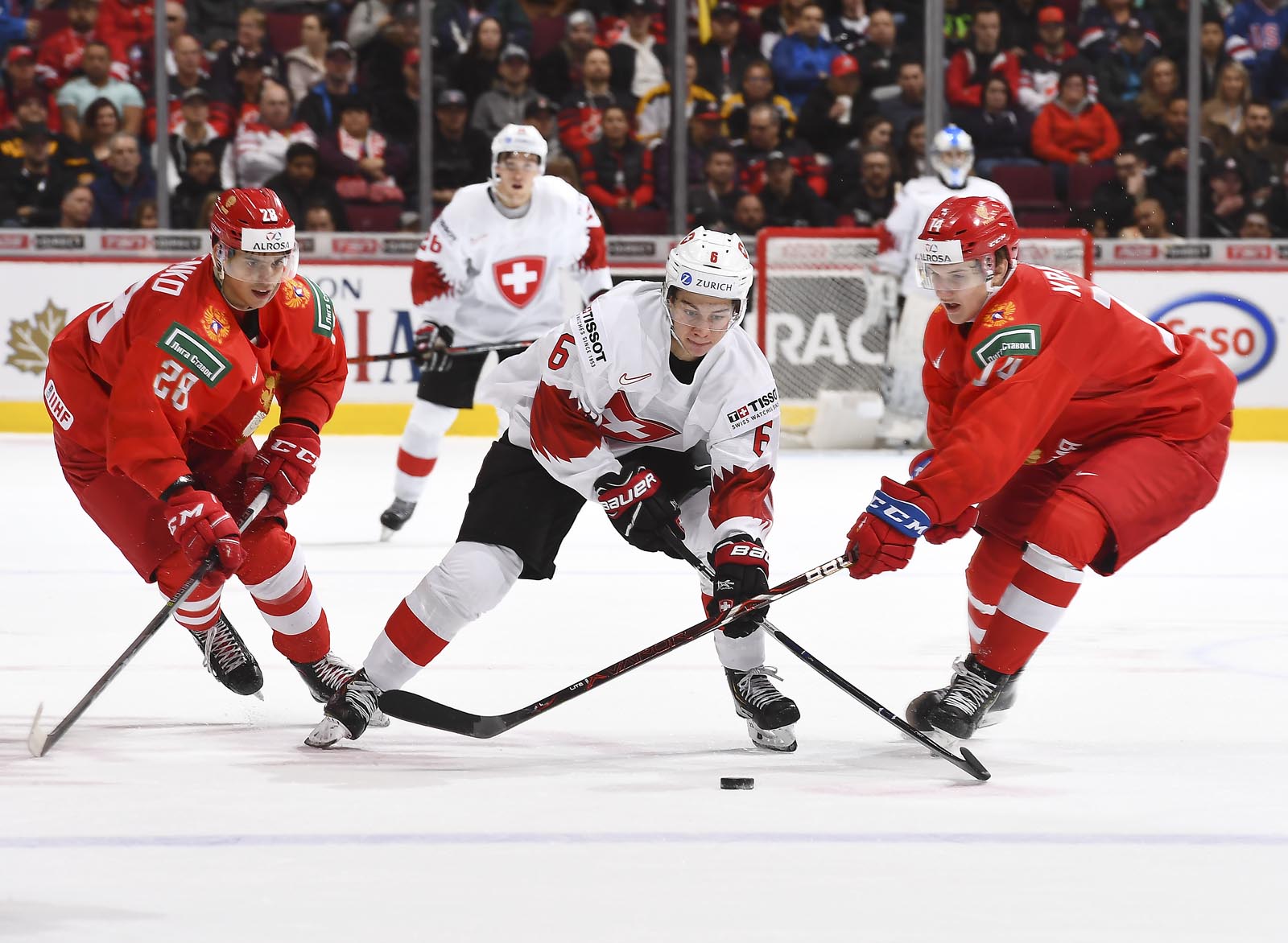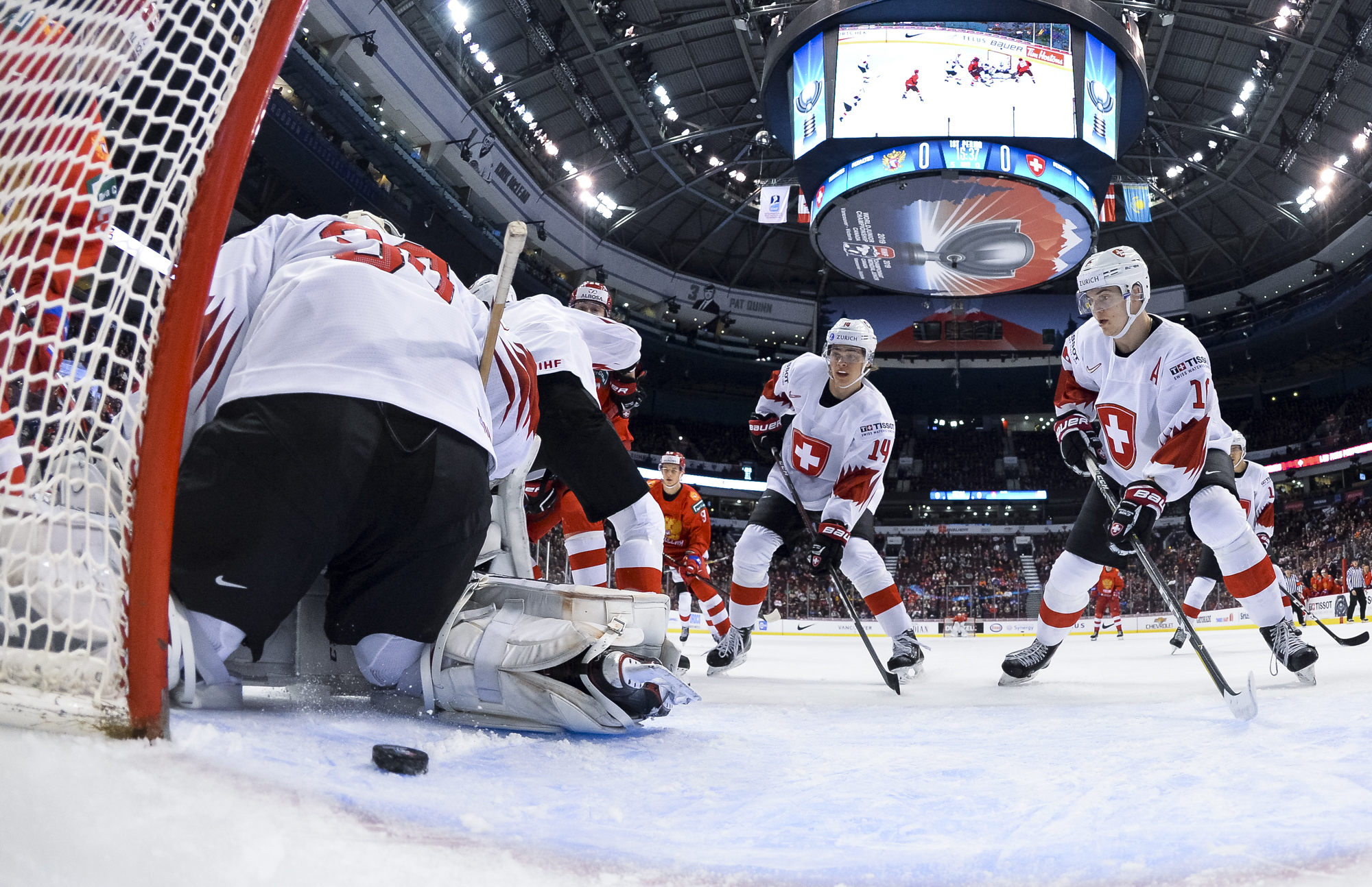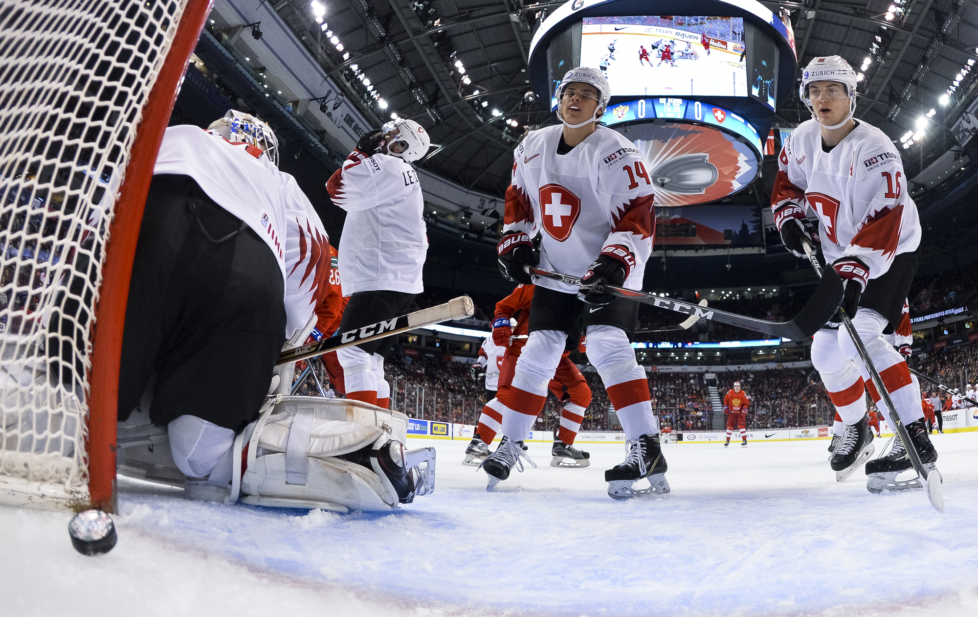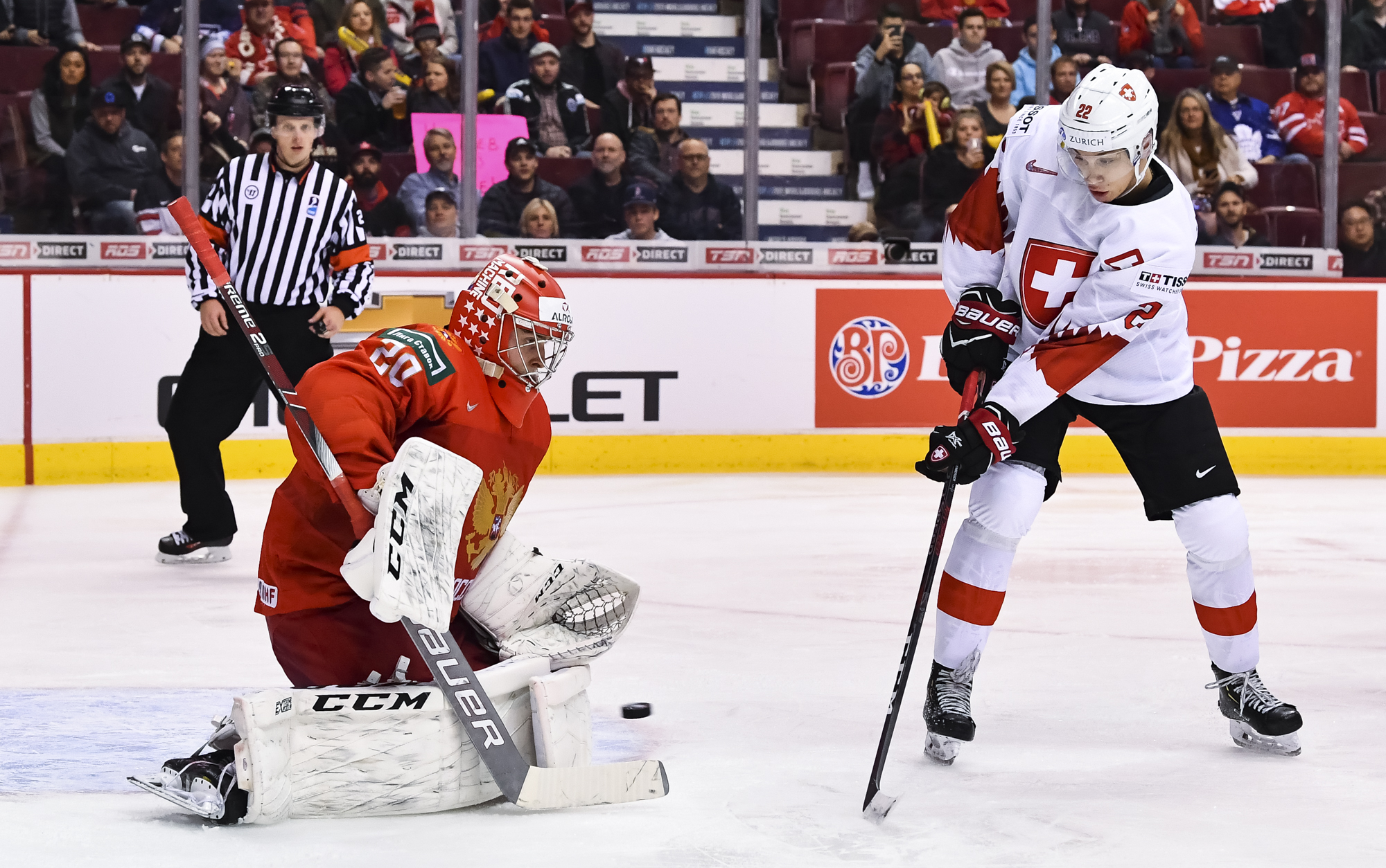 In the early game in Vancouver, the underdog Swiss hung tough with the Russians till the end, but just couldn't come up with enough offence.