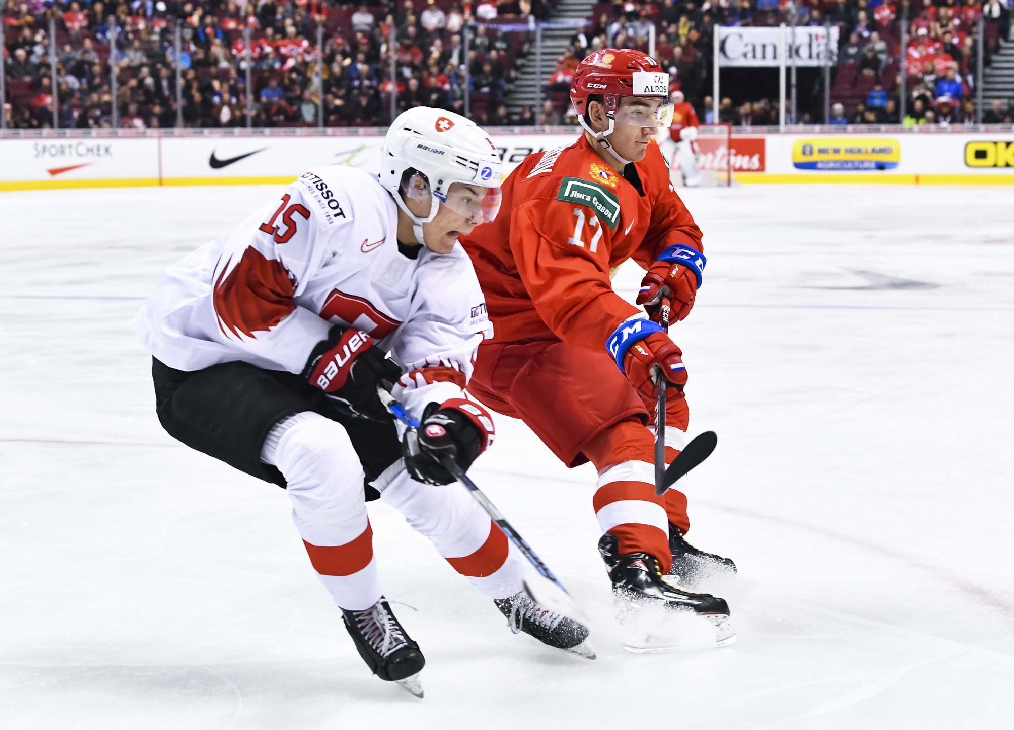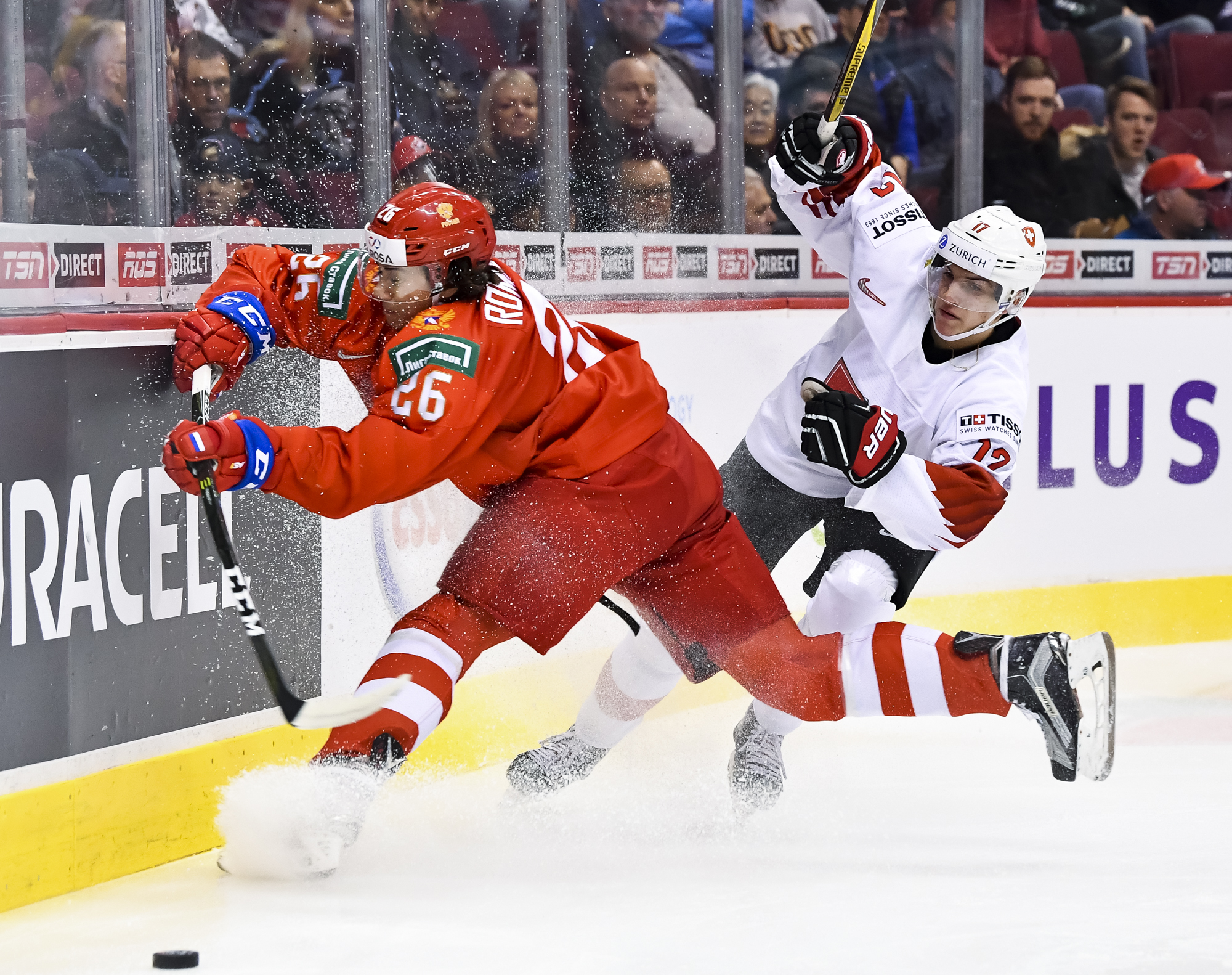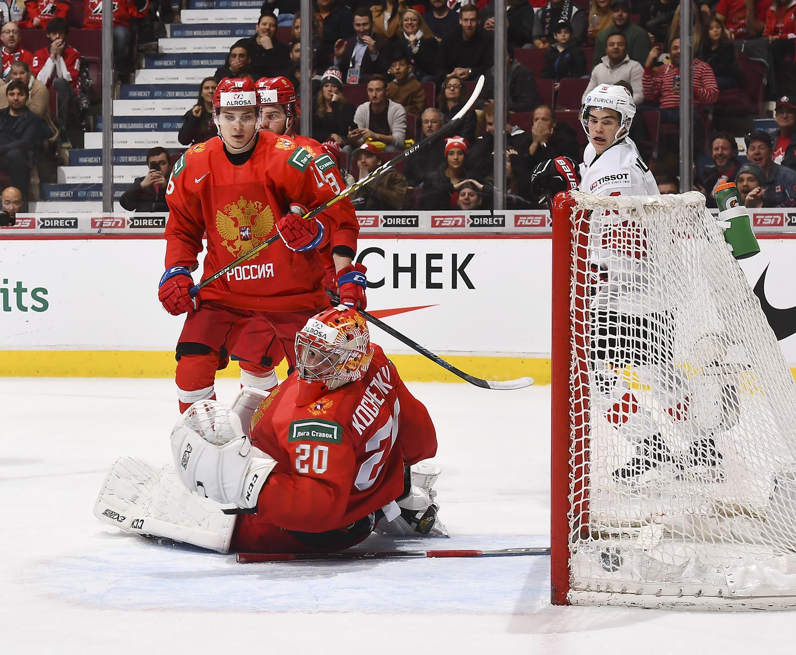 In the early game in Vancouver, the underdog Swiss hung tough with the Russians till the end, but just couldn't come up with enough offence.