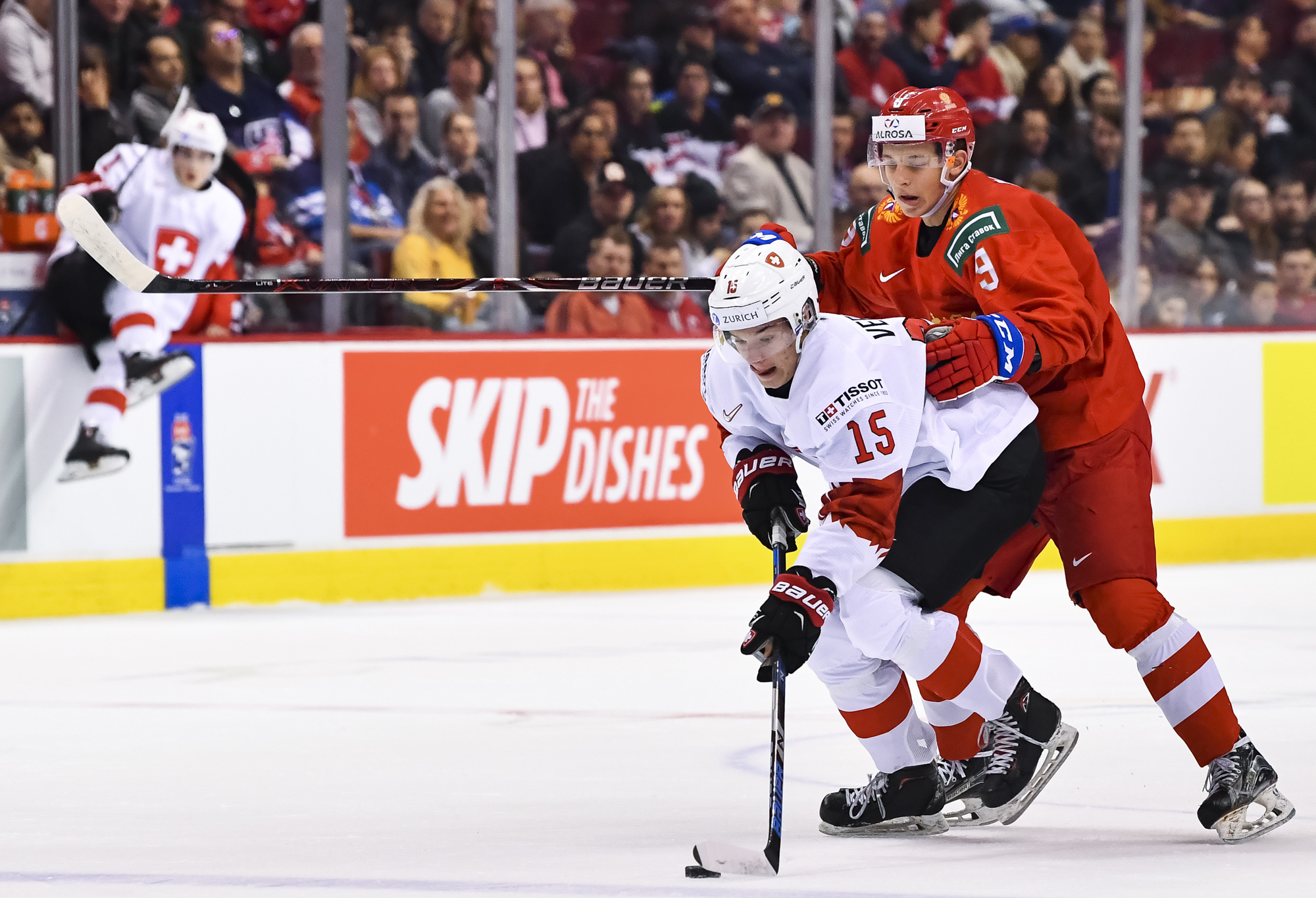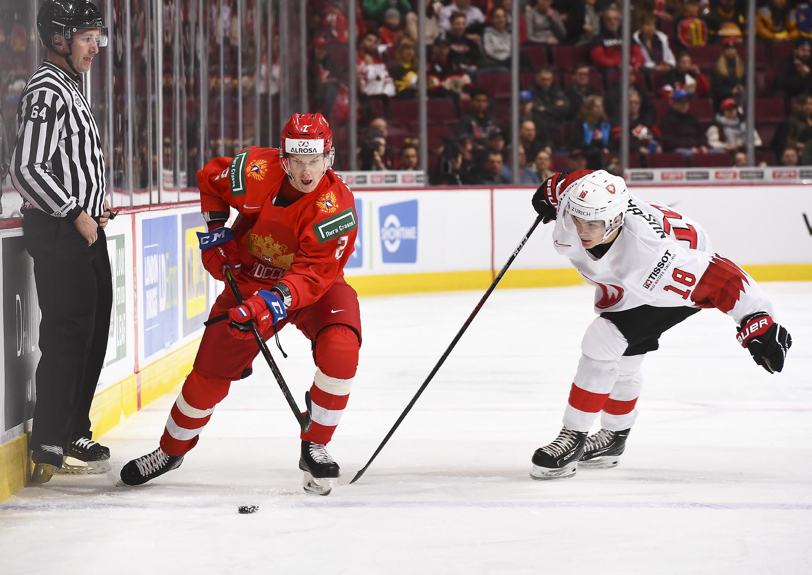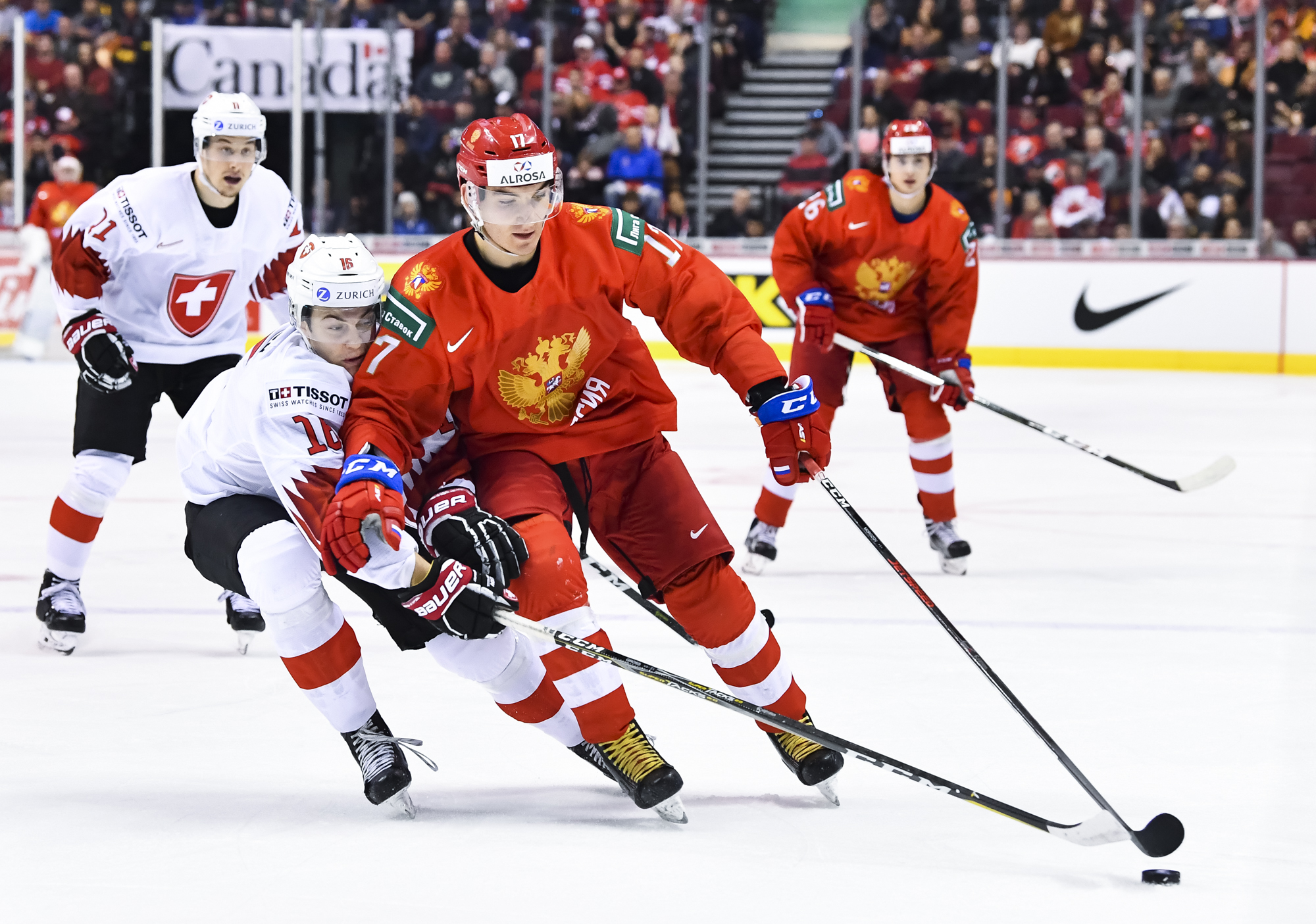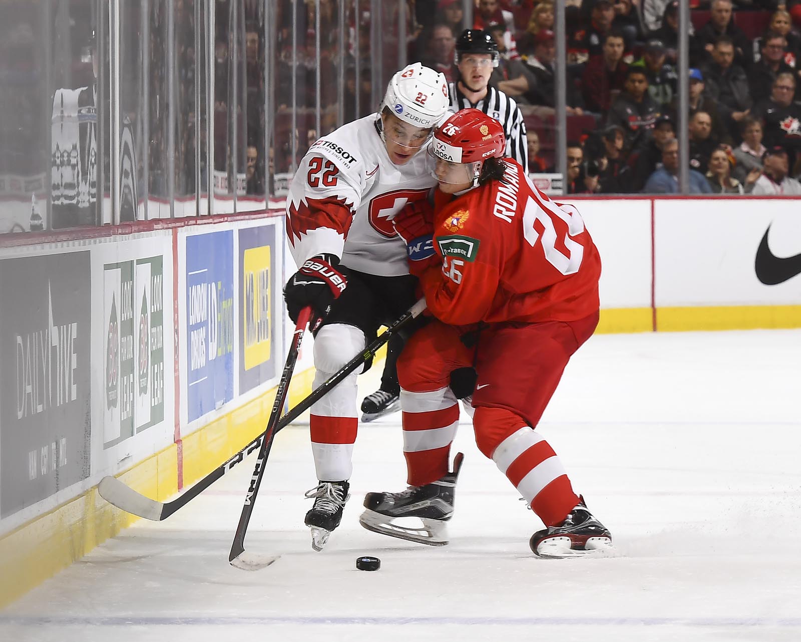 In the early game in Vancouver, the underdog Swiss hung tough with the Russians till the end, but just couldn't come up with enough offence.