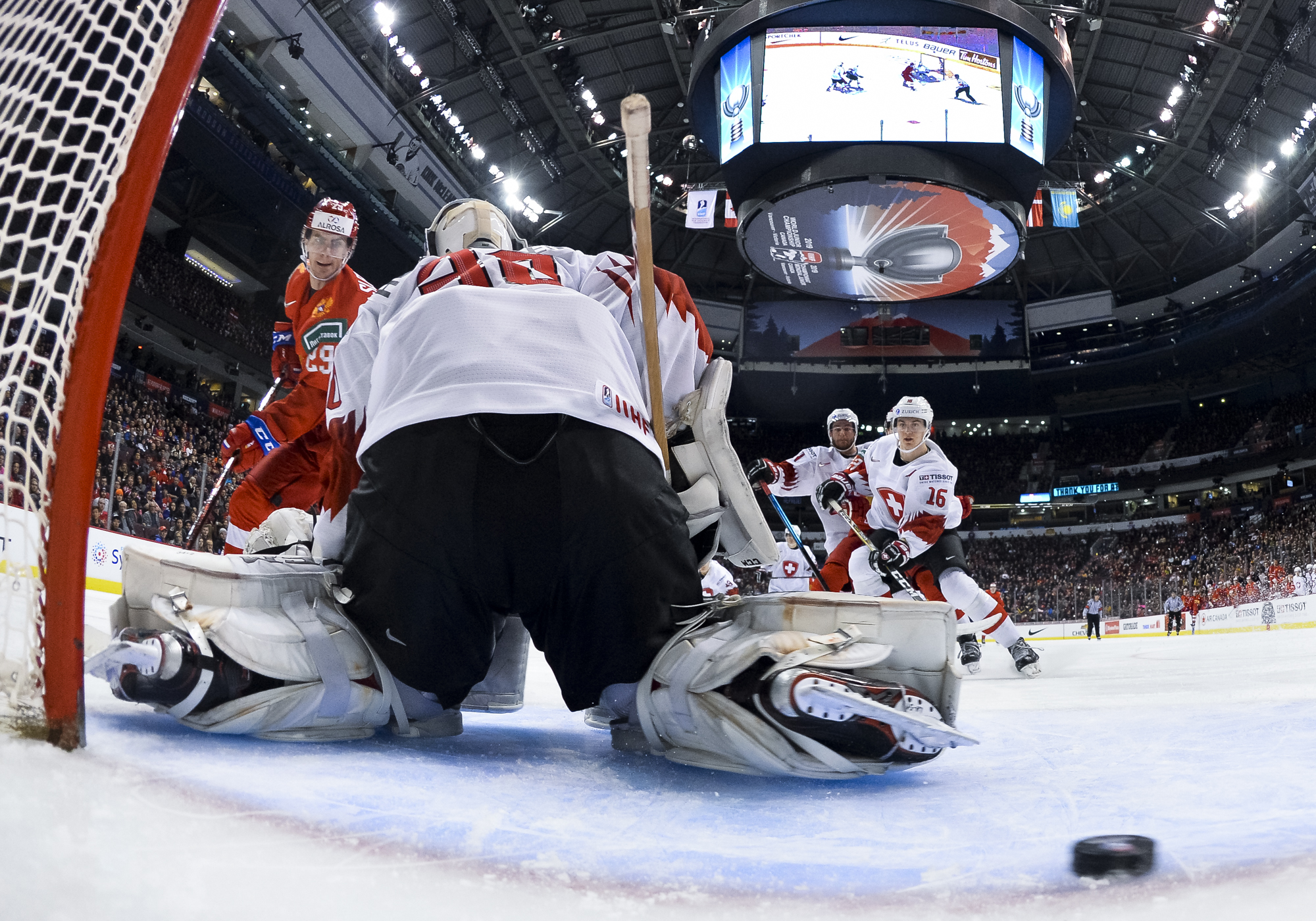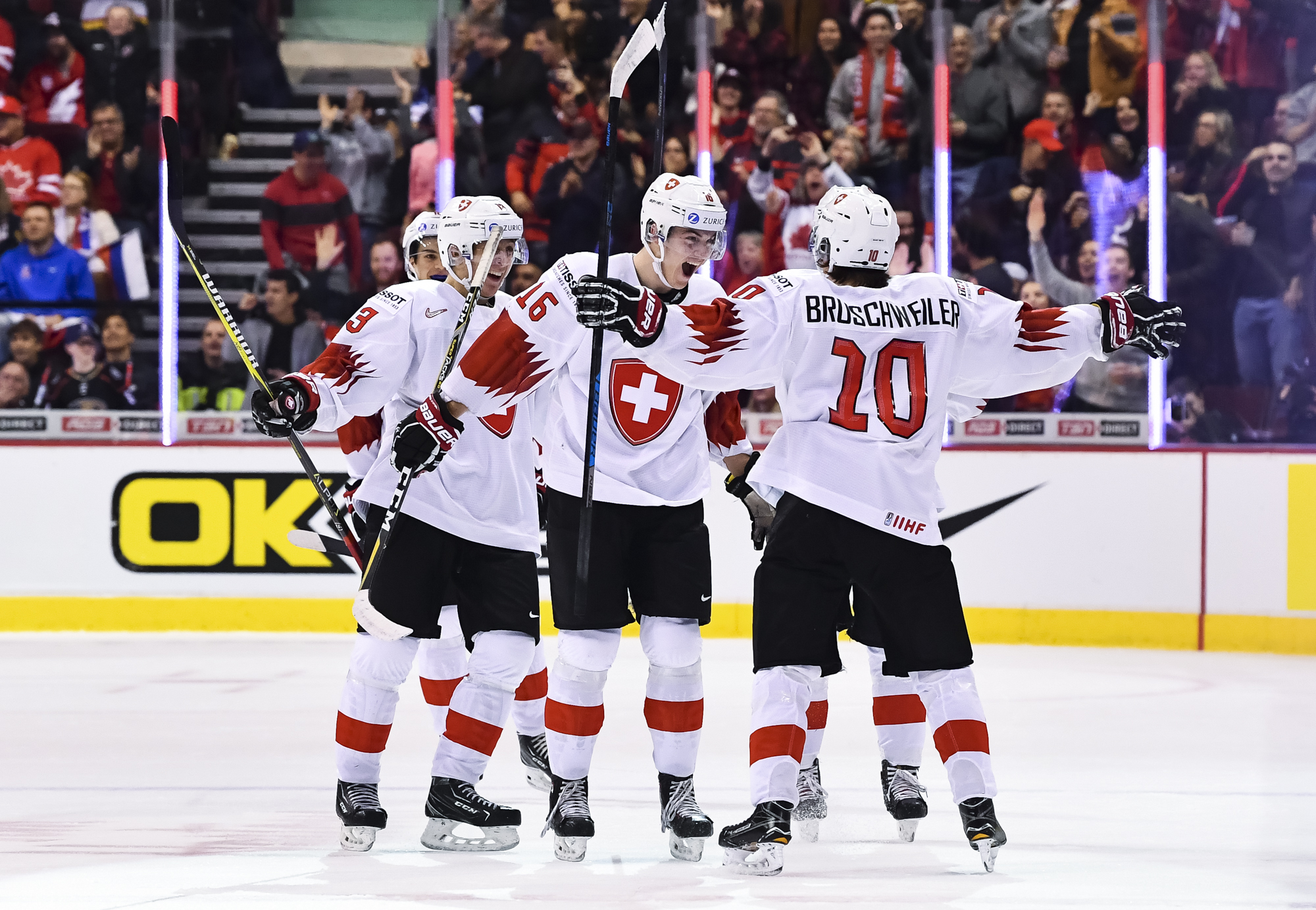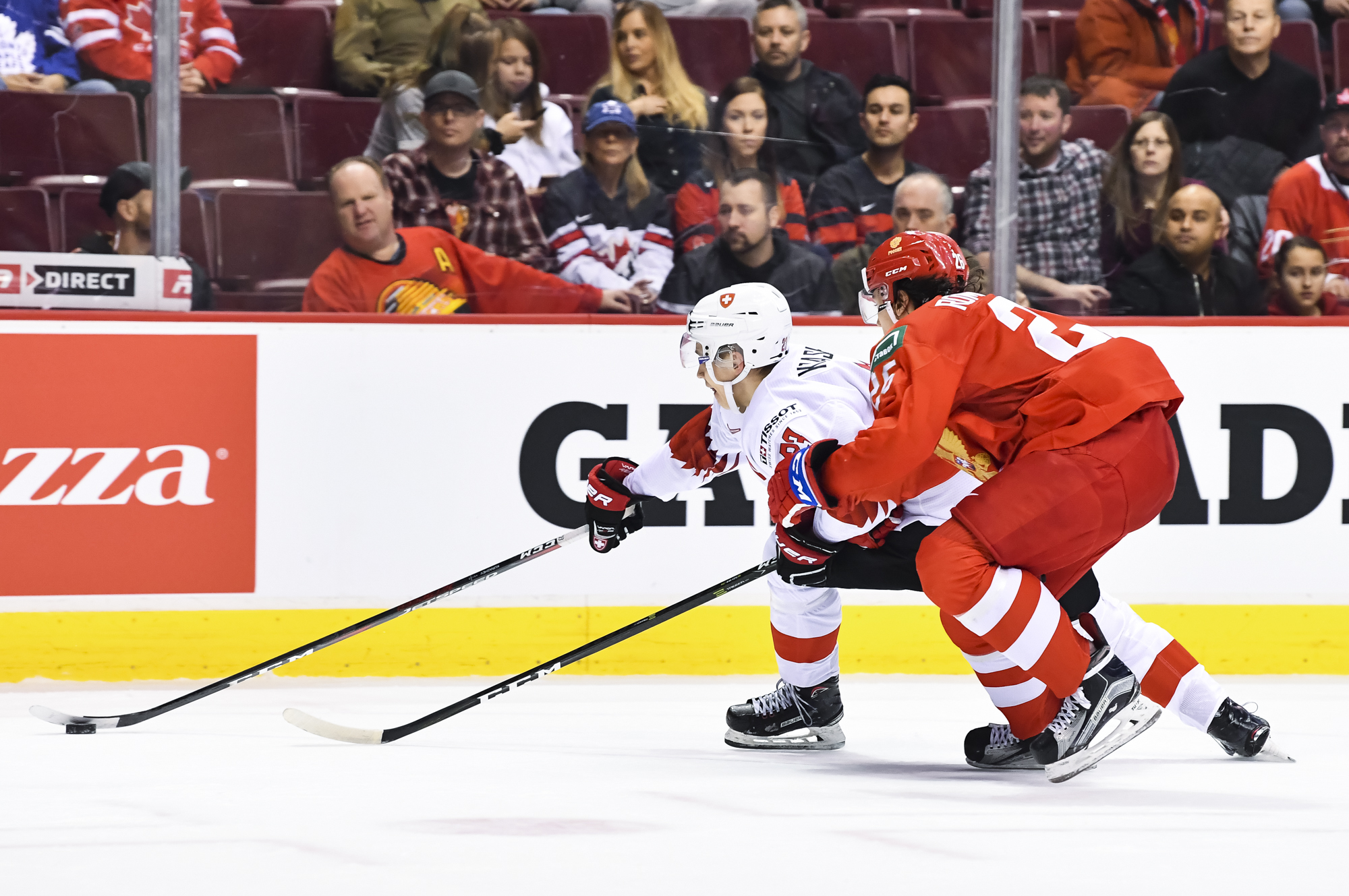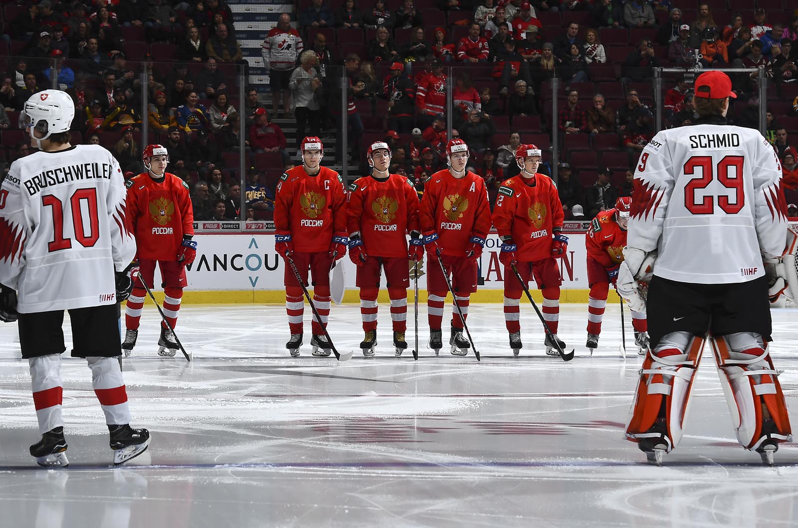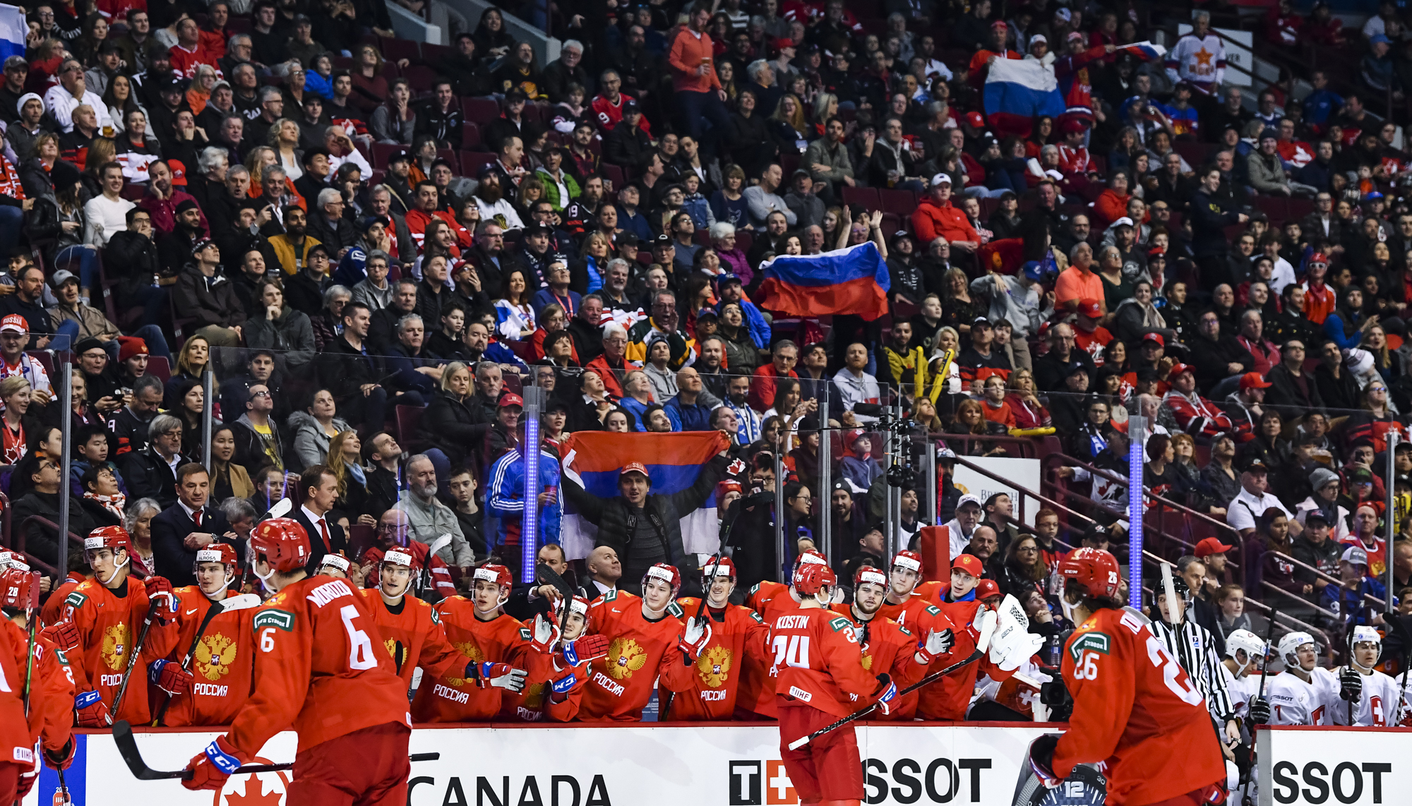 The red-and-white, predominantly Canadian fans urged the underdogs on with chants of "Let's go Switzerland!", plus "Defence!" during a mid-game Russian power play.
