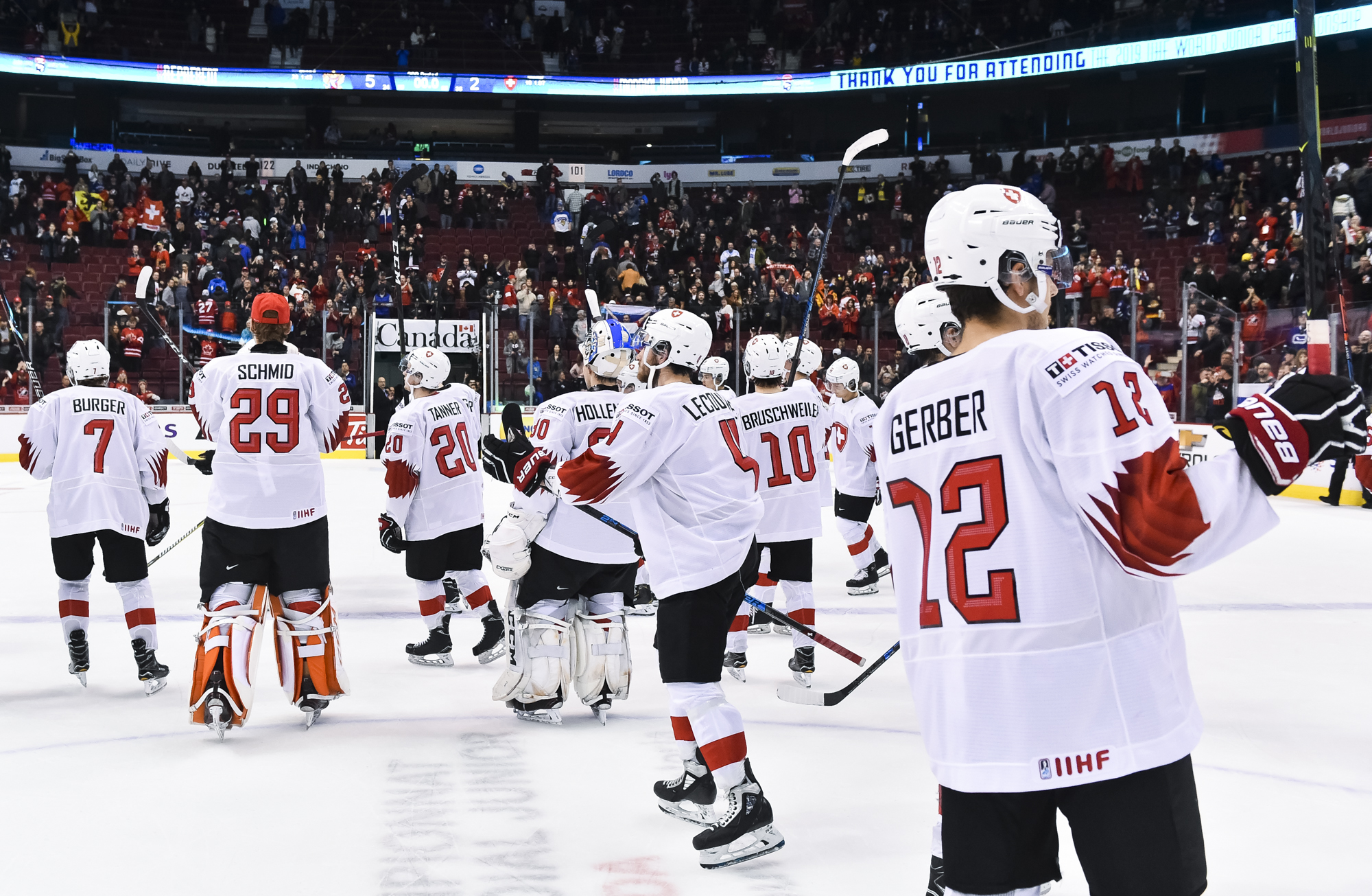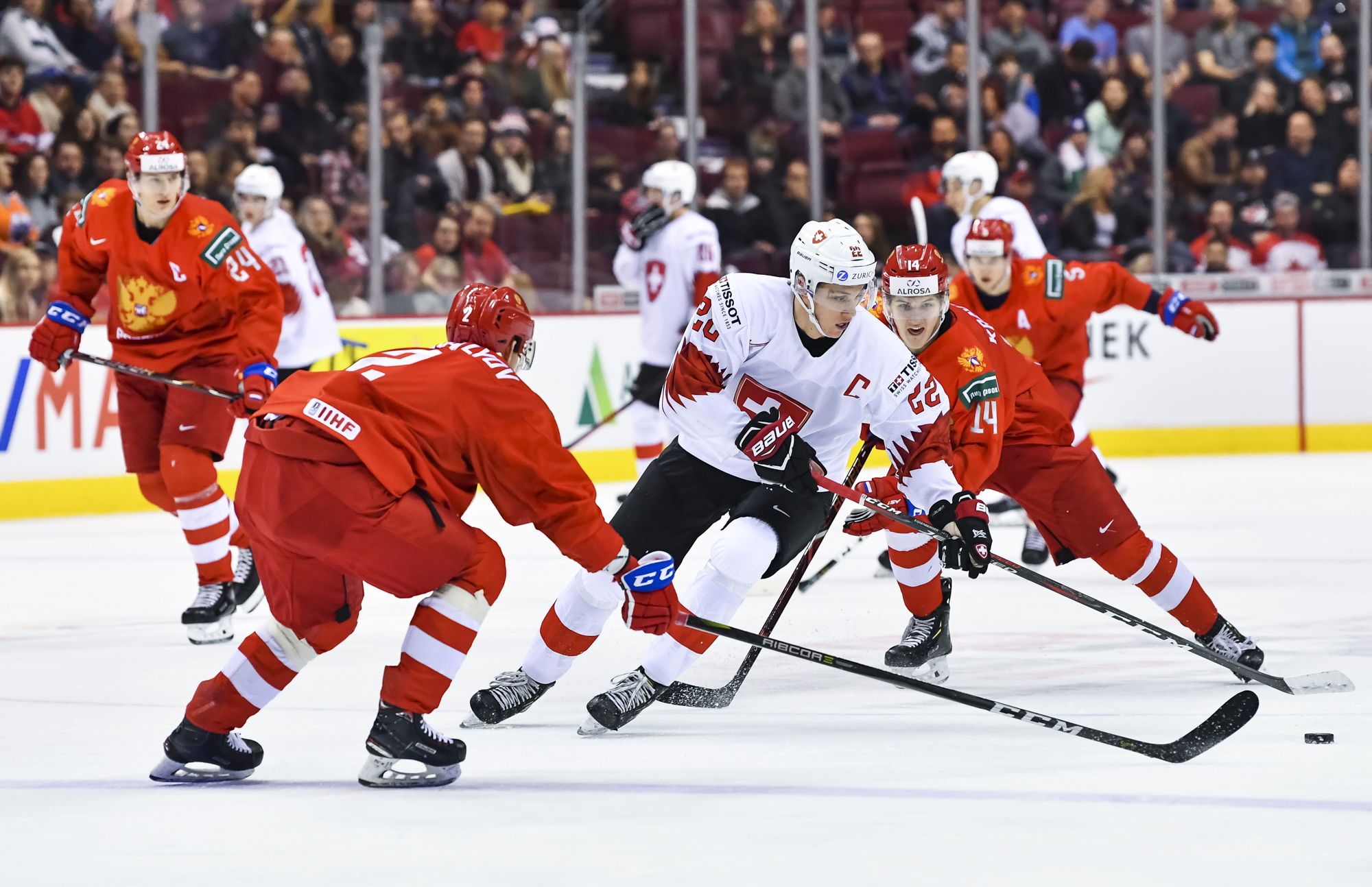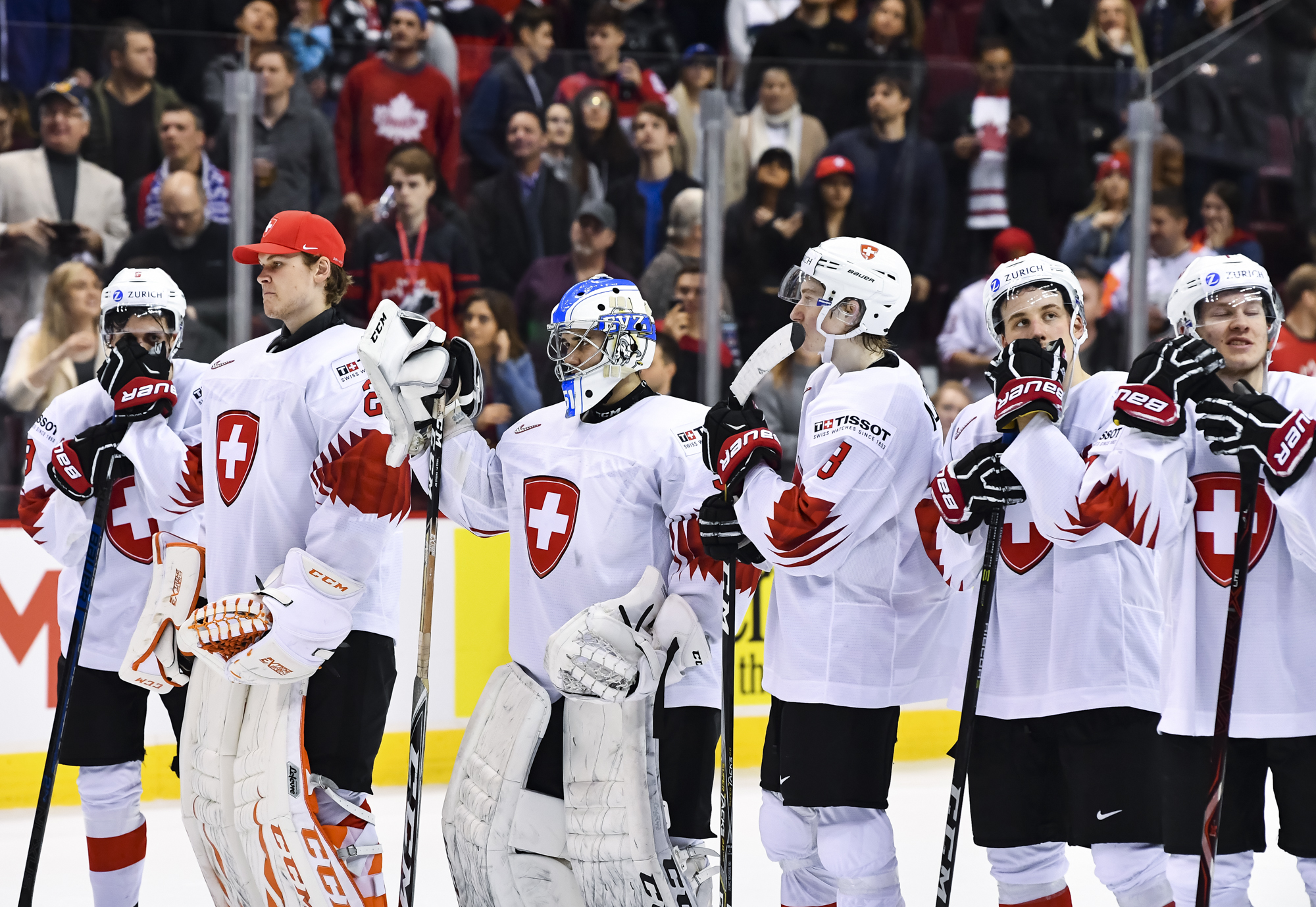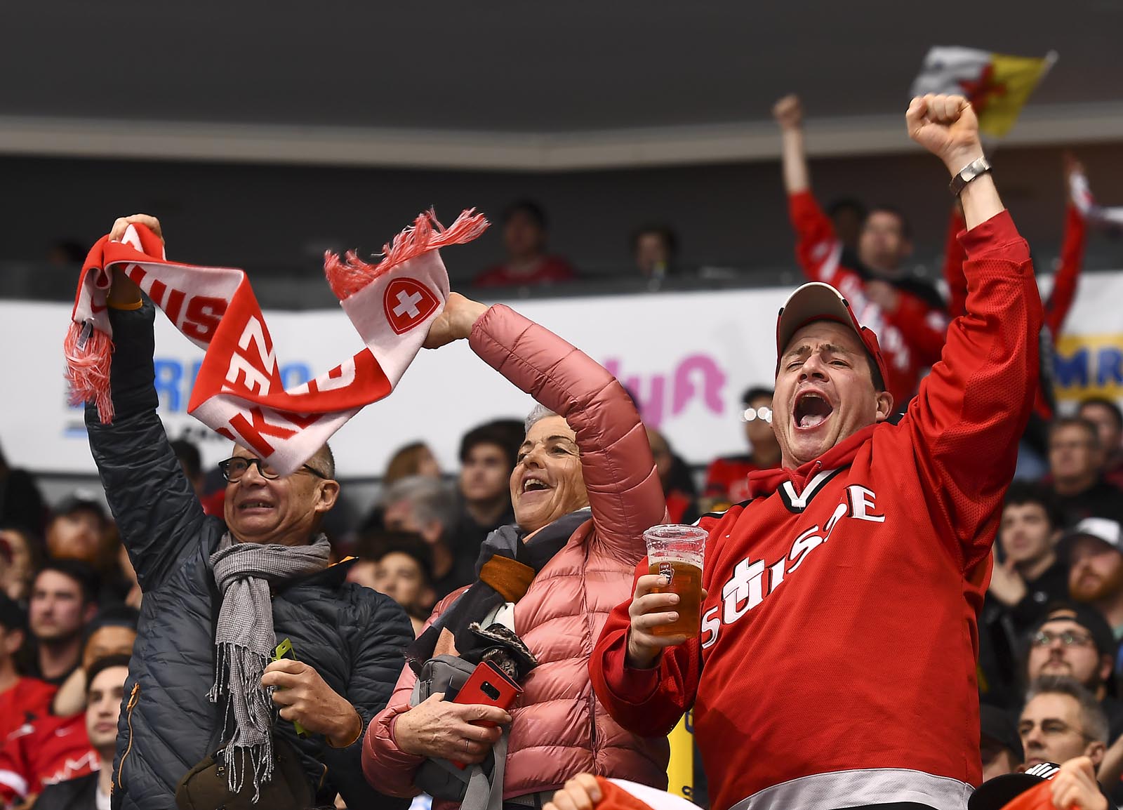 The red-and-white, predominantly Canadian fans urged the underdogs on with chants of "Let's go Switzerland!", plus "Defence!" during a mid-game Russian power play.