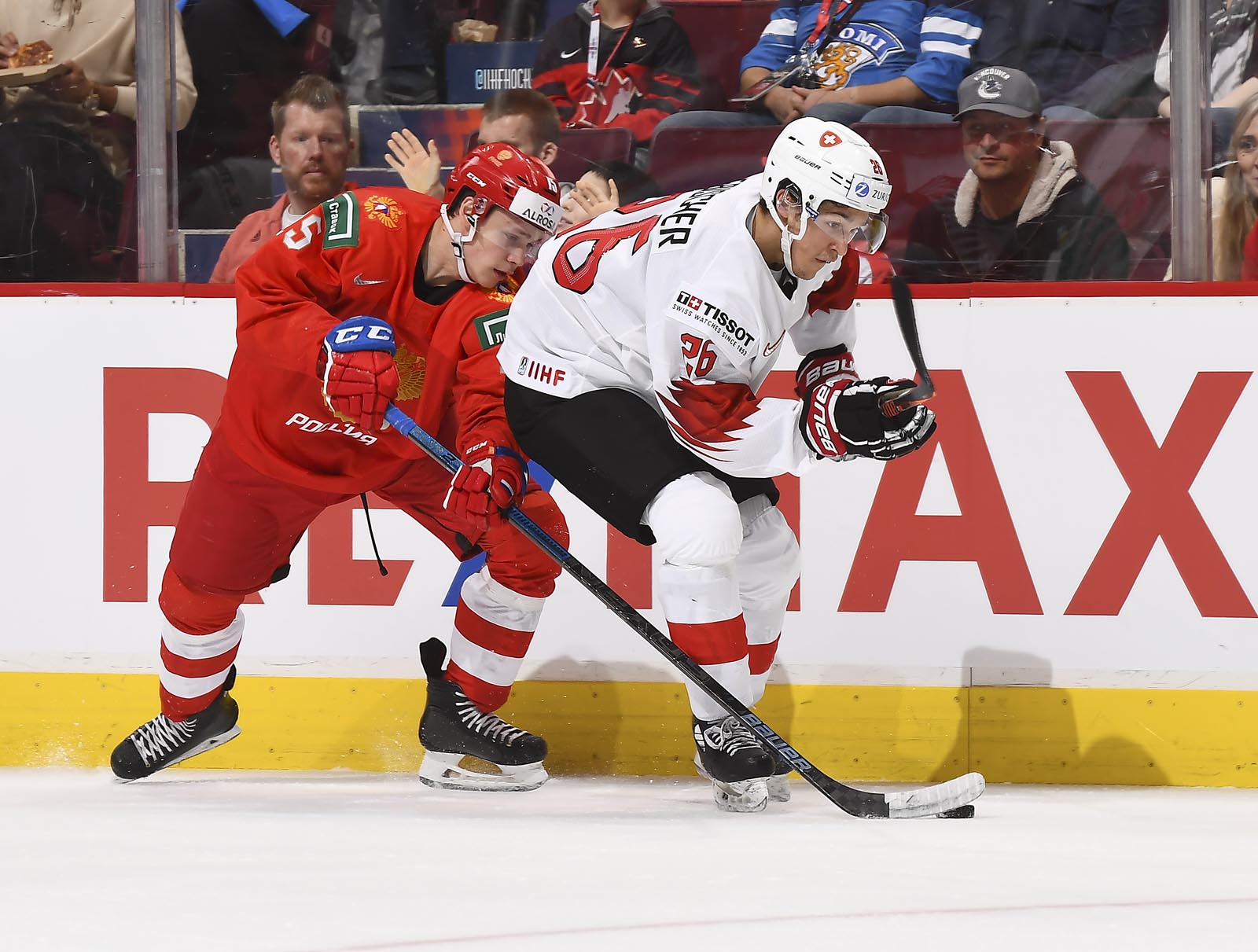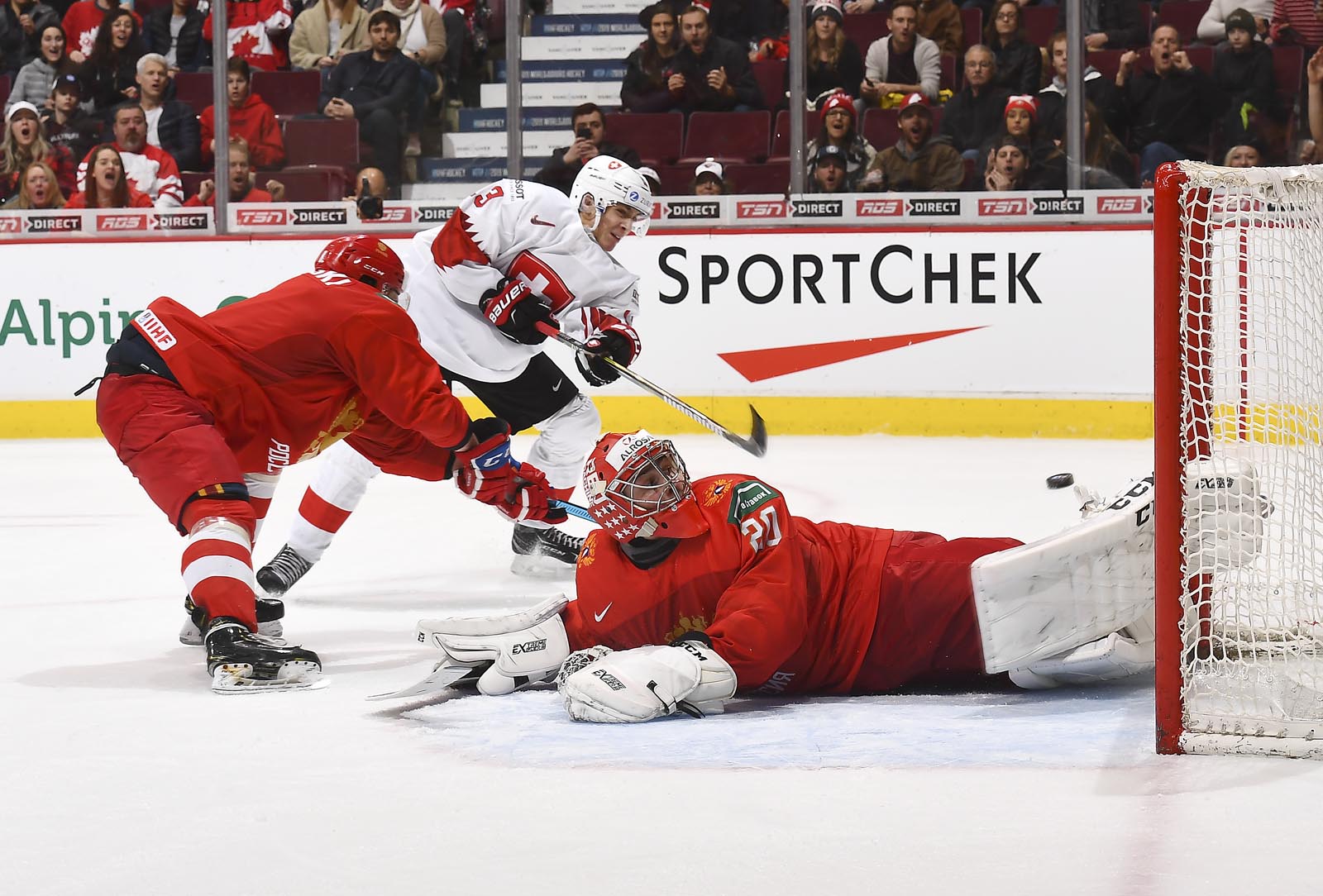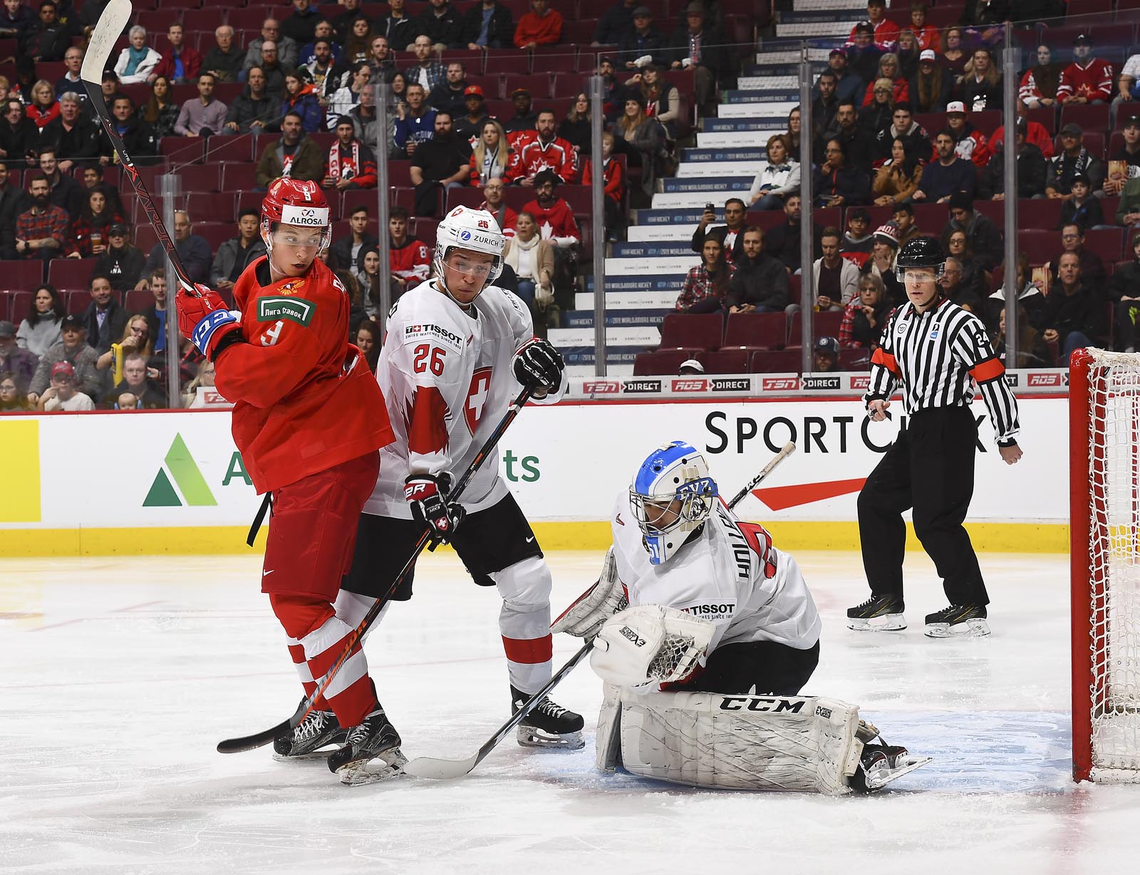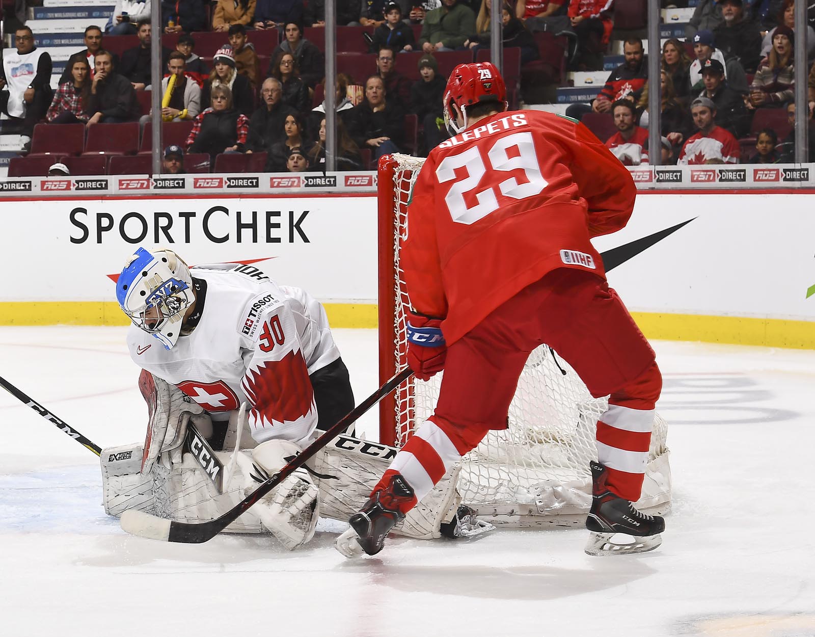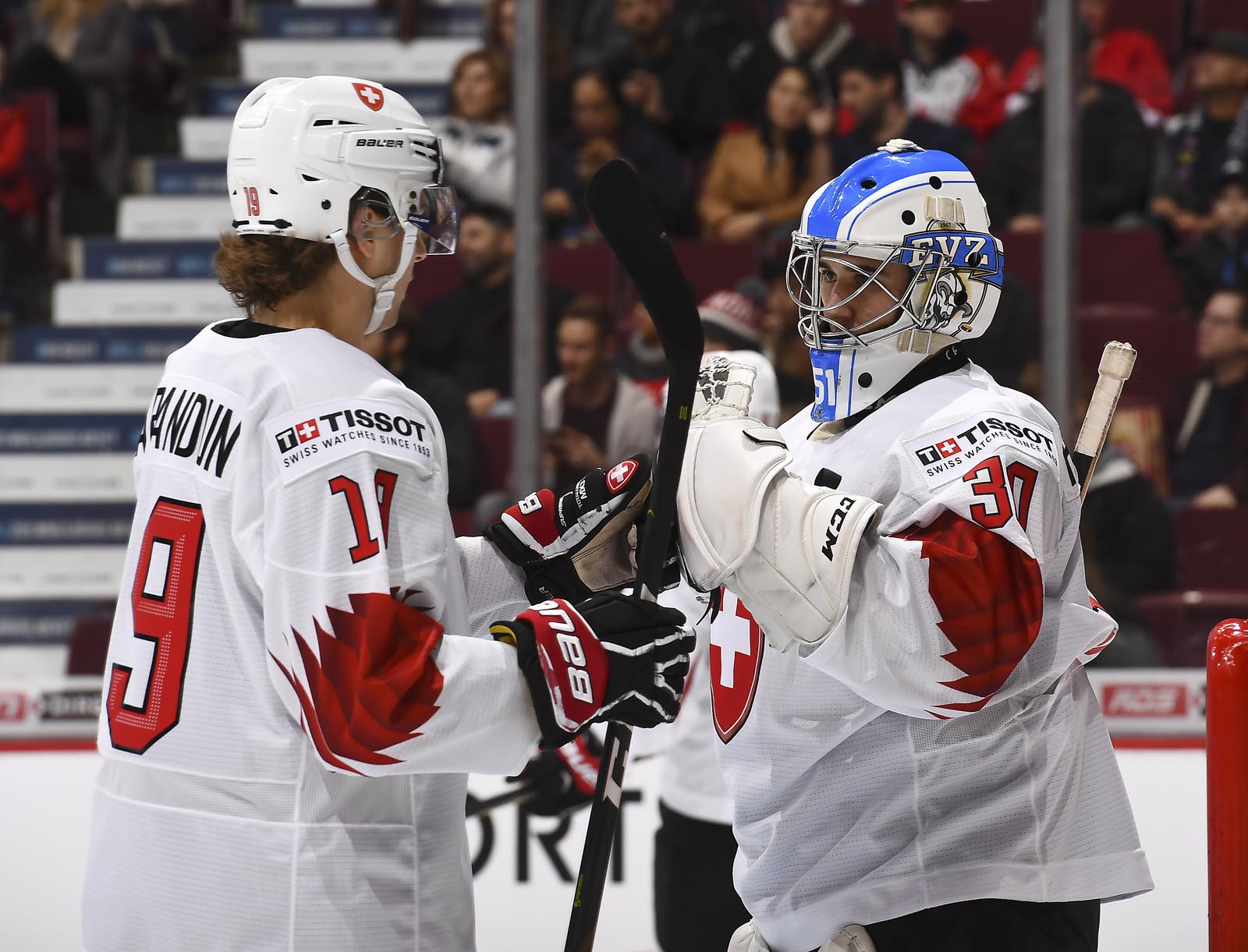 The red-and-white, predominantly Canadian fans urged the underdogs on with chants of "Let's go Switzerland!", plus "Defence!" during a mid-game Russian power play.