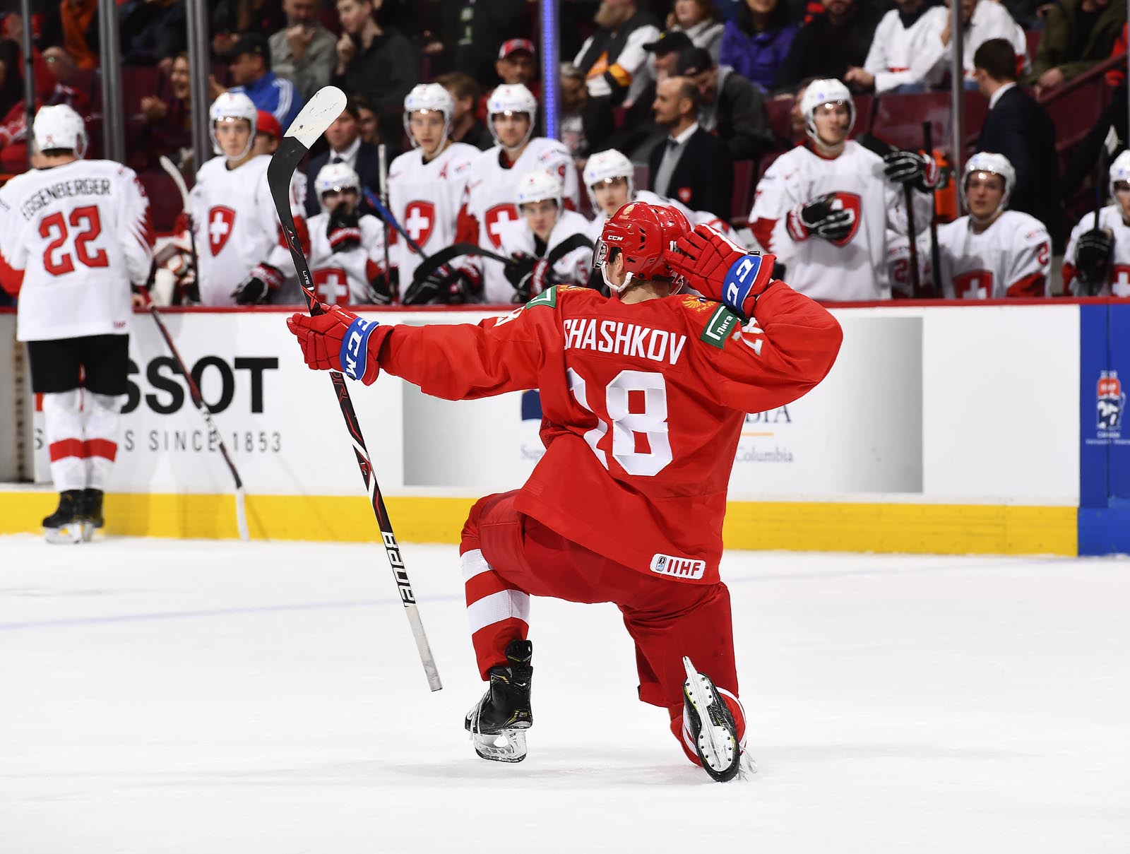 Two seconds after a Swiss man advantage ended, Shashkov scored high to the stick side on a 2-on-1 to make it 2-0 at 13:44.