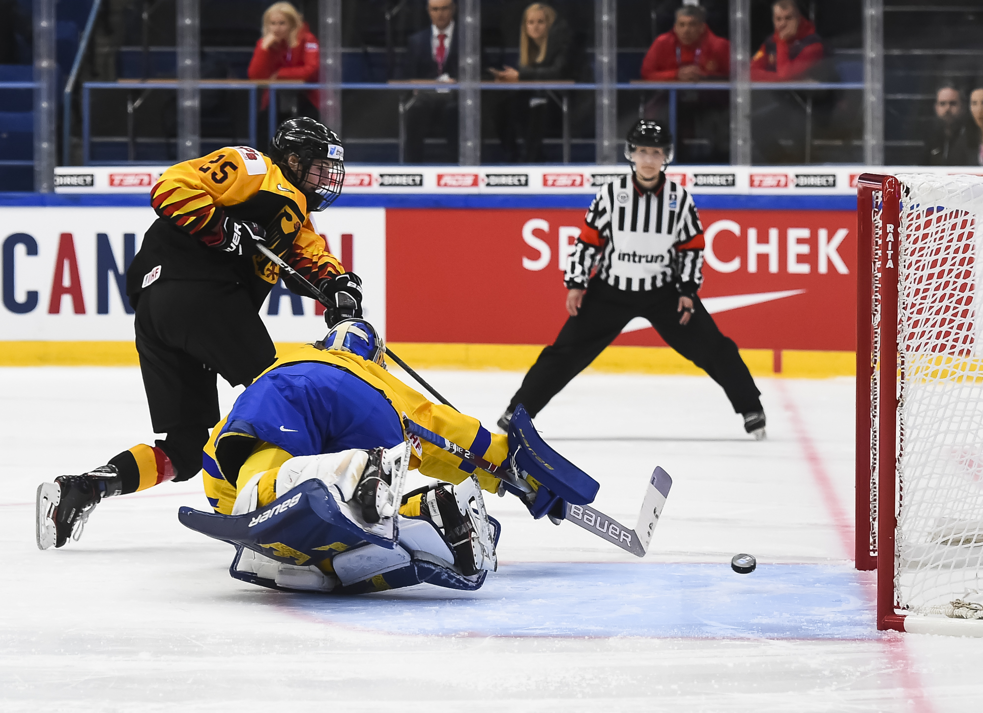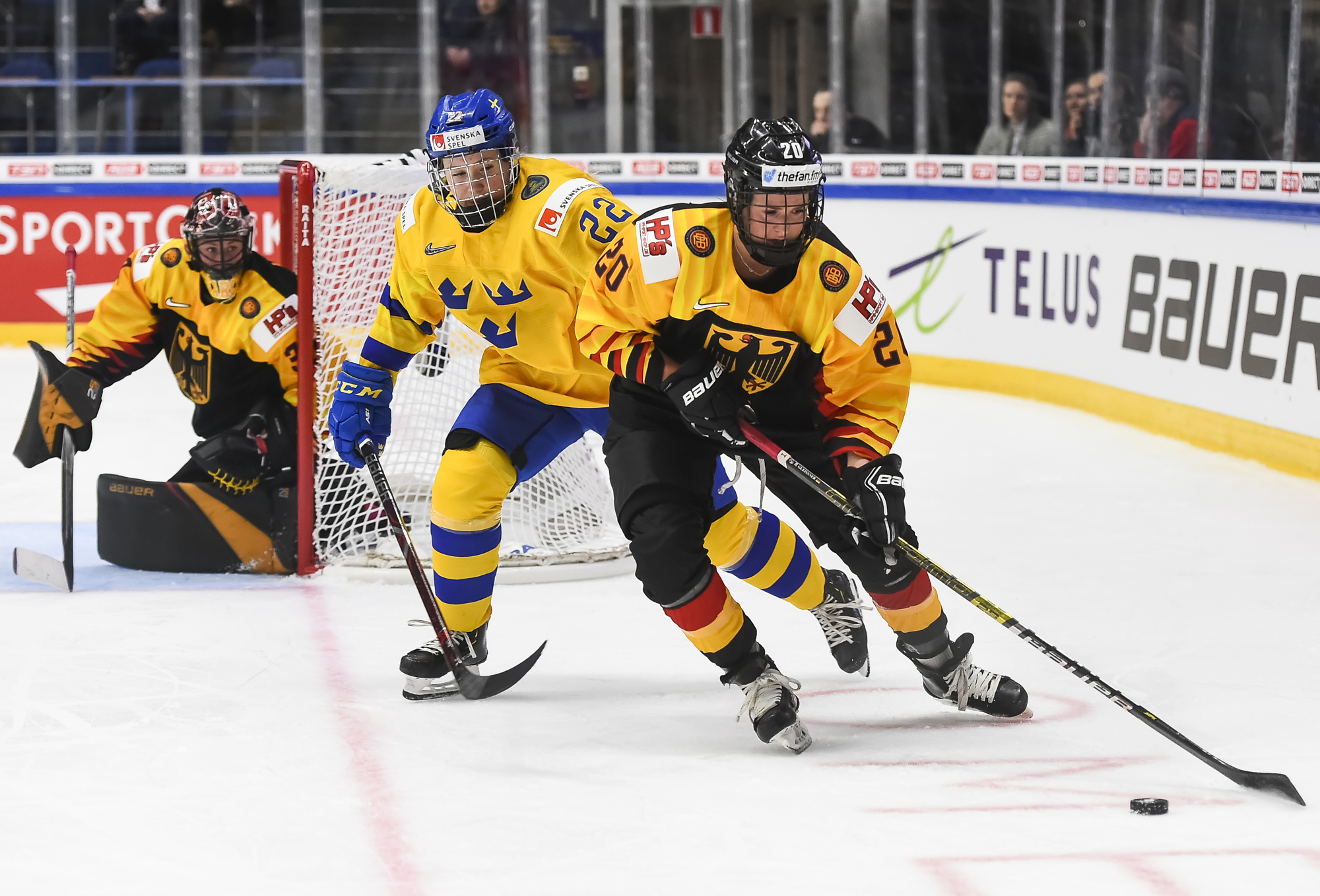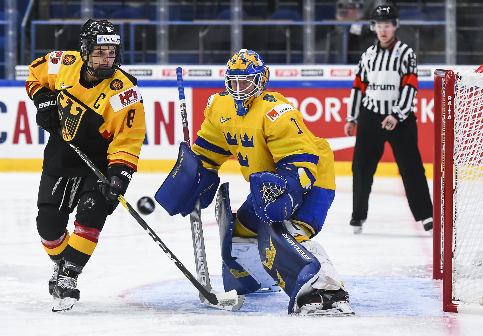 In a fast-paced, physical, but scoreless first period, Harss was the busier of the two goalies, as Sweden outshot rookie German head coach Christian Kunast's team 15-6.