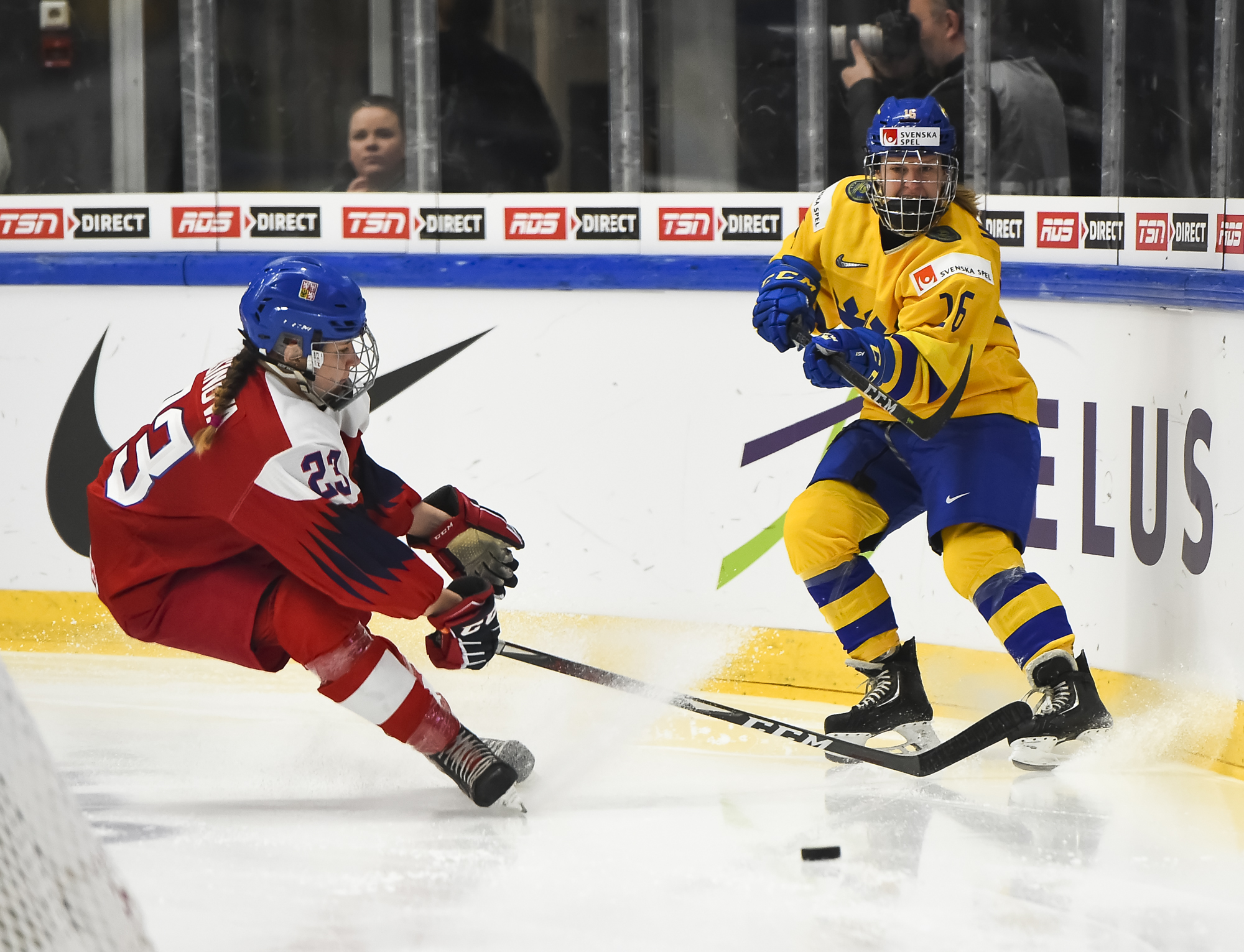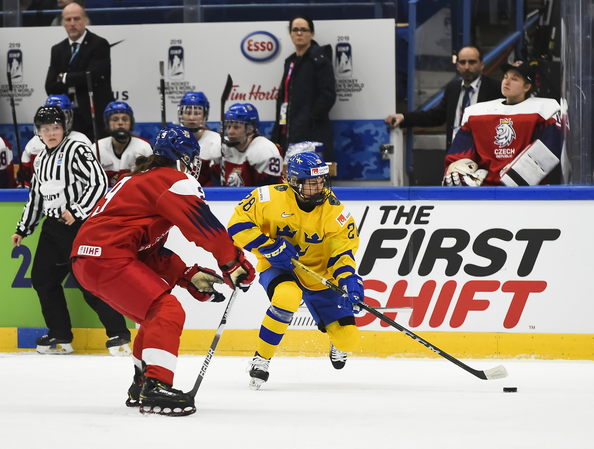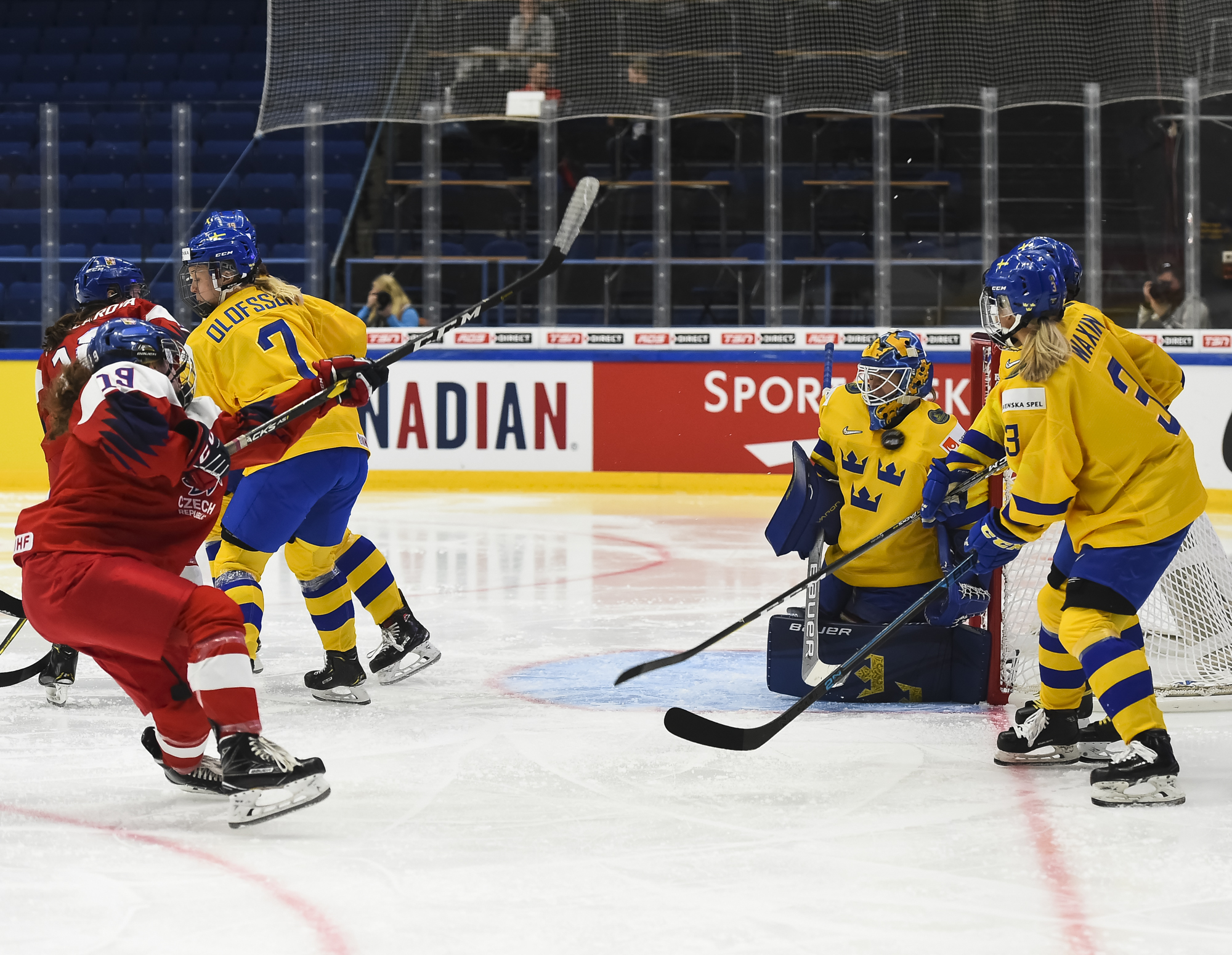 Rookie head coach Ylva Martinsen’s women skated hard and looked determined in the first period, outshooting the Czechs 13-3. At the tail end of Sweden’s first power play, Hanna Olsson threaded the needle with a high short side shot past Peslarova from the left faceoff circle to make it 1-0 at 6:55.