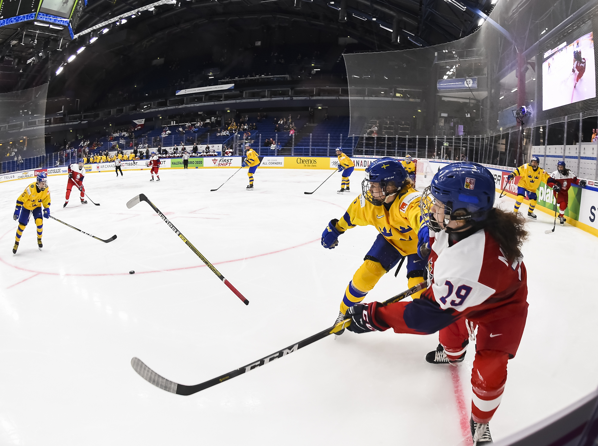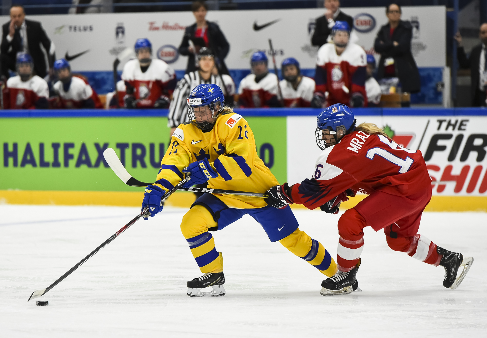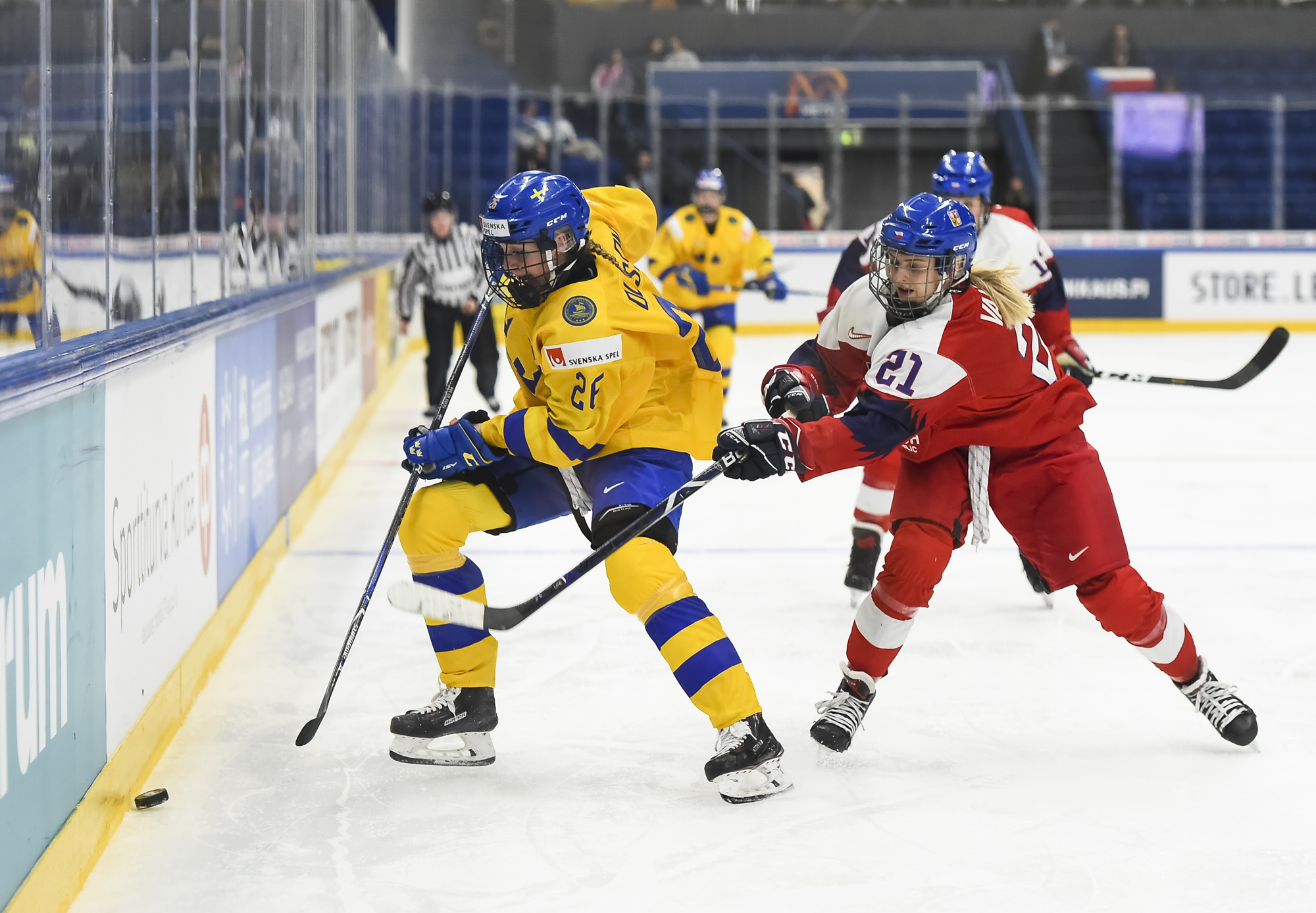 Rookie head coach Ylva Martinsen’s women skated hard and looked determined in the first period, outshooting the Czechs 13-3. At the tail end of Sweden’s first power play, Hanna Olsson threaded the needle with a high short side shot past Peslarova from the left faceoff circle to make it 1-0 at 6:55.