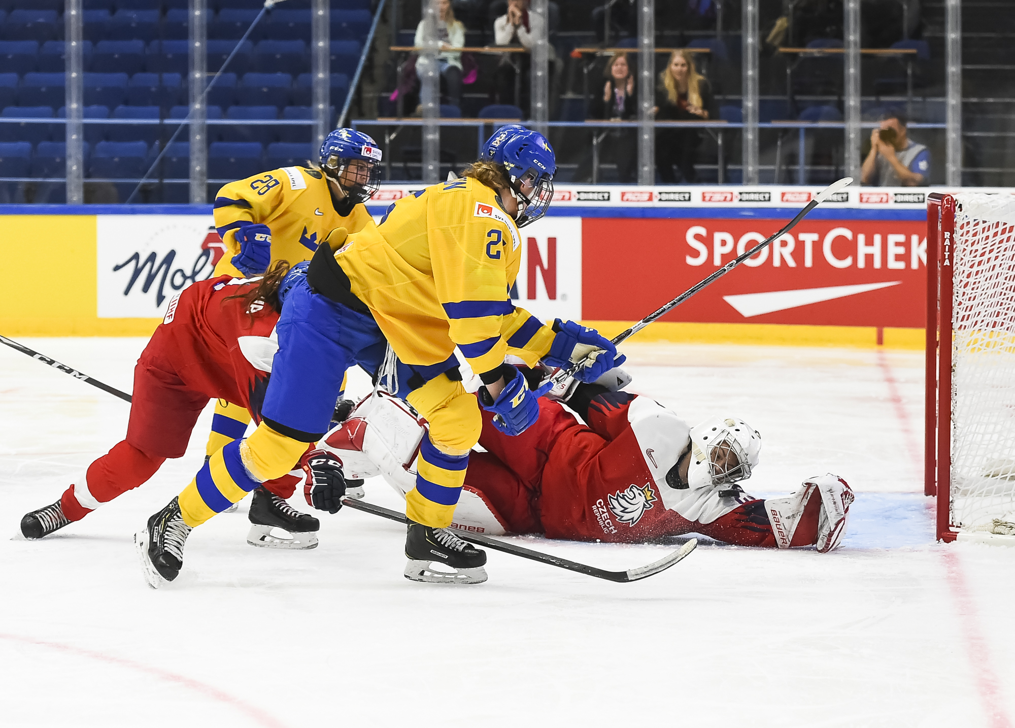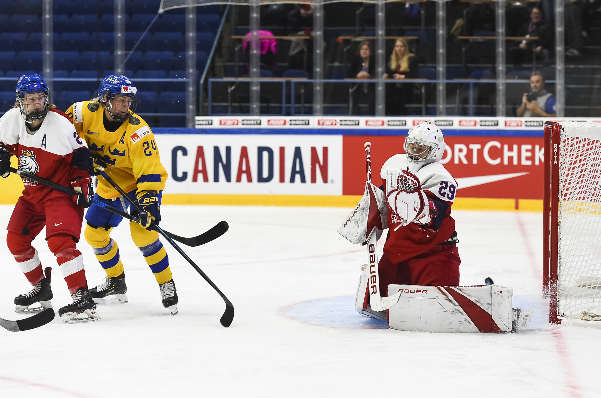 With about four minutes left, Melinda Olsson had a great chance to bring Sweden within one, but Peslarova flung her left arm back with Dominik Hasek-like abandon to foil the Swedish forward on the doorstep and leave her shaking her head.