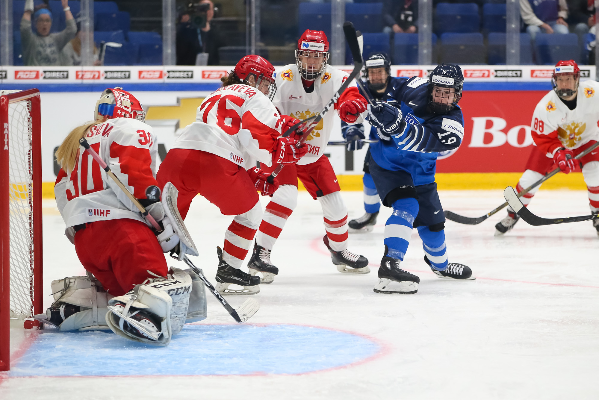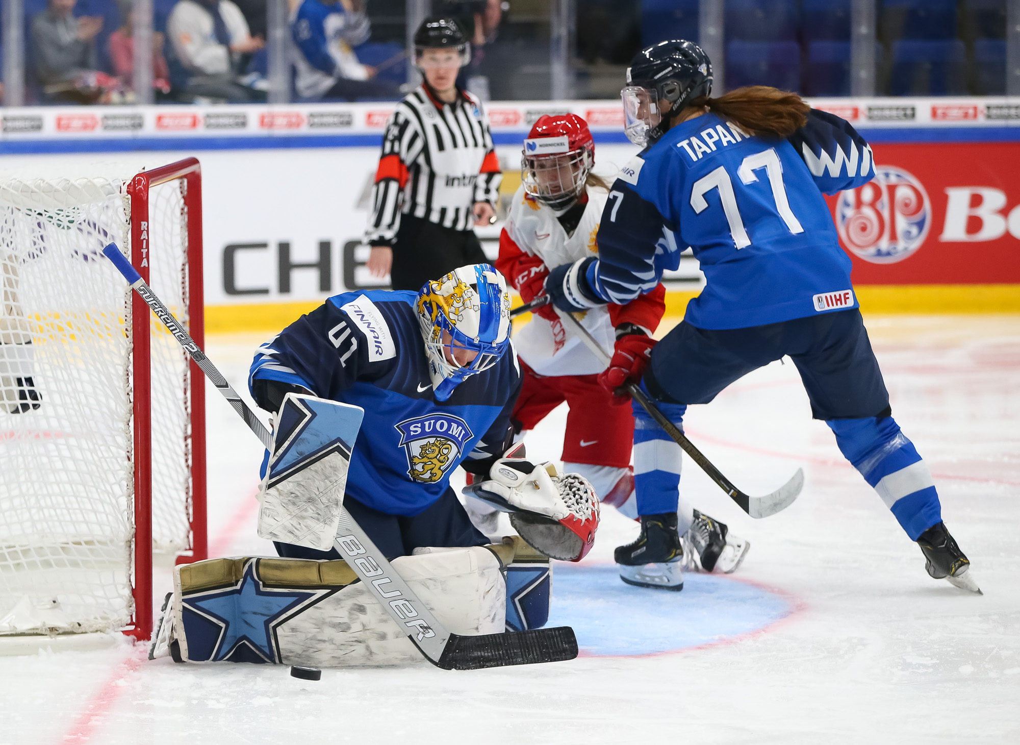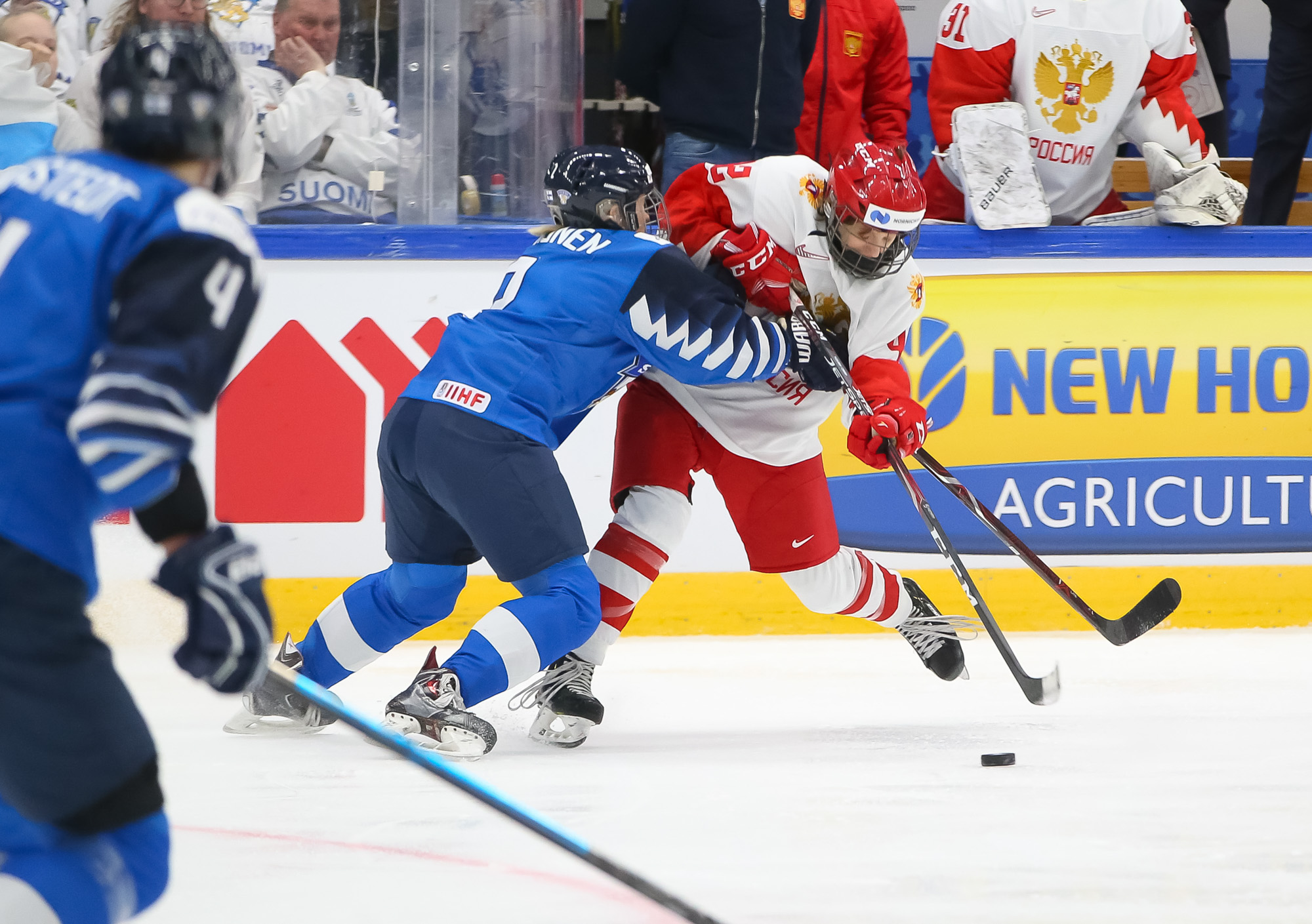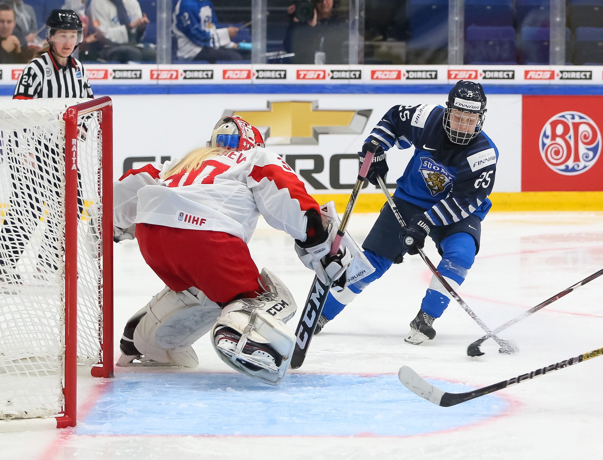 The starting goalies were a study in contrasts. Dynamo St. Petersburg’s Valentina Merkusheva, a 19-year-old Muscovite, made her Women’s Worlds debut between the pipes versus Olympic all-star Noora Raty, making her 35th appearance – second all-time only to Switzerland’s Florence Schelling (44). Raty earned her sixth career Women's Worlds shutout.