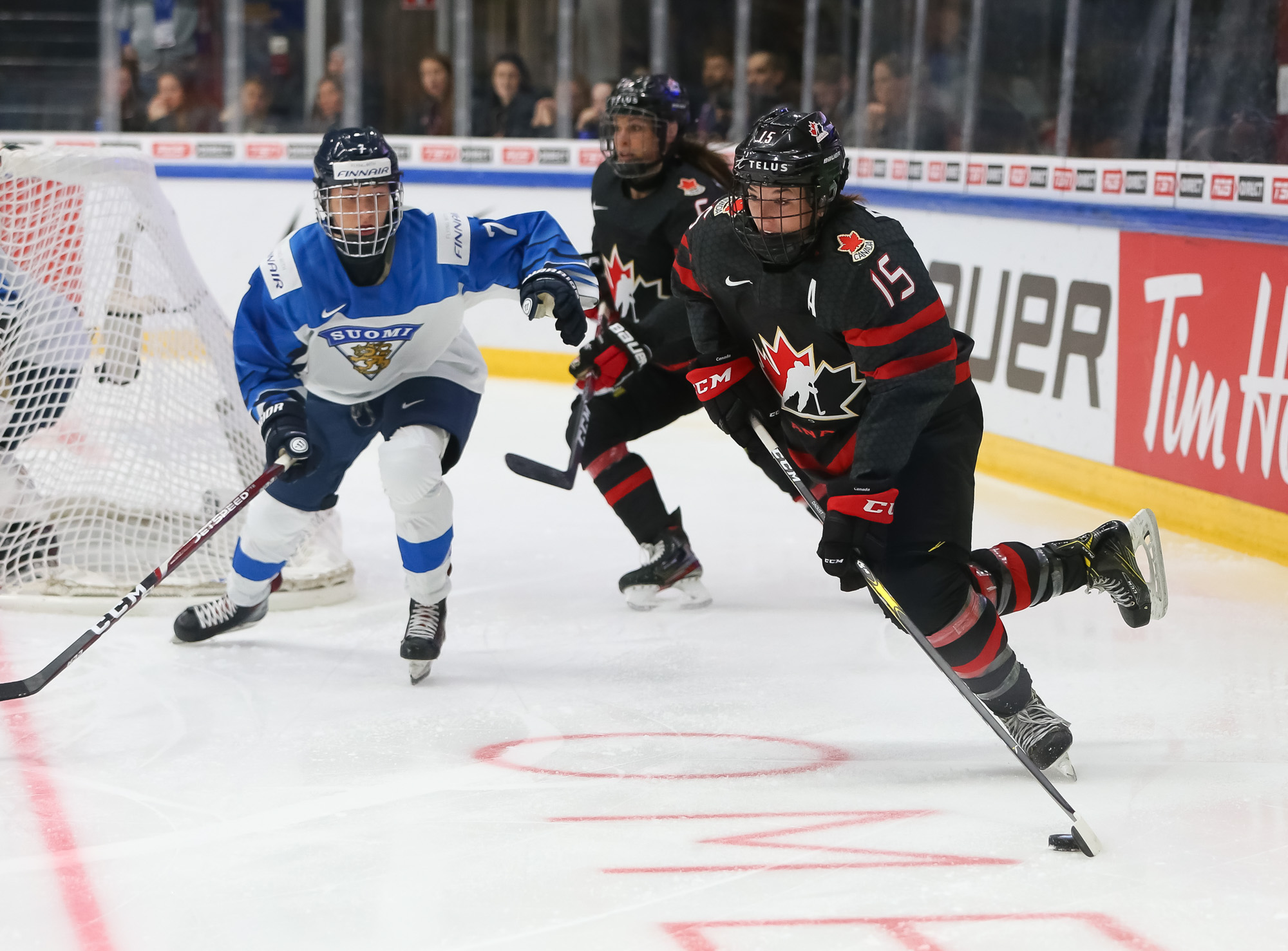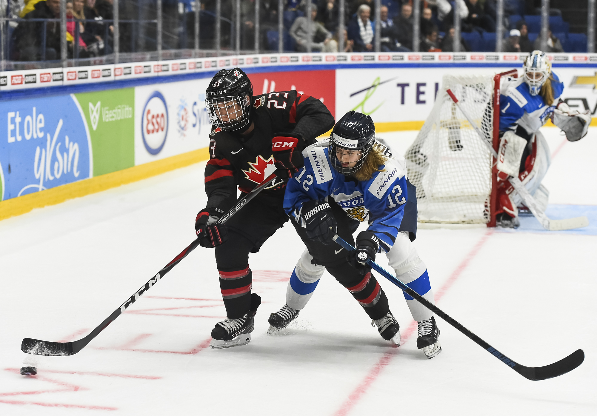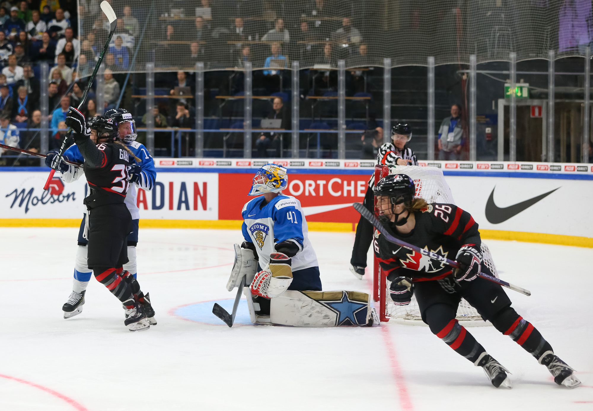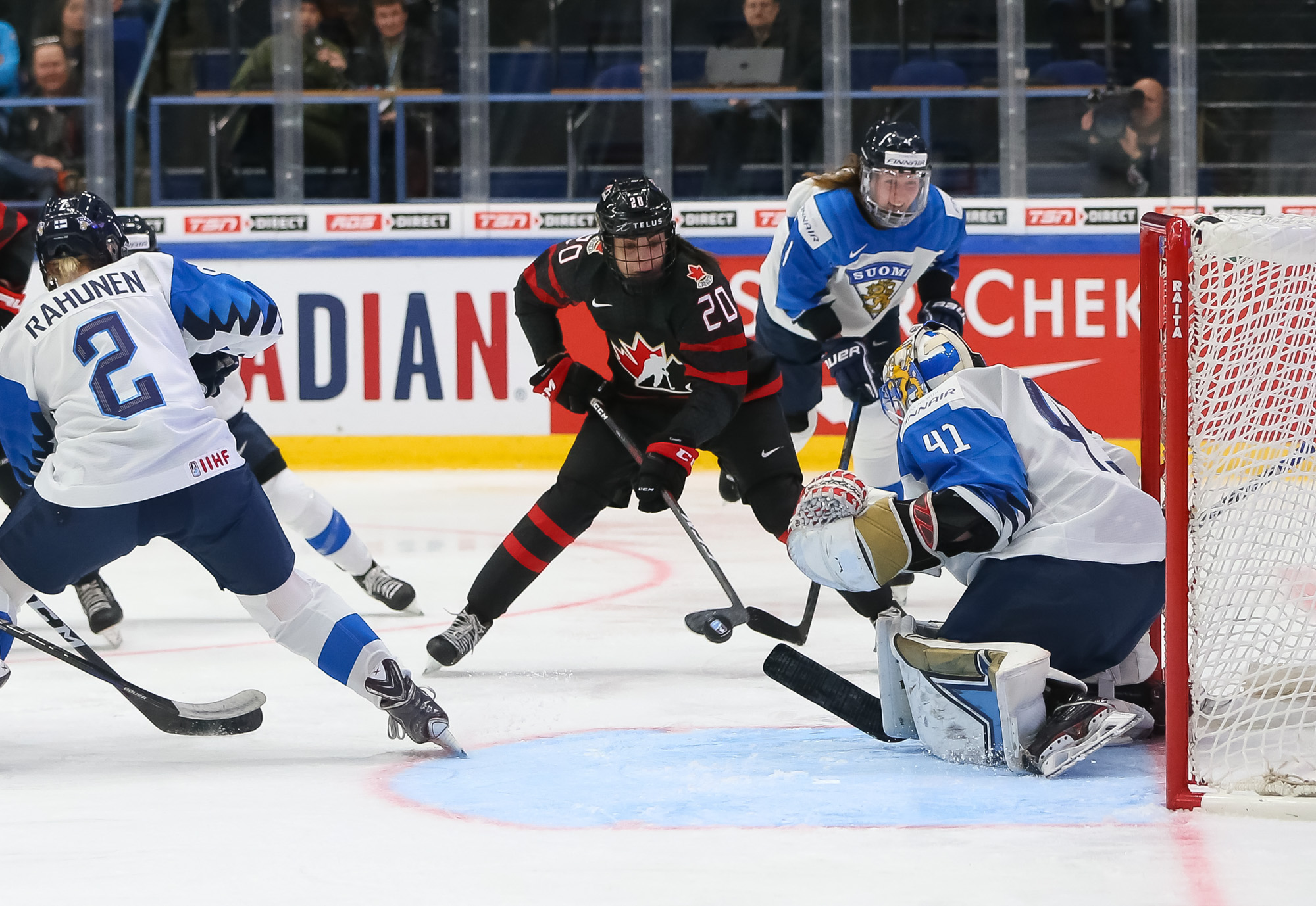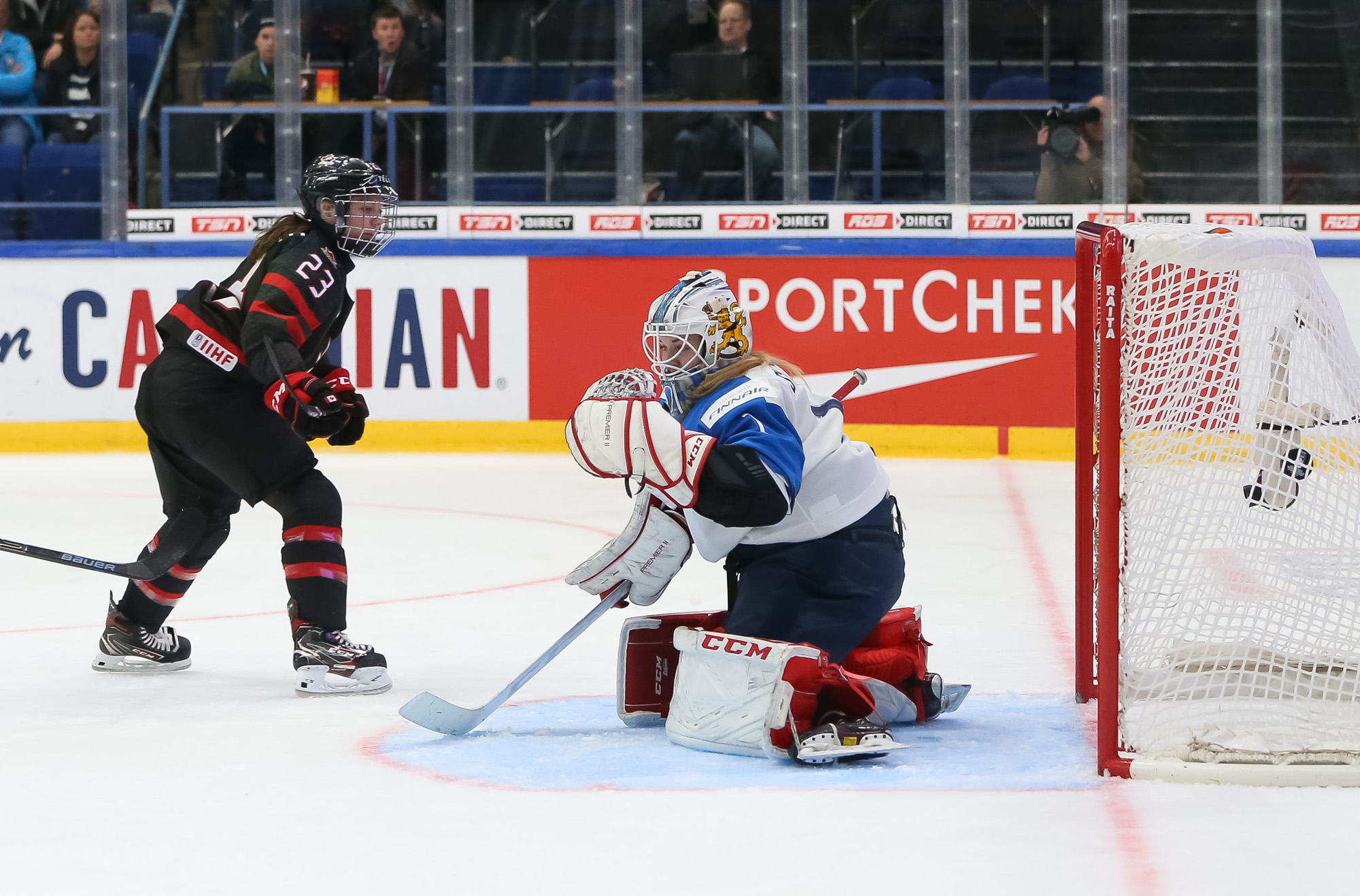 A determined Canadian effort stymied the first Finnish power play with Natalie Spooner off for hooking, as the Finns exerted great pressure.