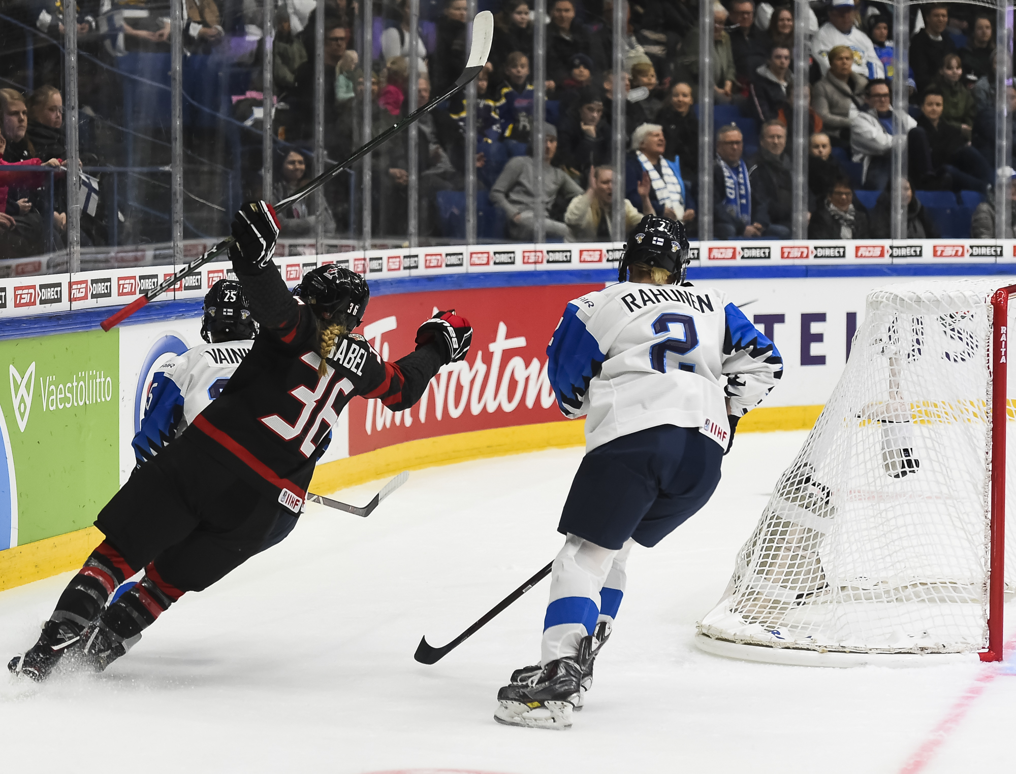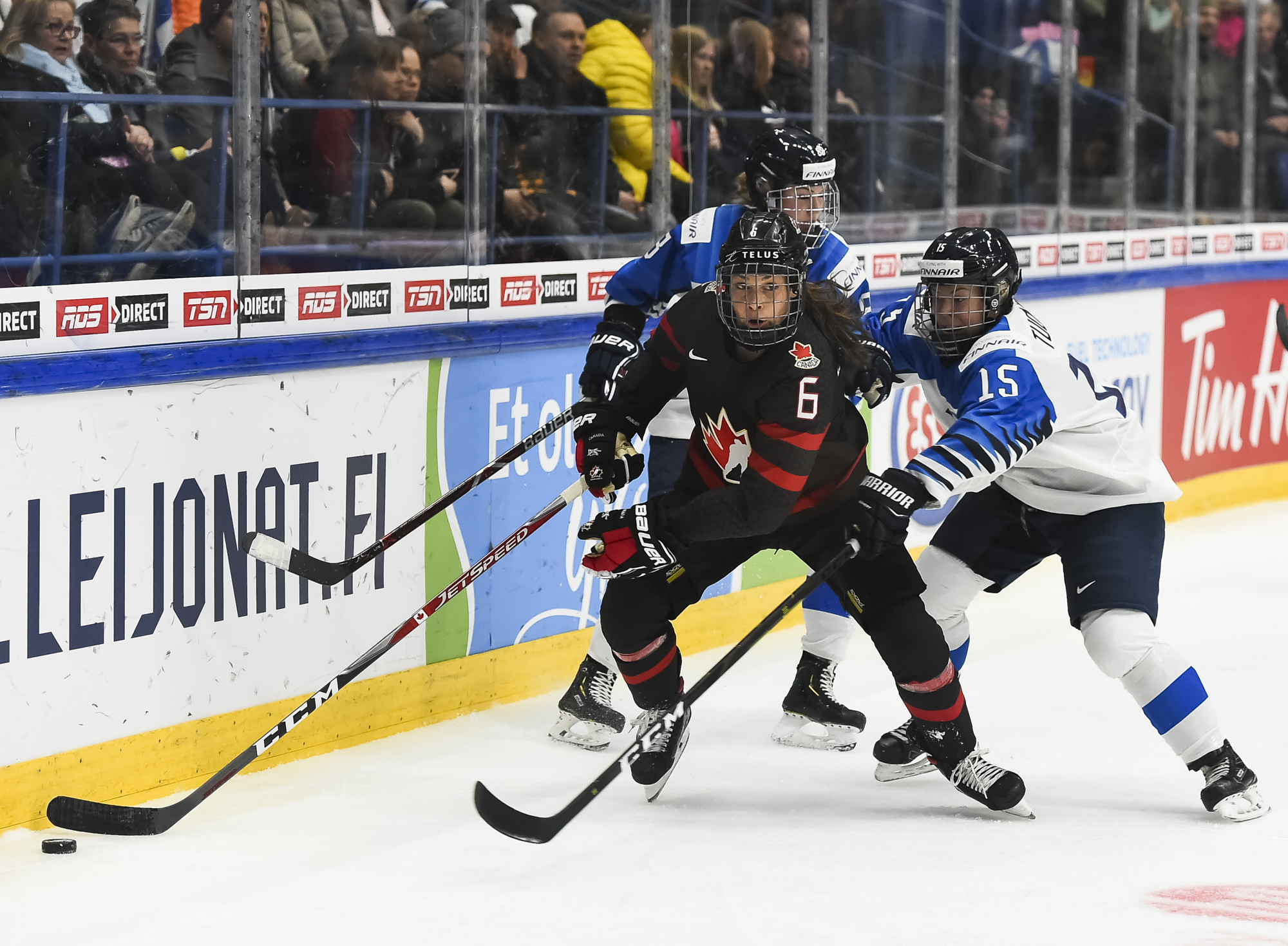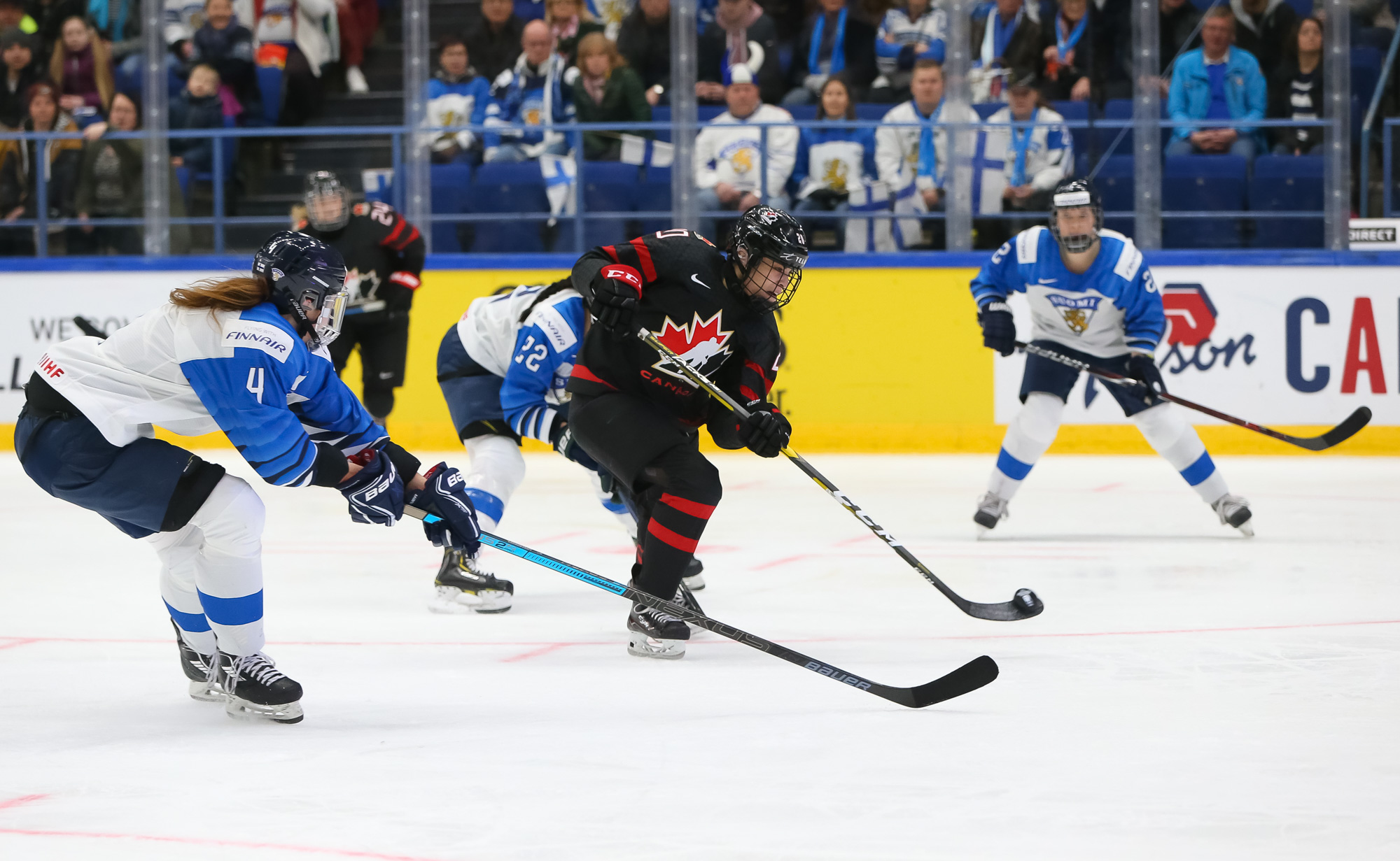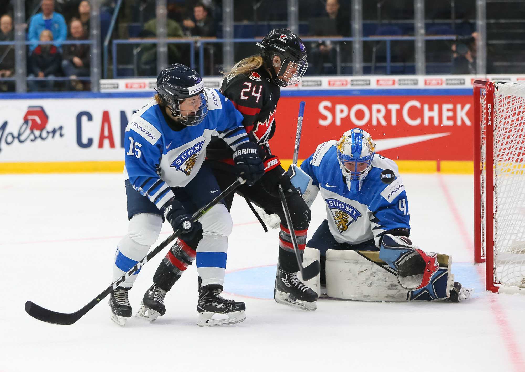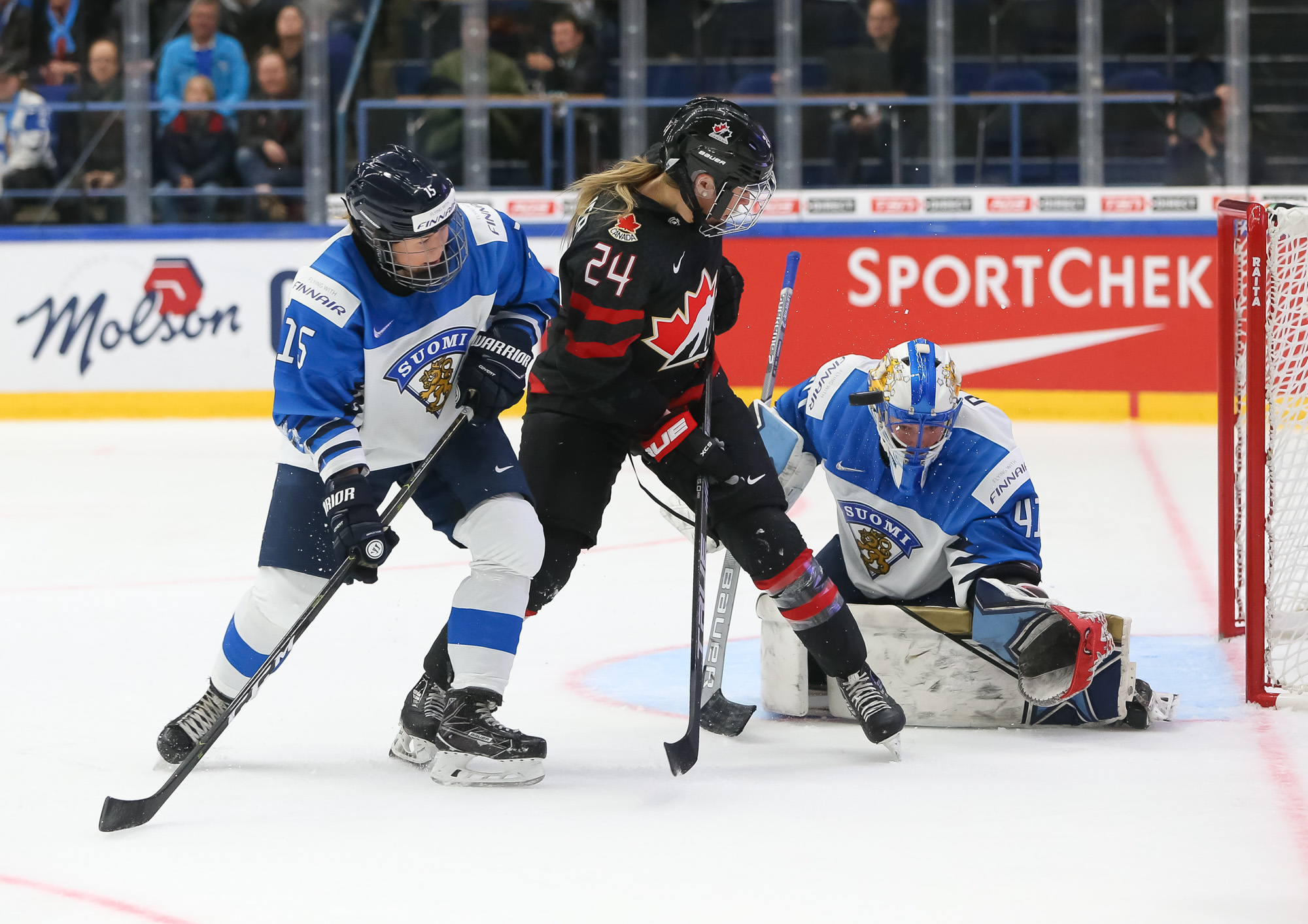 A determined Canadian effort stymied the first Finnish power play with Natalie Spooner off for hooking, as the Finns exerted great pressure.