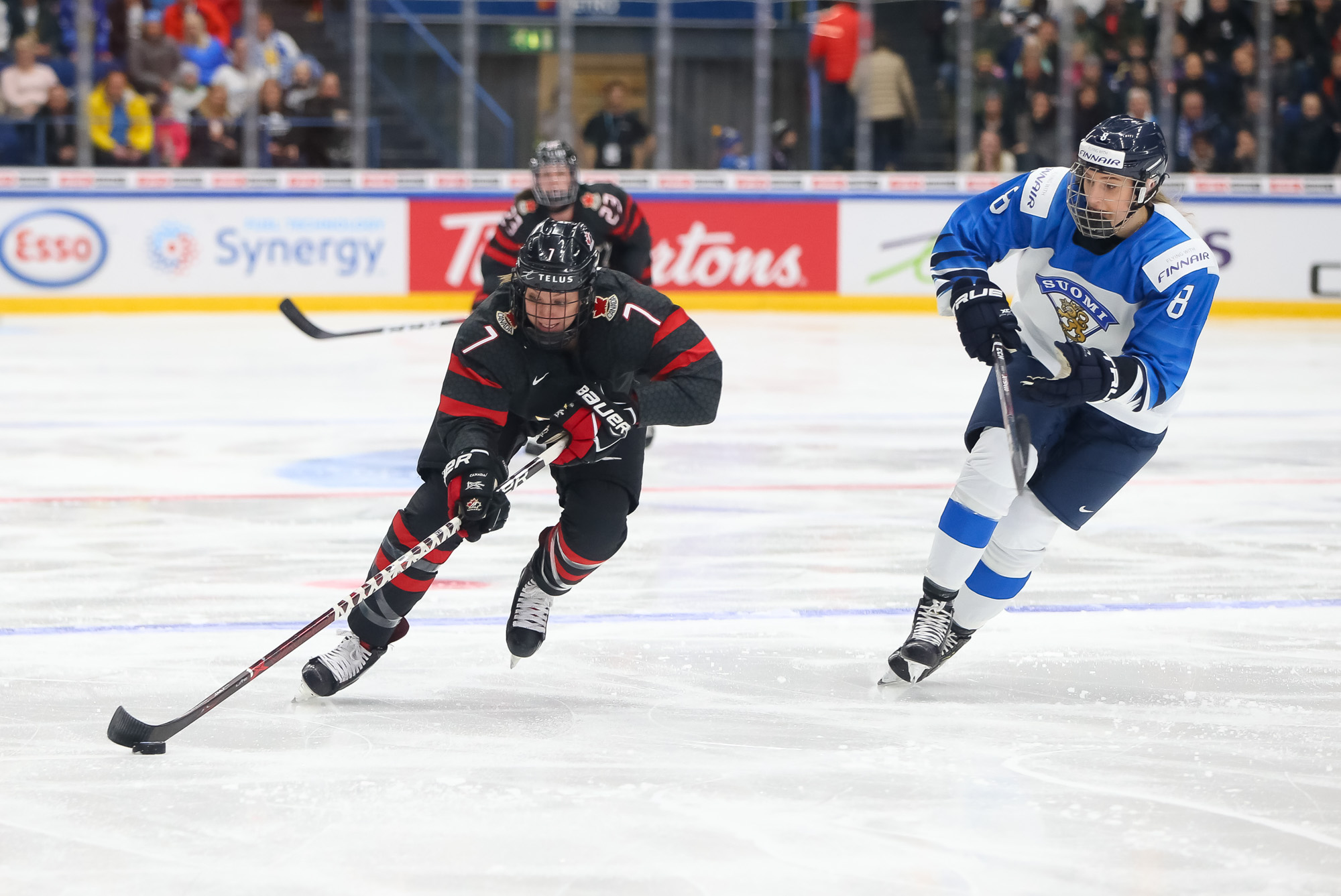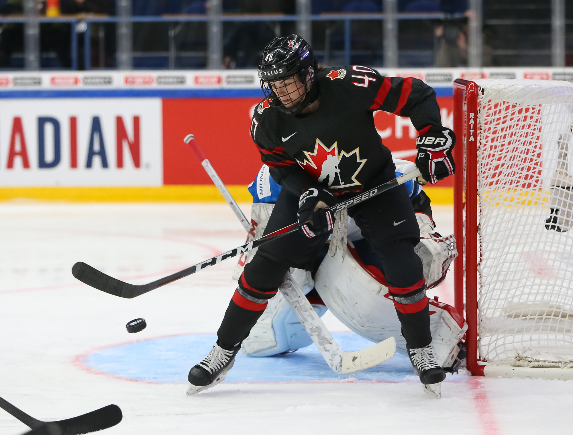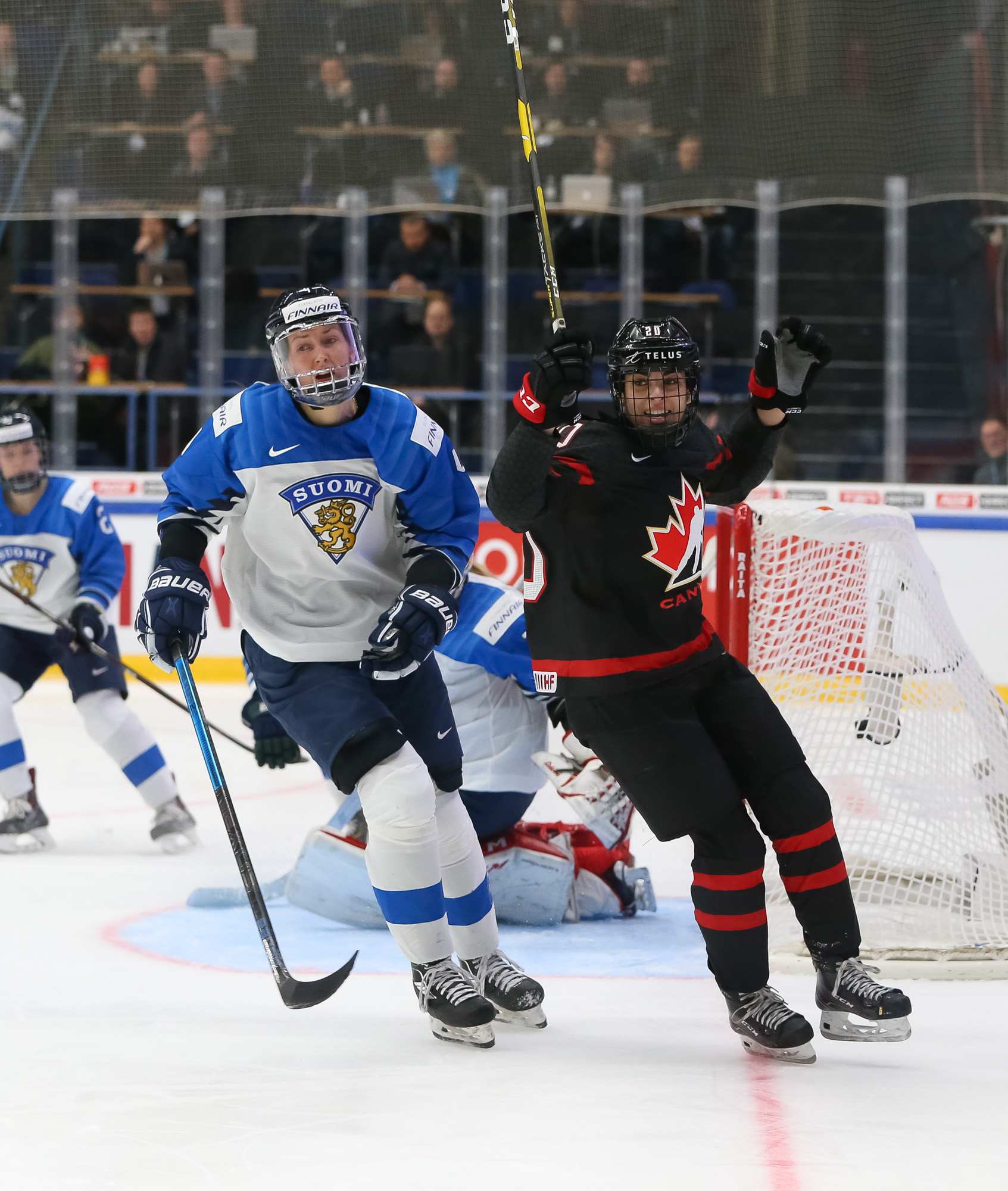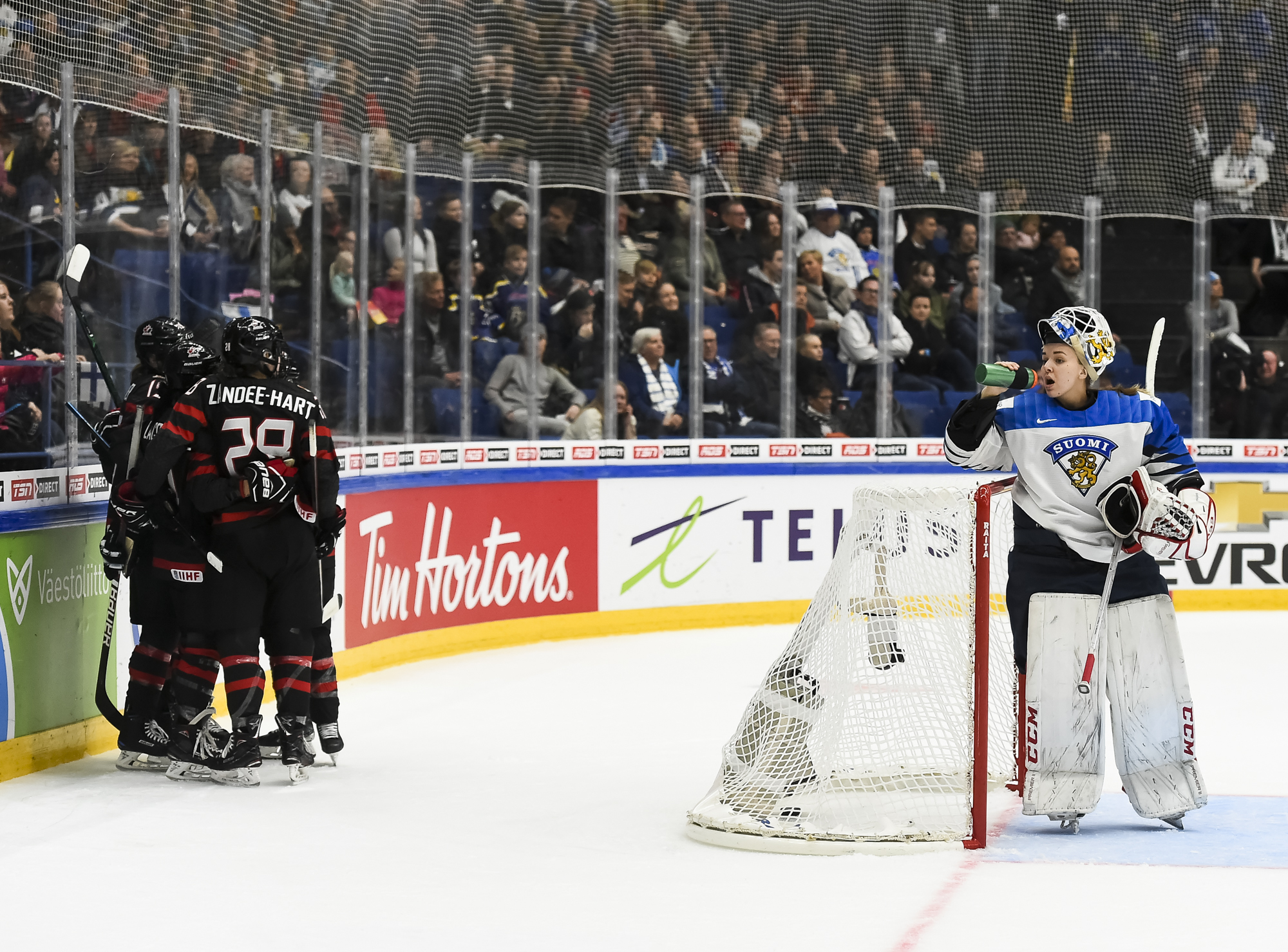 This much-anticipated evening matchup at Metro Areena started out as a showcase of arguably the world’s two best goalies in Finland’s Noora Raty, a 2018 Olympic all-star, and Canada’s Shannon Szabados, a two-time Olympic gold medalist. However, Raty, apparently ailing, exited the game just after the midpoint with Canada up 3-0. The Canadians outshot Finland 49-23.