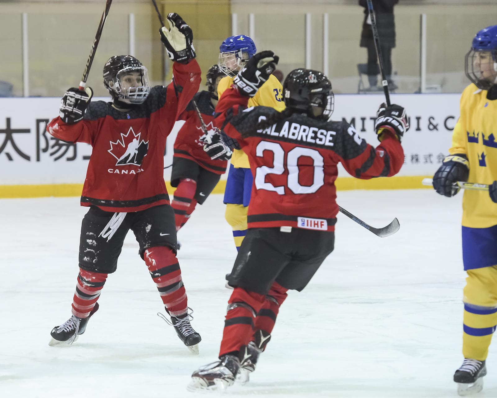 Canada opened the scoring at 11:38 of the first period when Nicole Gosling’s point shot was nicely redirected by Daniella Calabrese past Tindra Holm in goal.