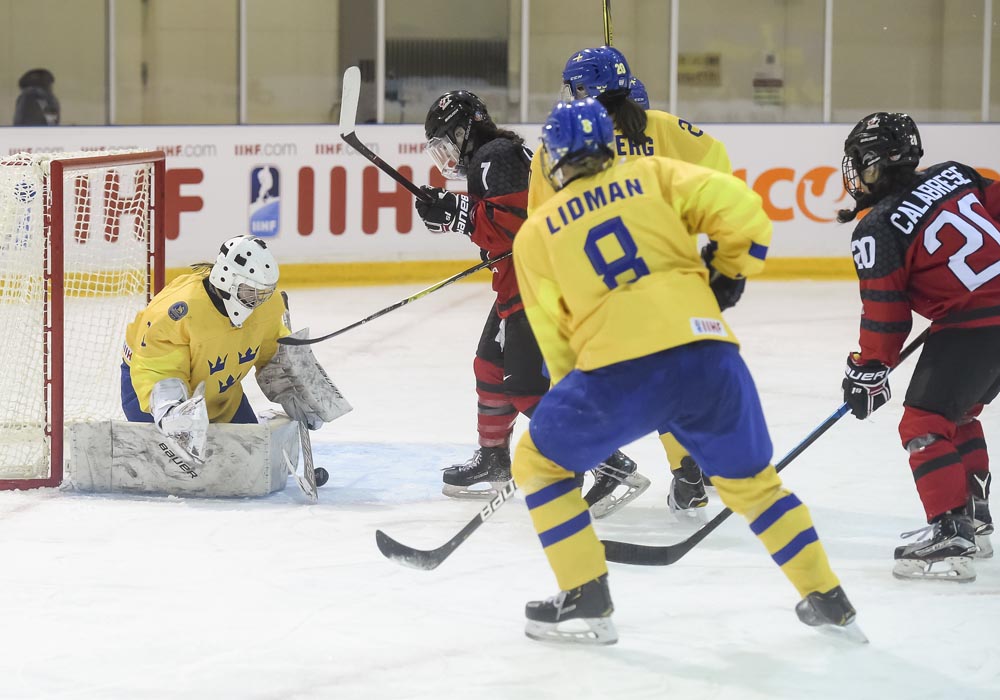 Three minutes later, though, the Swedes responded in kind. Gabriella Johansson corralled a loose puck and snapped a quick shot that got by a screened Mahika Sarrazin.